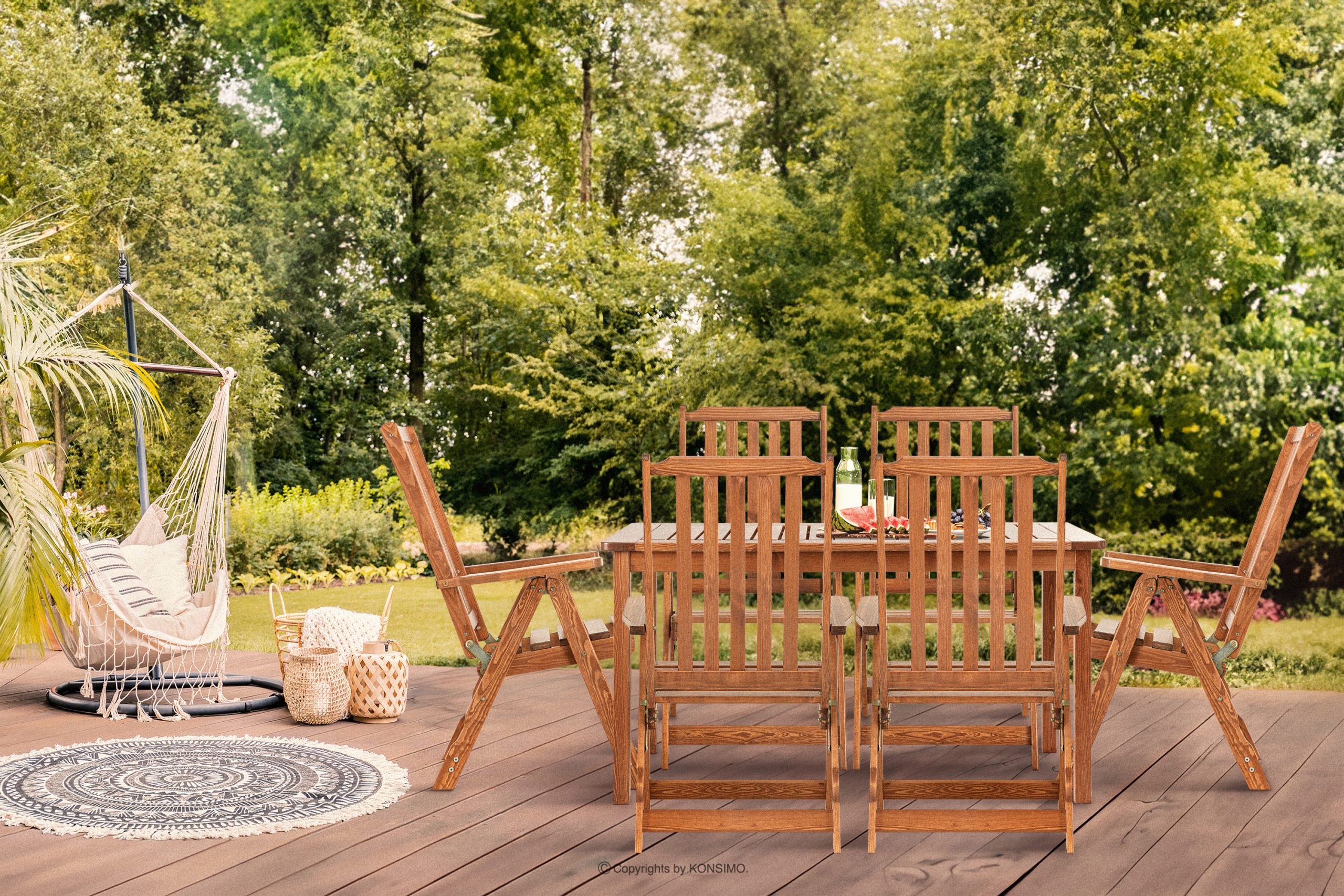 Záhradná súprava stola a stoličiek pre 6 osôb pomôže vytvoriť dokonalé miesto na rodinné stretnutia, večierky s priateľmi a každodenné letné večere pod holým nebom. Rám nábytku je vyrobený z kvalitného borovicového dreva, ktoré bolo starostlivo farebne impregnované, čo mu dodáva nielen trvanlivosť a odolnosť voči poveternostným vplyvom, ale aj jedinečný, teplý odtieň.