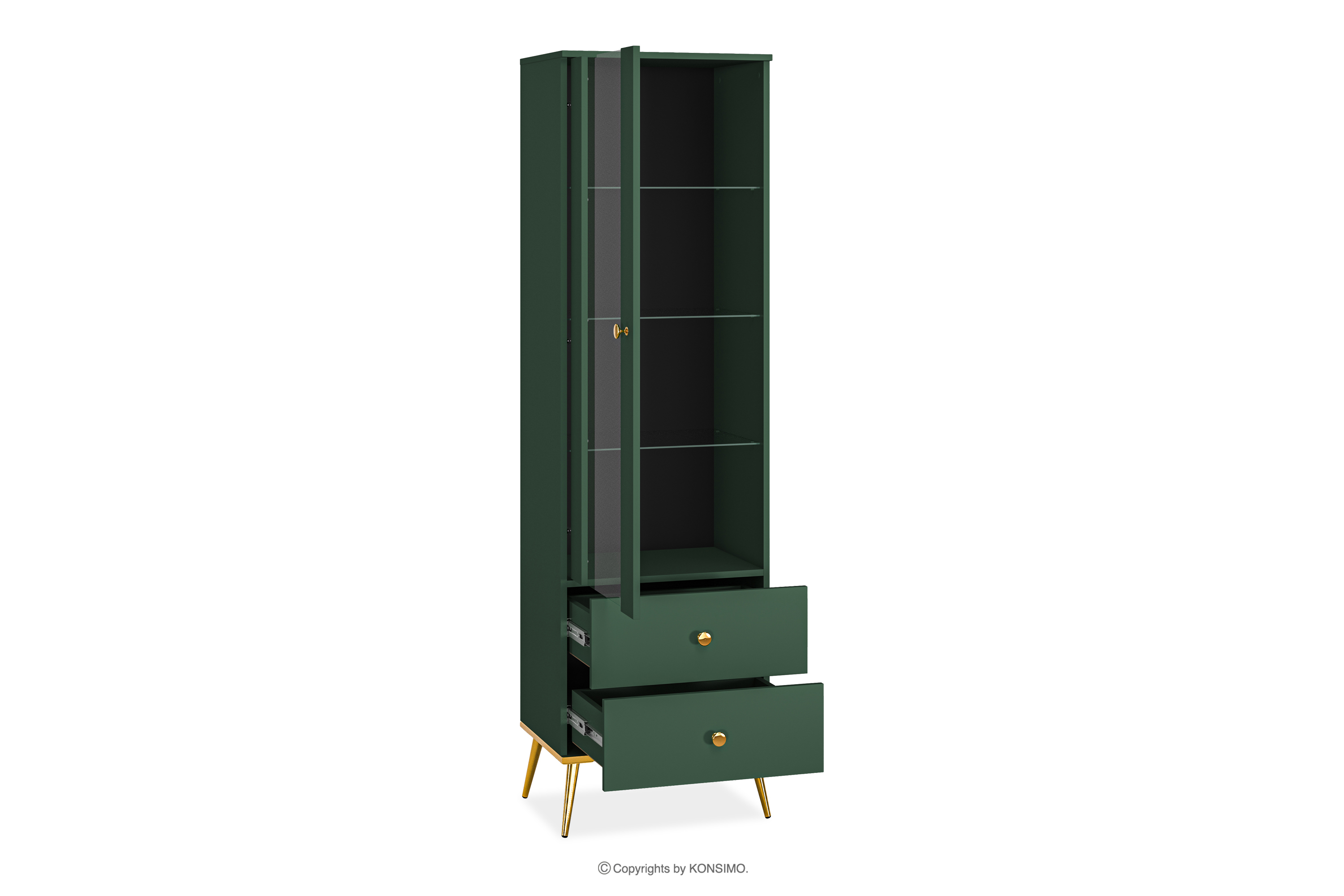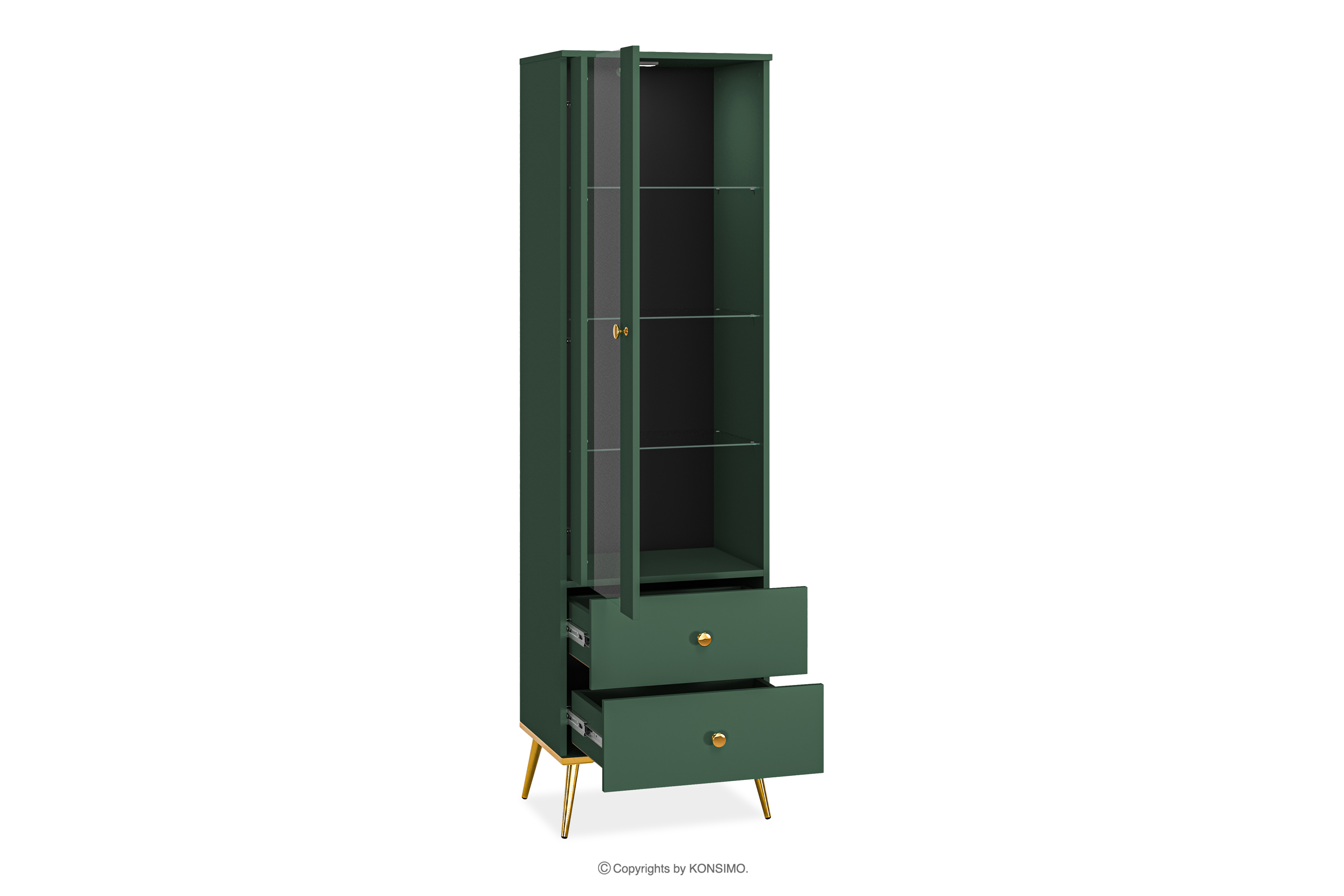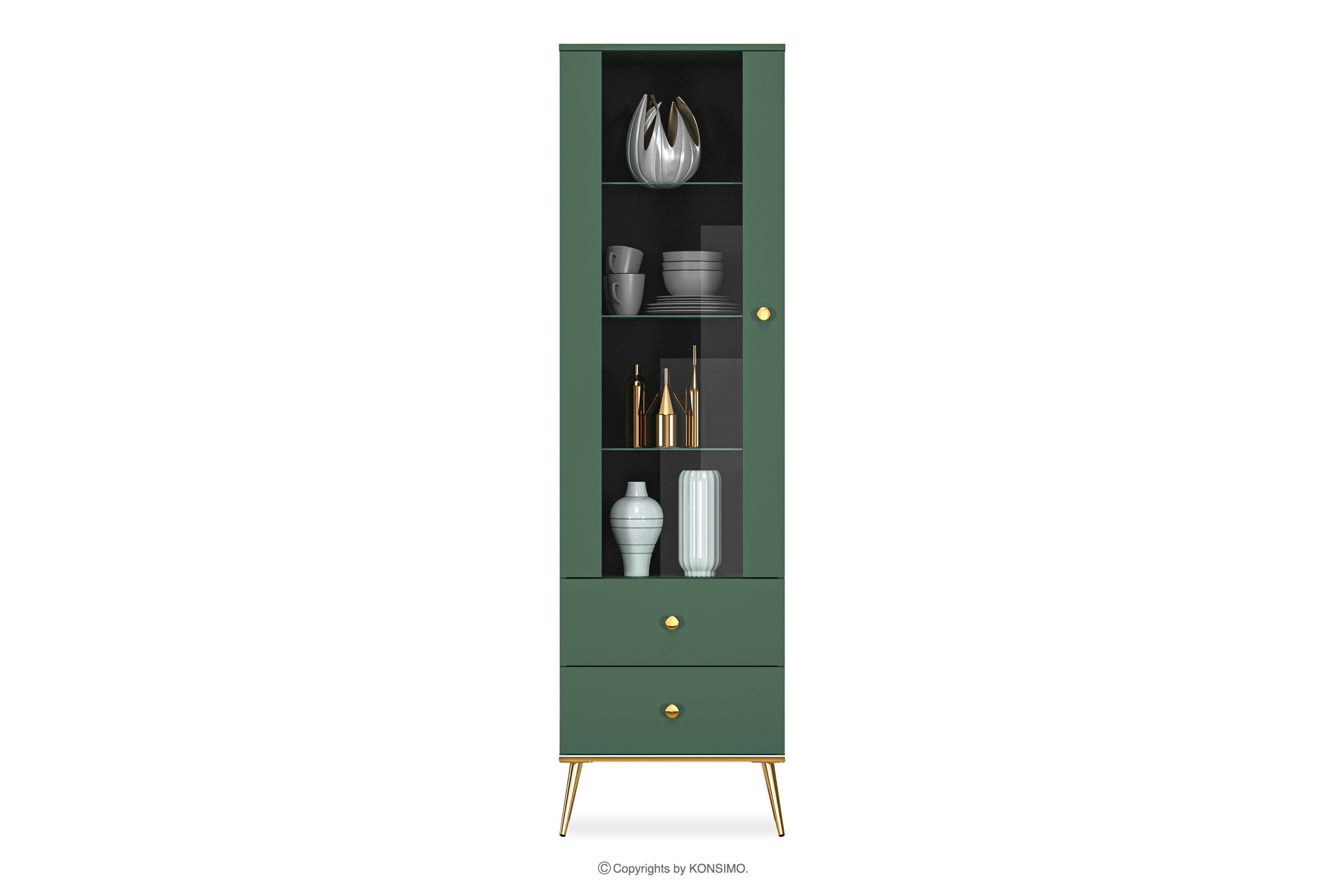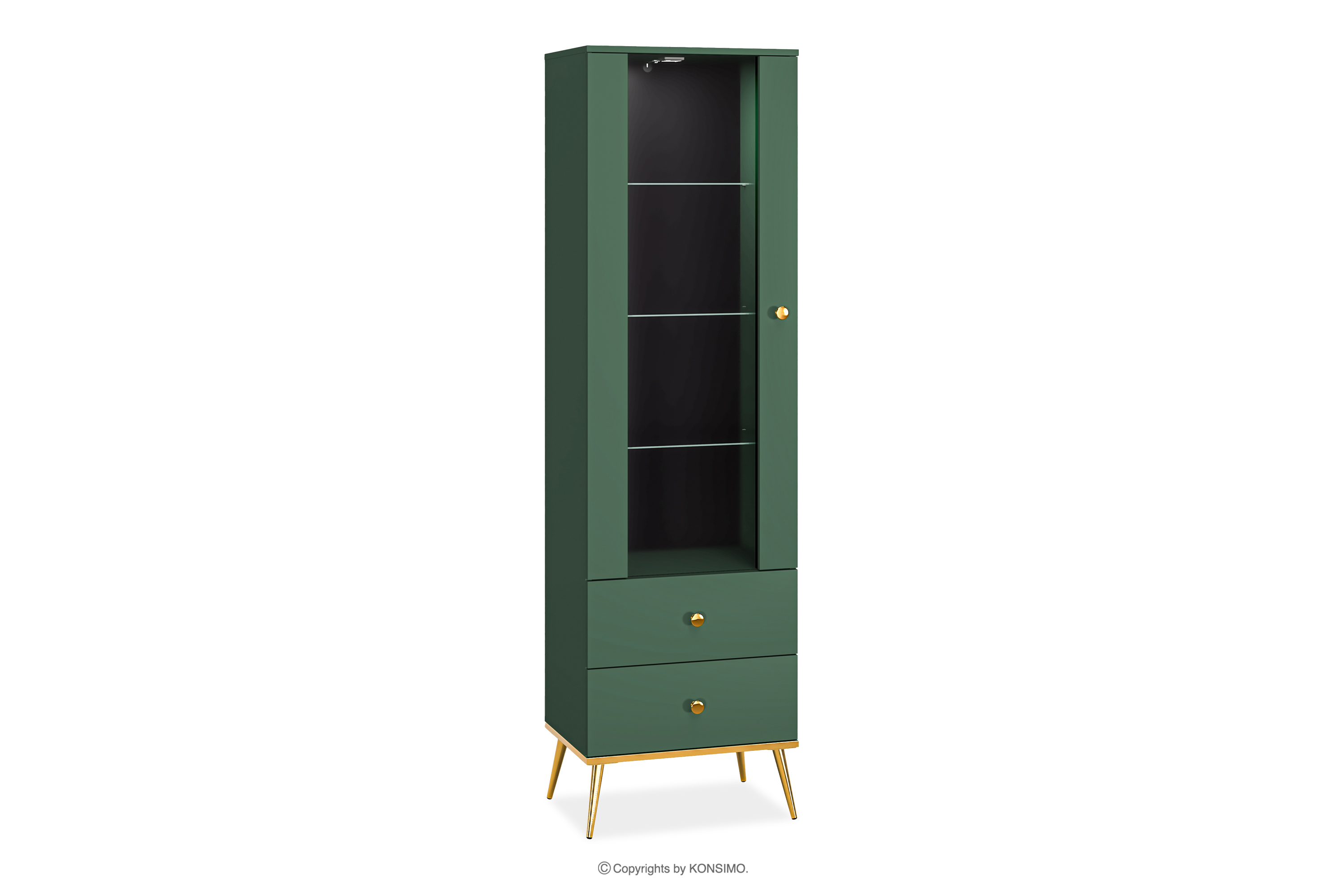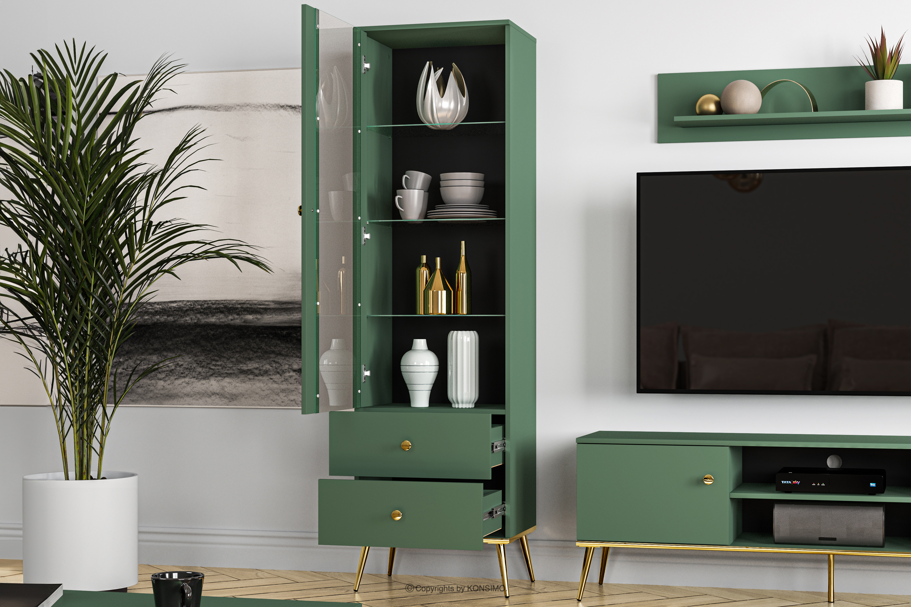 Vysoká zelená vitrína na zlatých nožičkách vnesie do vášho interiéru nádych elegancie. Korpus z laminovaných dosiek je určený pre milovníkov elegantného štýlu aj pevnosti a poskytuje pevný základ pre každú miestnosť. Zlaté zúžené nohy a úchyty sú ako čerešnička na torte. A to ešte nie je všetko! ABS hrany sú nielen elegantným detailom, ale aj zárukou proti poškodeniu a vlhkosti, vďaka čomu je nábytok nielen efektný, ale aj ľahko udržiavateľný v čistote.