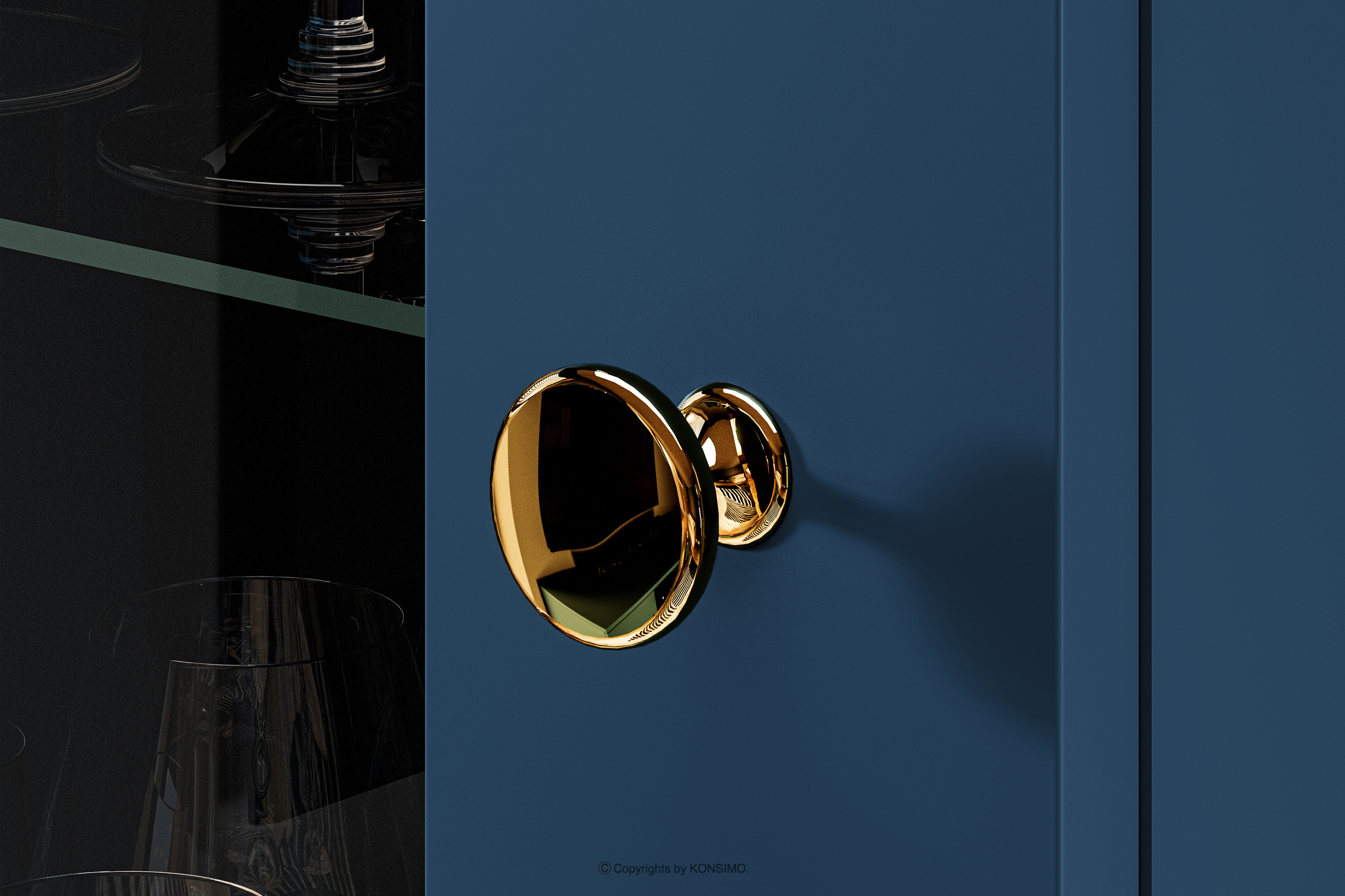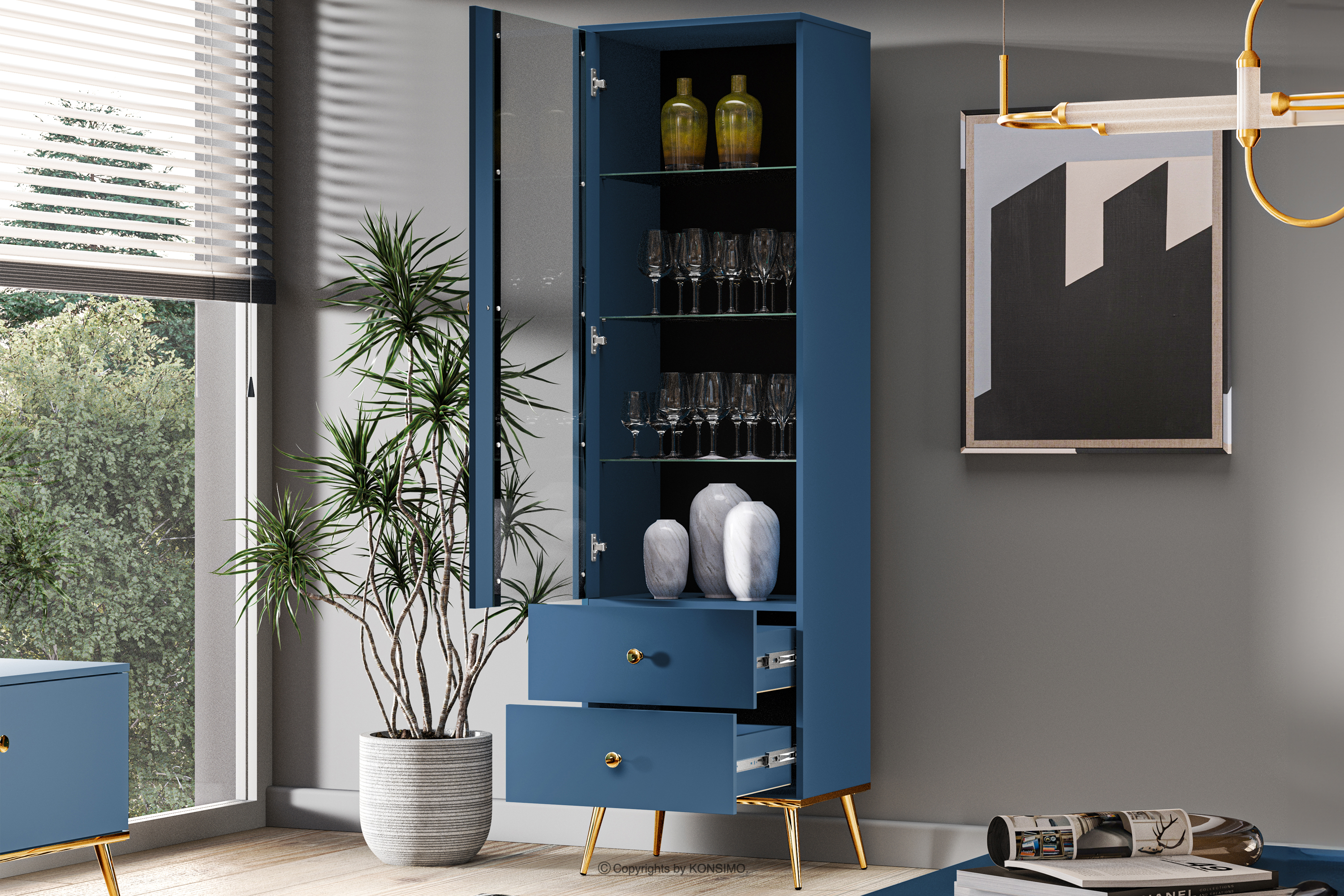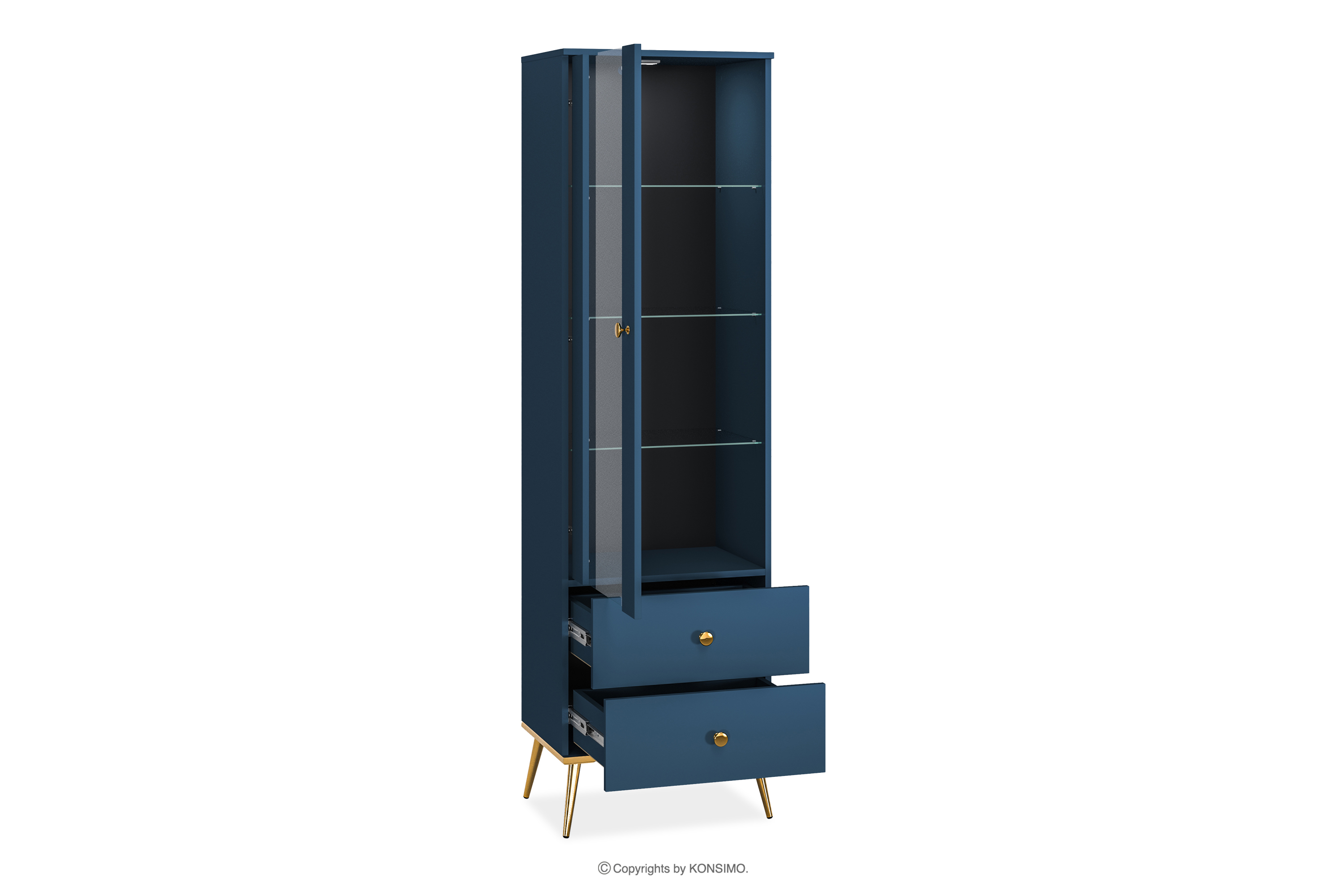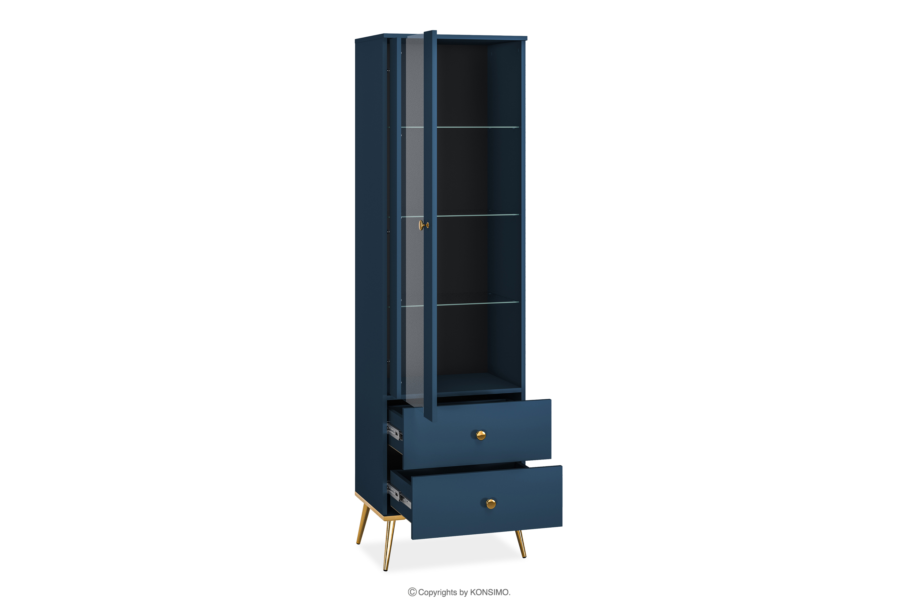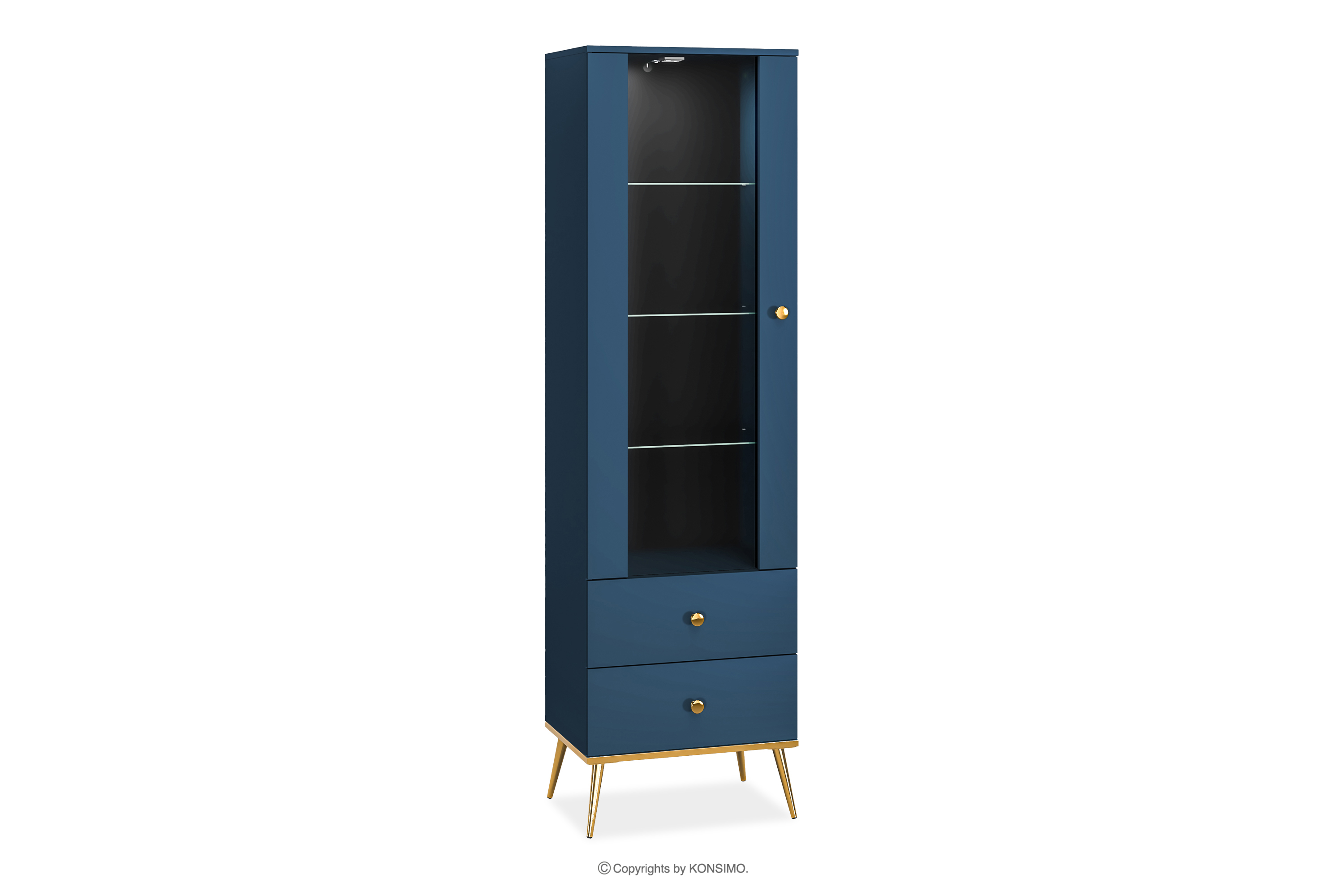 Tmavomodrá vitrína na vysokých zlatých nožičkách vnesie do vášho interiéru nádych elegancie. Korpus z laminovaných dosiek určený pre milovníkov elegantného štýlu aj pevnosti poskytuje pevný základ pre každú miestnosť. Zlaté zúžené nohy a úchyty sú ako čerešnička na torte. A to ešte nie je všetko! ABS hrany sú nielen elegantným detailom, ale aj zárukou proti poškodeniu a vlhkosti, vďaka čomu je nábytok nielen efektný, ale aj ľahko udržiavateľný v čistote.
