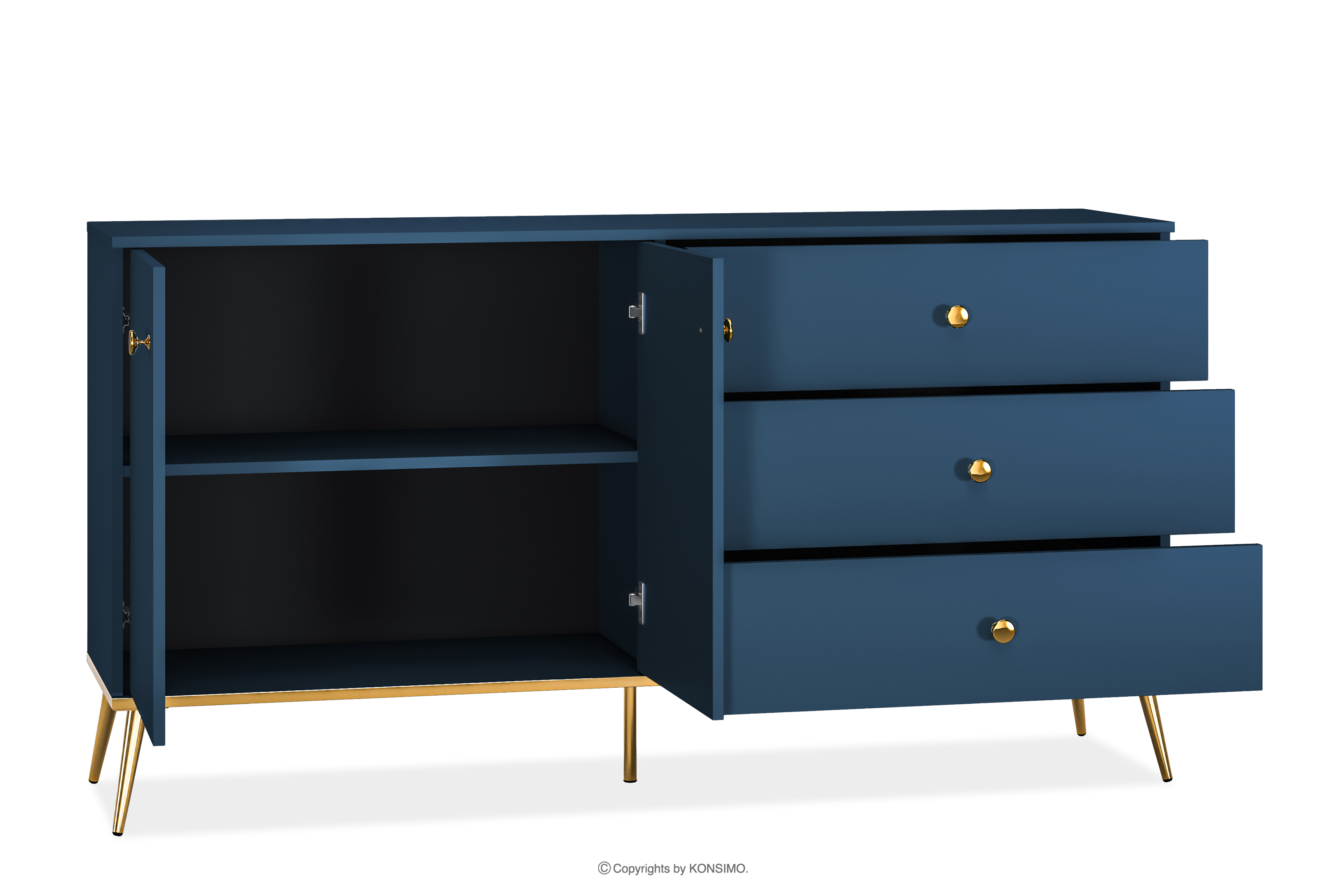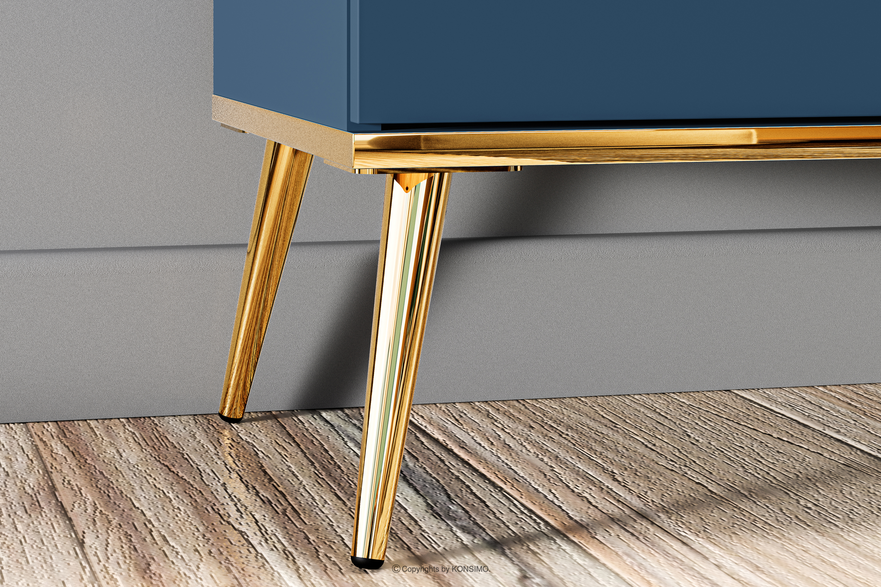 Široká tmavomodrá komoda na vysokých zlatých nohách vnesie do vášho interiéru nádych elegancie. Korpus z laminovaných dosiek určený pre milovníkov elegantného štýlu aj pevnosti poskytuje pevný základ pre každú miestnosť. Zlaté zúžené nohy a úchyty sú ako čerešnička na torte. A to ešte nie je všetko! Hrana ABS je nielen elegantným detailom, ale aj zárukou proti poškodeniu a vlhkosti, vďaka čomu je nábytok nielen efektný, ale aj ľahko sa čistí.