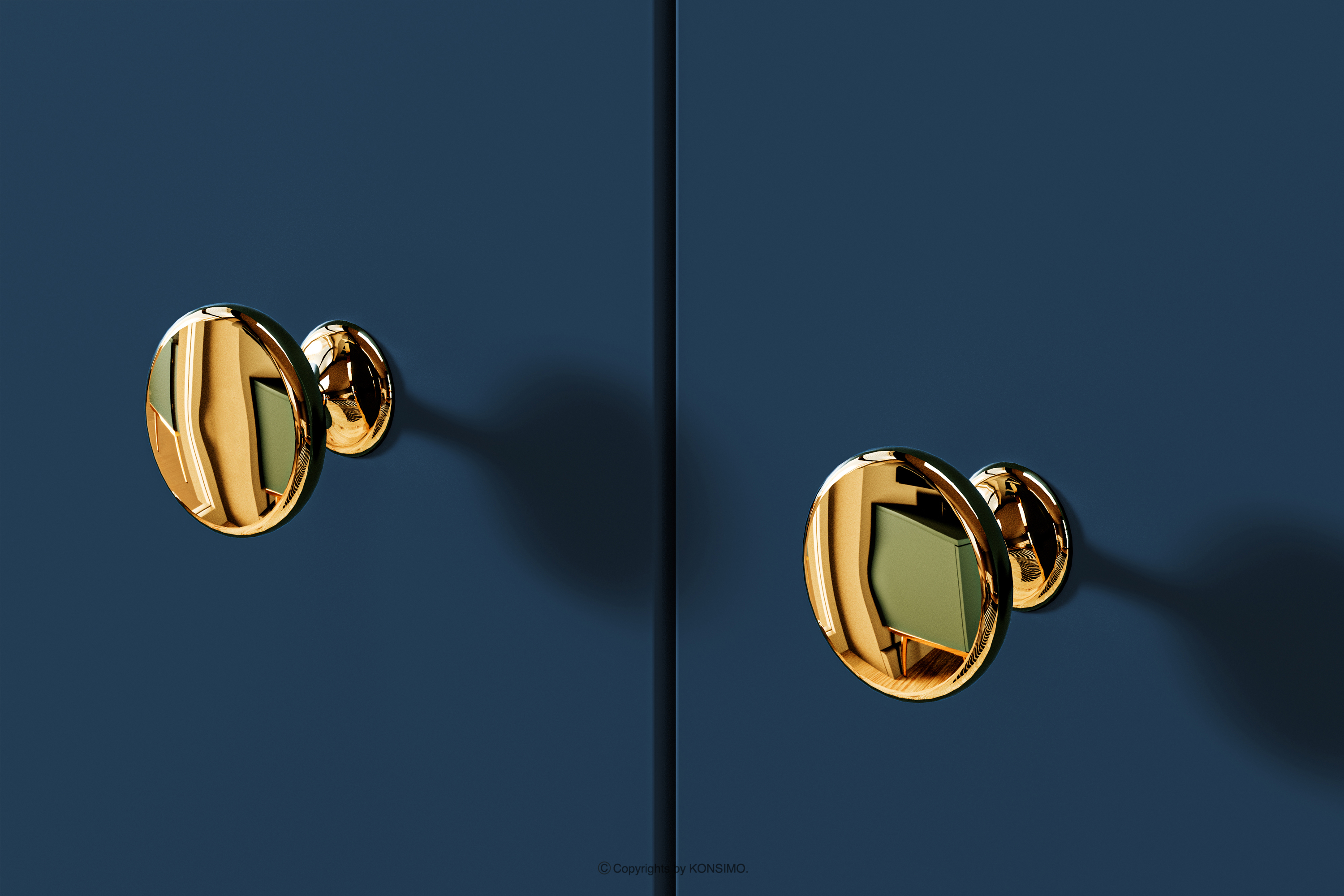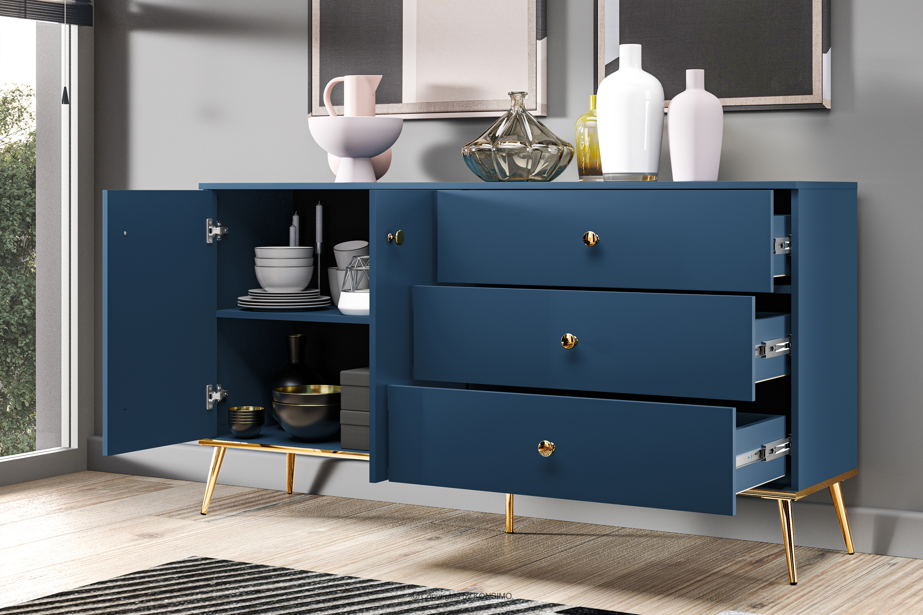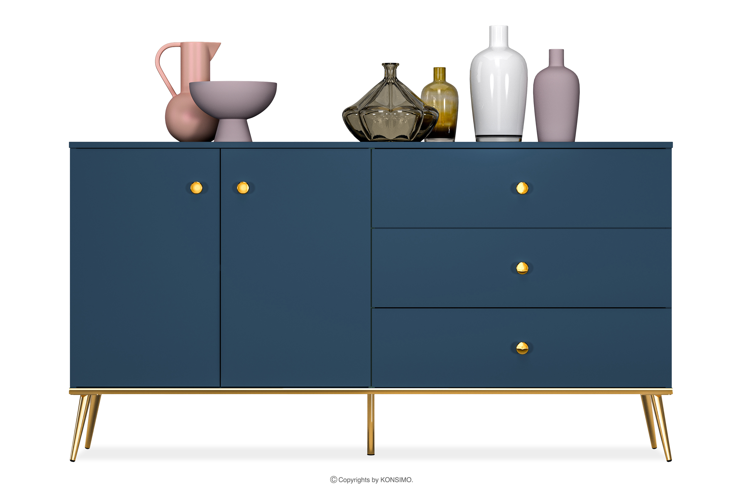 ARICIA Objav celú kolekciu Široká tmavomodrá komoda na vysokých zlatých nohách- farba námornícka modrá