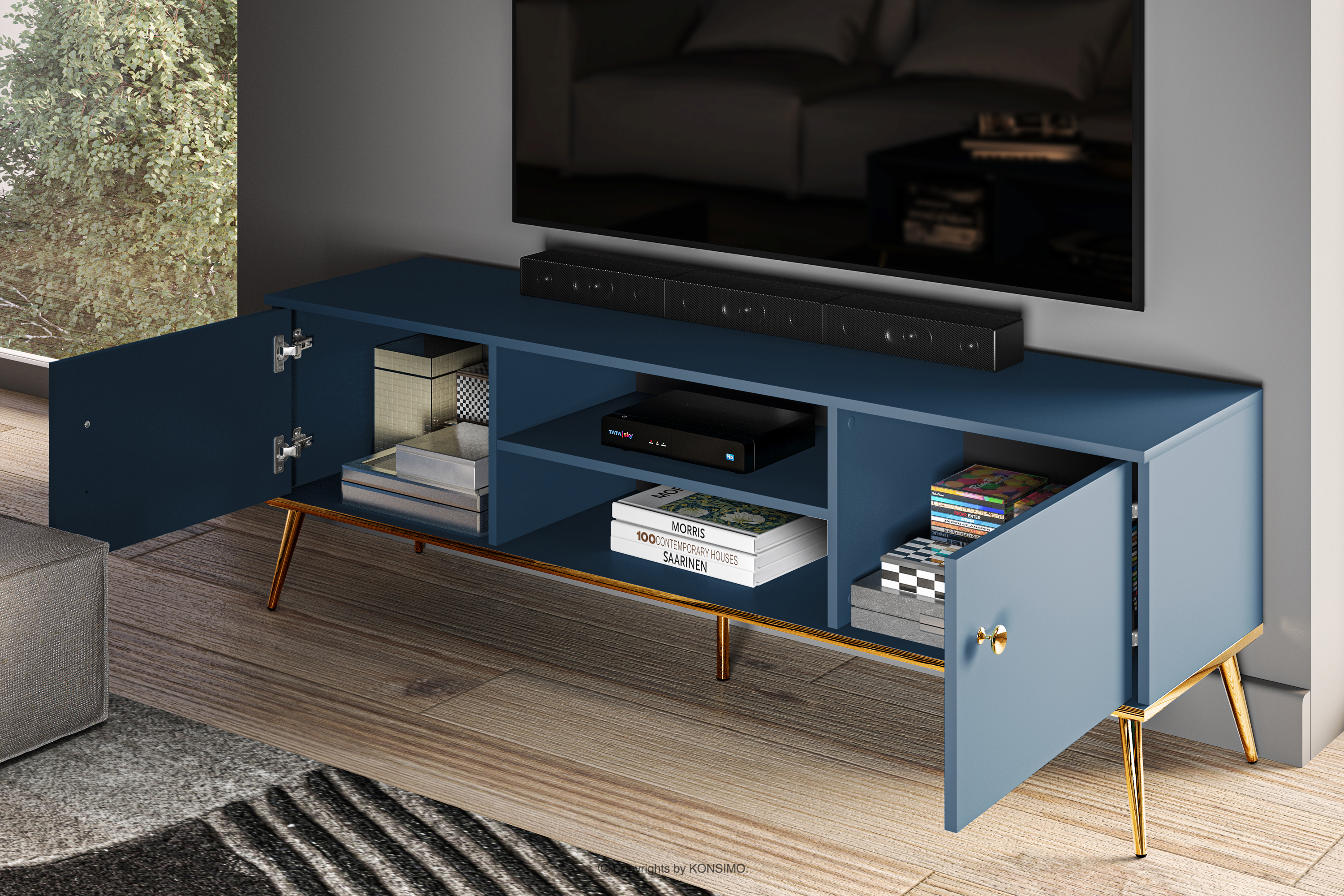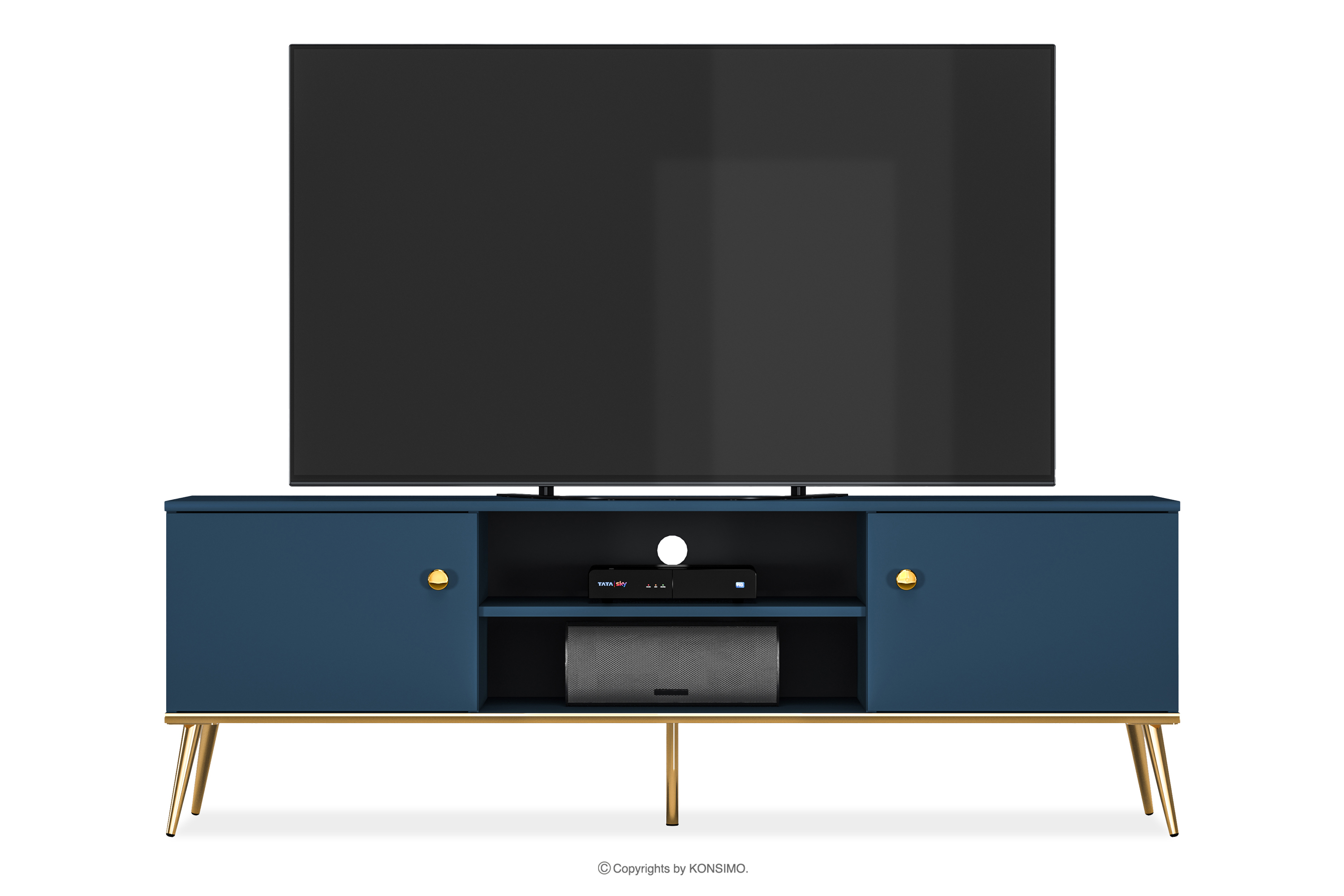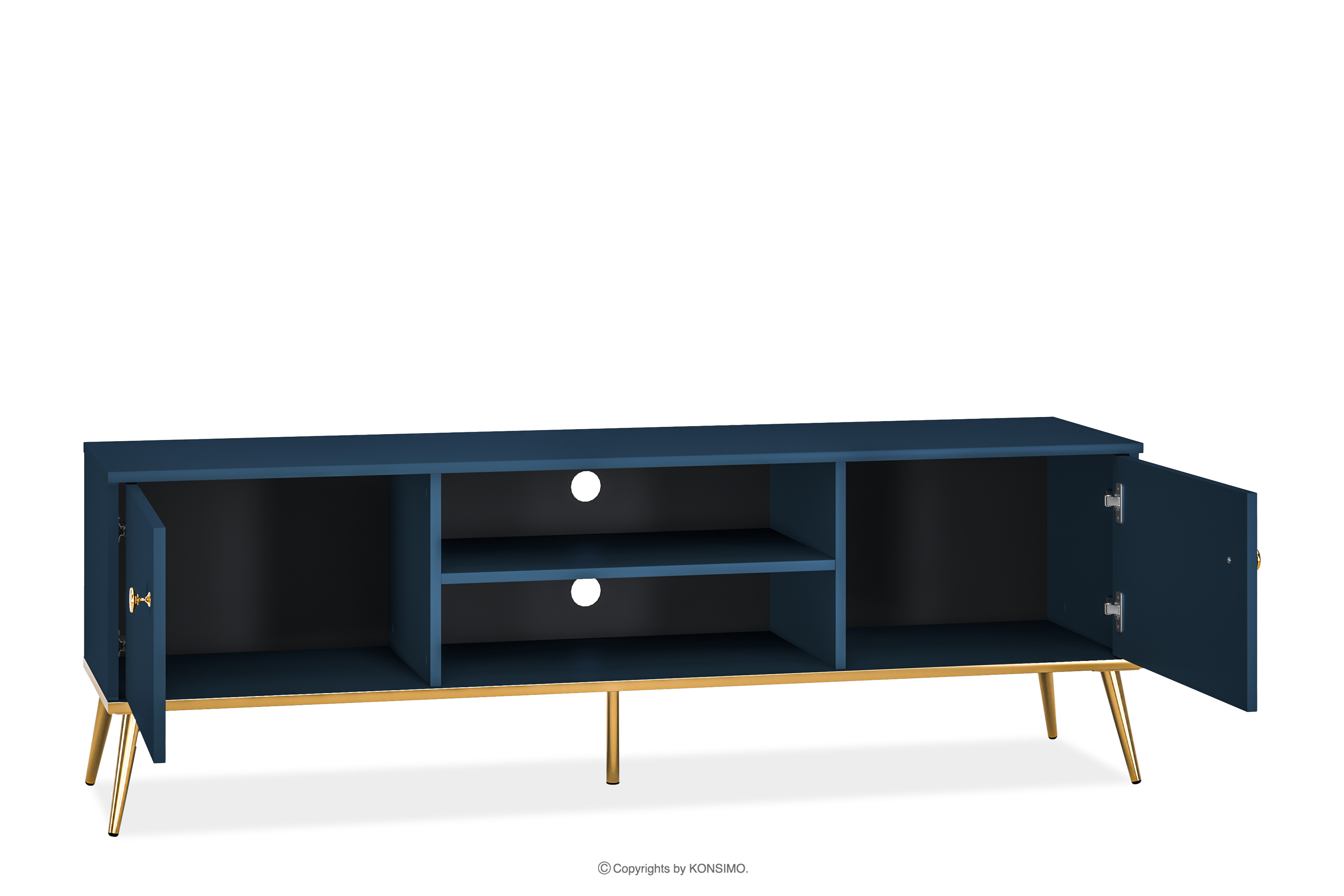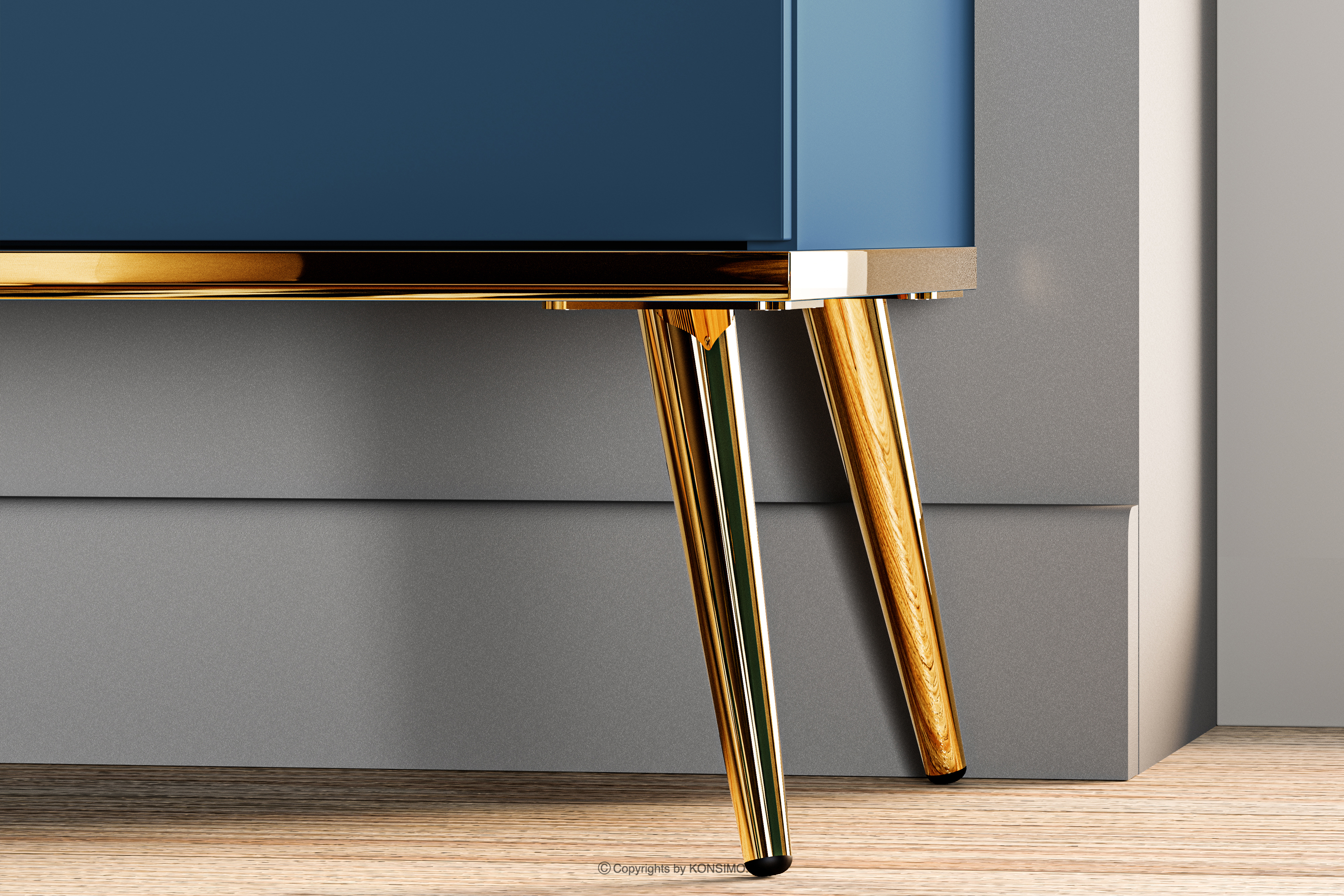 ARICIA Objav celú kolekciu Námornícka modrá skrinka RTV na vysokých zlatých nohách- farba námornícka modrá