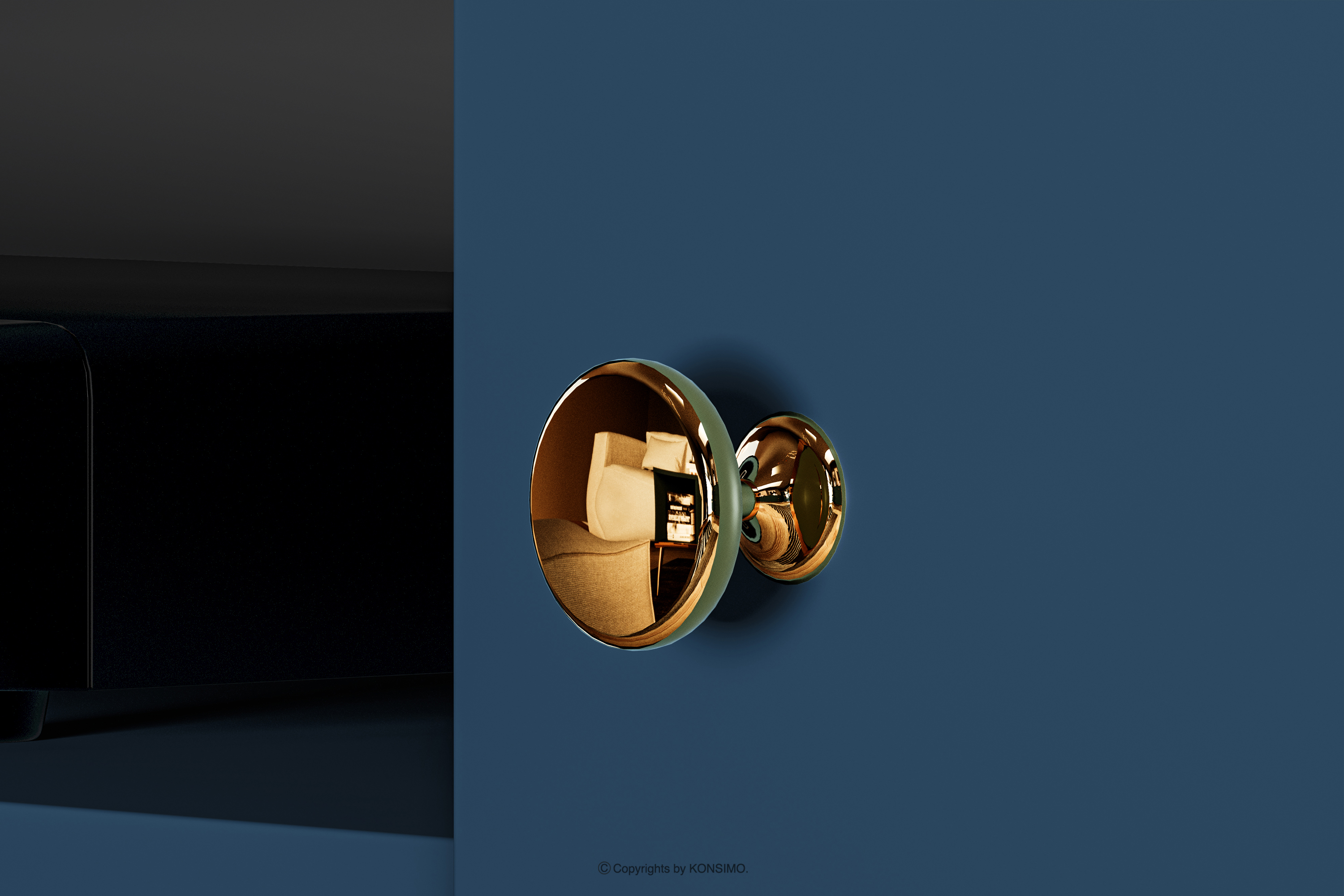 Predná strana z laminovanej dosky nielenže upúta pozornosť svojím vzhľadom, ale zaručuje aj stály vzhľad počas mnohých rokov. Zlaté akcenty v podobe úchytiek a nožičiek nielenže dodávajú šarm, ale aj jemne zdobia tmavomodrý masív. Vďaka pevnej konštrukcii a starostlivej povrchovej úprave nielenže plní svoju funkciu, ale stáva sa aj hlavným protagonistom elegantného usporiadania priestoru. Vďaka závesom s mäkkým zatváraním dvierok je používanie bez námahy a tiché.