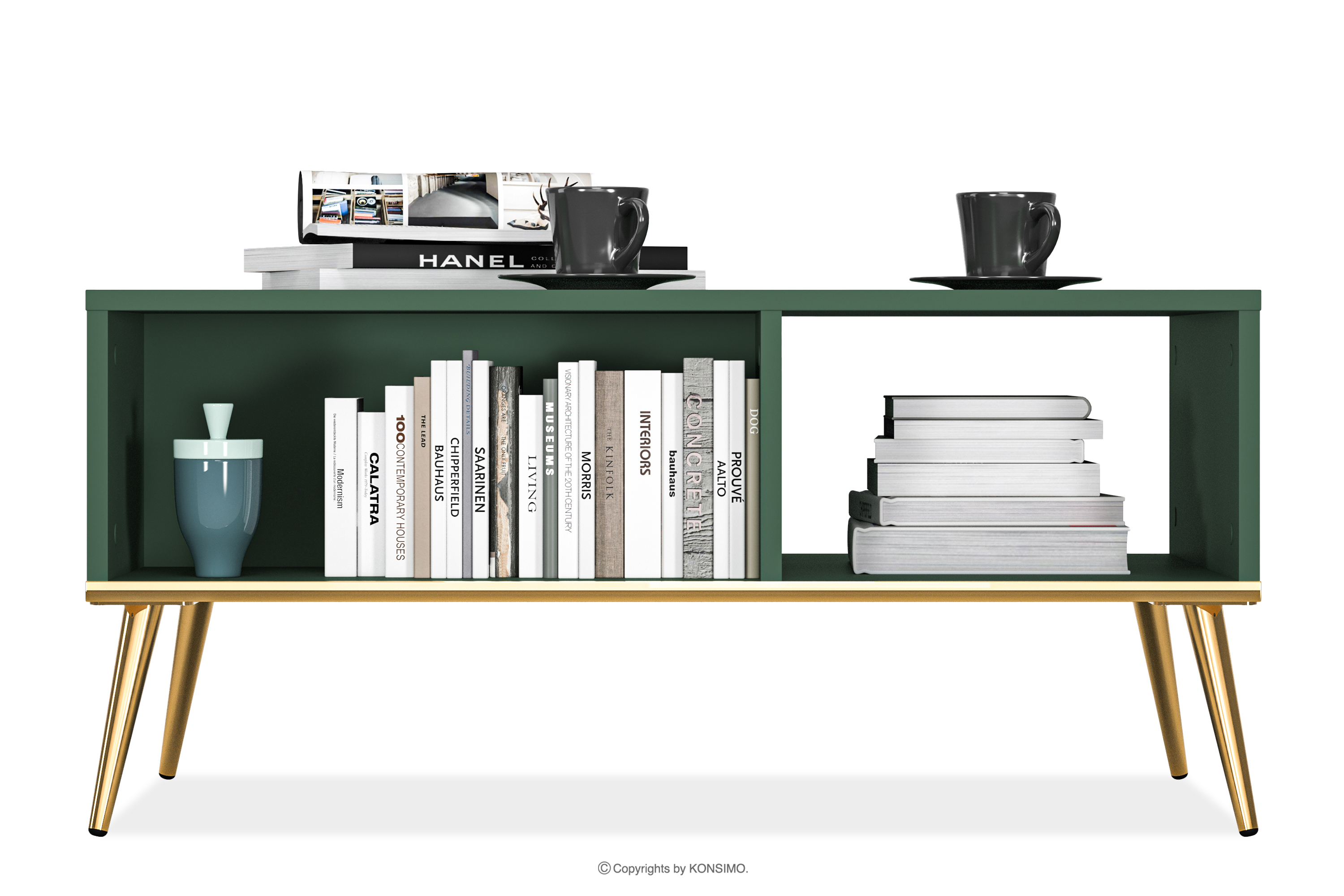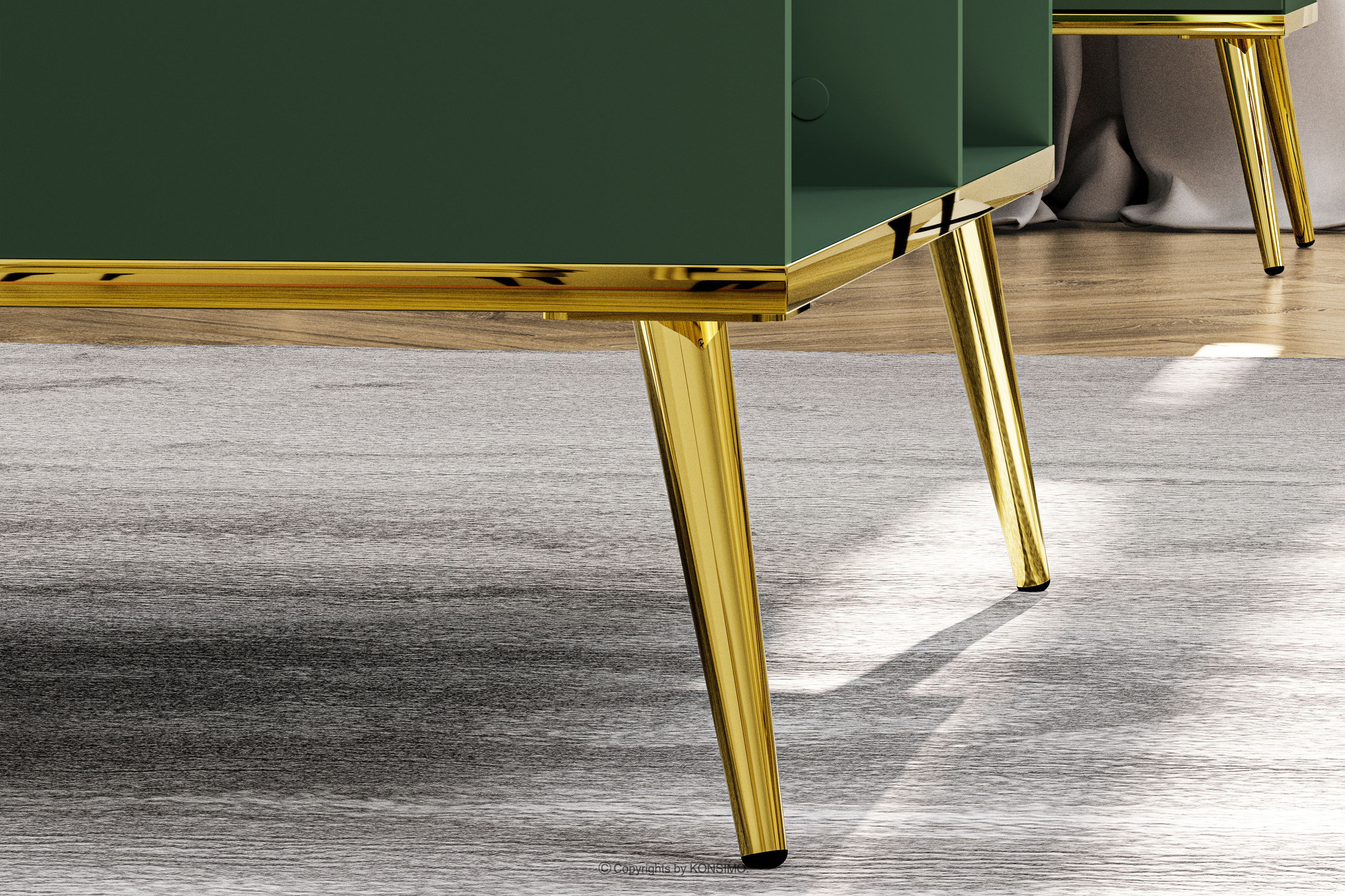 Zelený konferenčný stolík na vysokých zlatých nohách vnesie do vášho interiéru nádych elegancie. Korpus z laminovanej dosky, určený pre milovníkov elegantného štýlu aj robustnosti, poskytuje pevný základ pre každú miestnosť. Zlaté zúžené nohy a úchyty sú ako čerešnička na torte. A to ešte nie je všetko! ABS hrany sú nielen elegantným detailom, ale aj zárukou proti poškodeniu a vlhkosti, vďaka čomu je nábytok nielen efektný, ale aj ľahko čistiteľný.