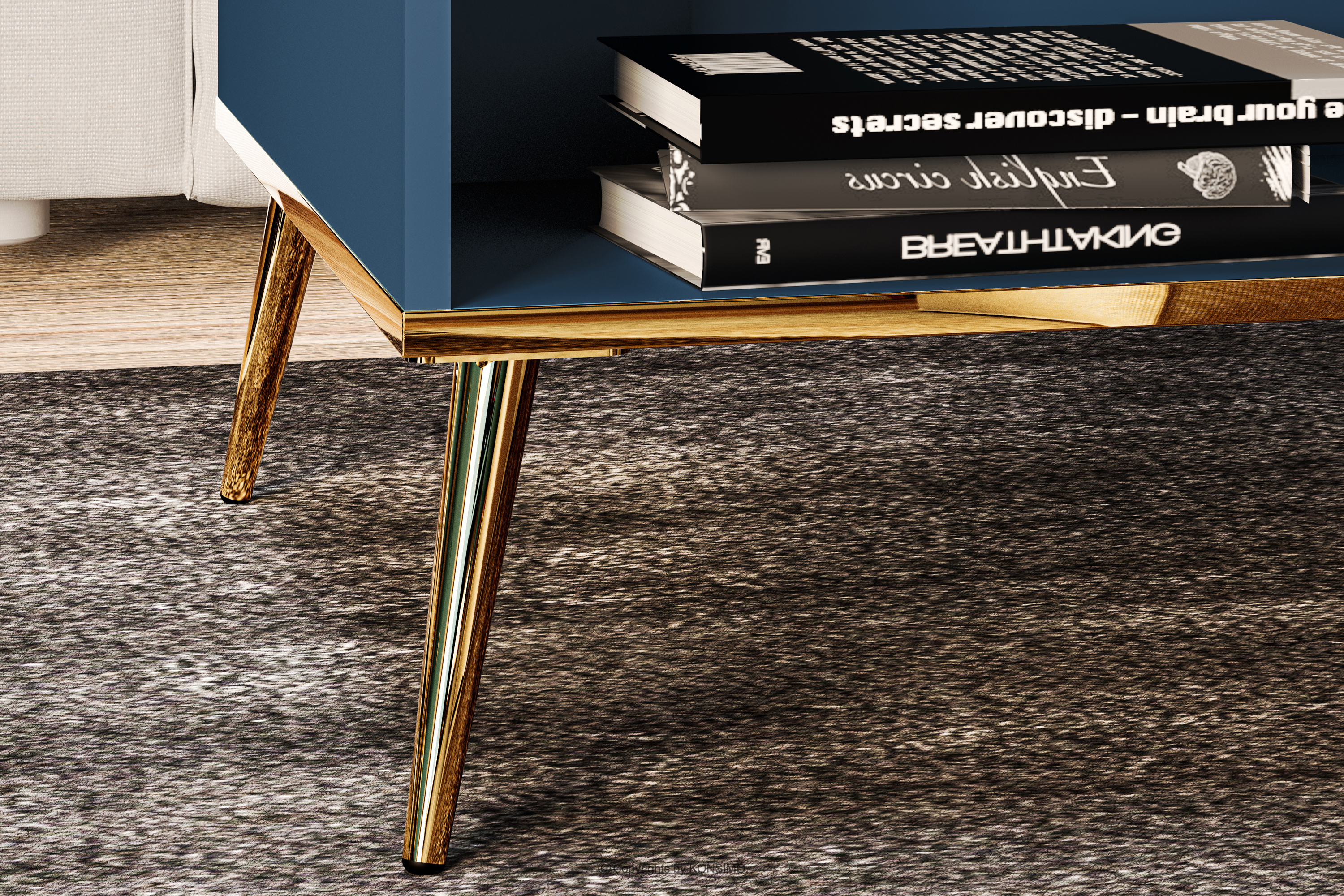 Tmavomodrý konferenčný stolík na vysokých zlatých nohách vnesie do vášho interiéru nádych elegancie. Korpus z laminovanej dosky, určený pre milovníkov elegantného štýlu aj robustnosti, poskytuje pevný základ pre každú miestnosť. Zlaté zúžené nohy a úchyty sú ako čerešnička na torte. A to nie je všetko! Hrana ABS je nielen elegantným detailom, ale aj zárukou proti poškodeniu a vlhkosti, vďaka čomu je nábytok nielen efektný, ale aj ľahko sa čistí.