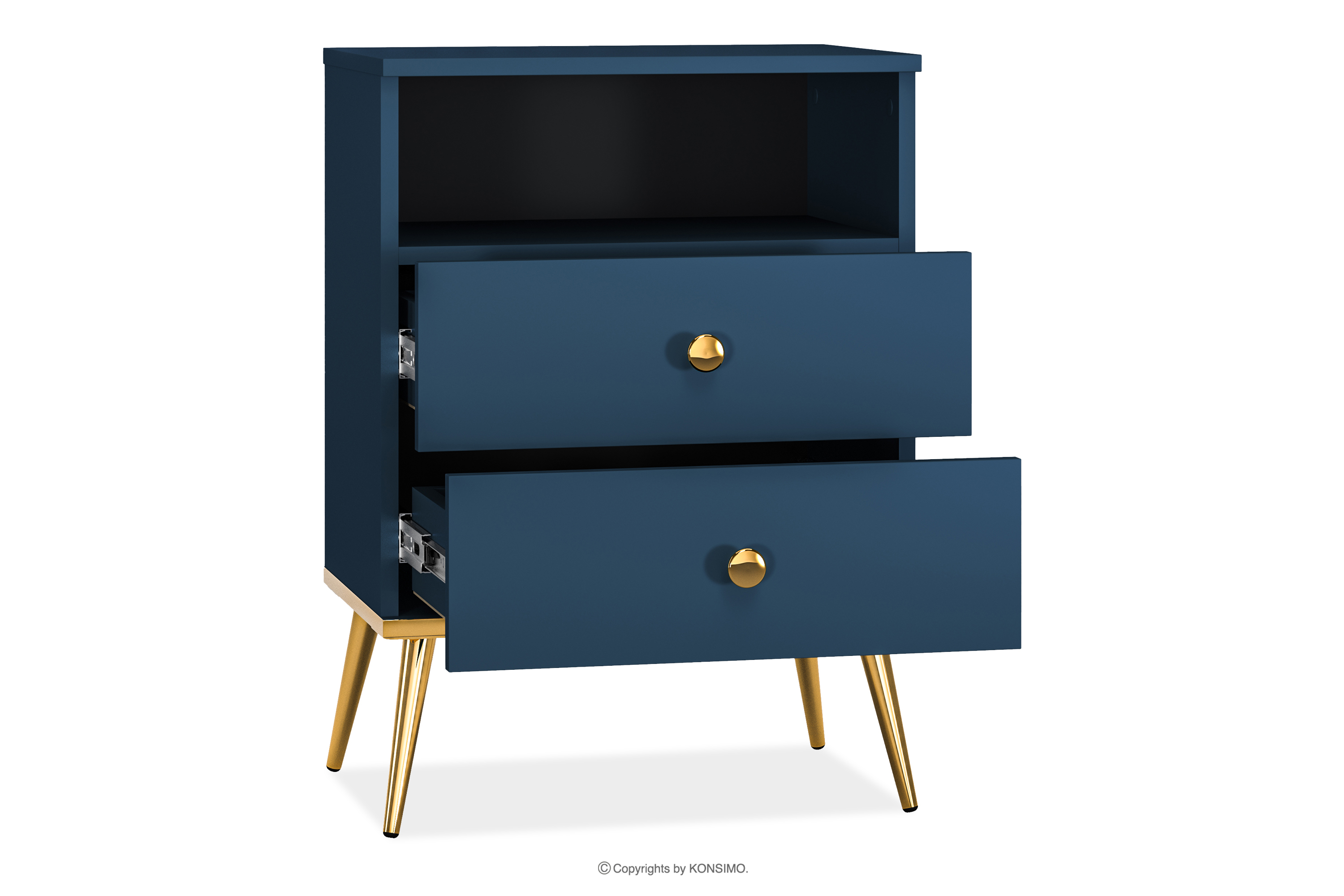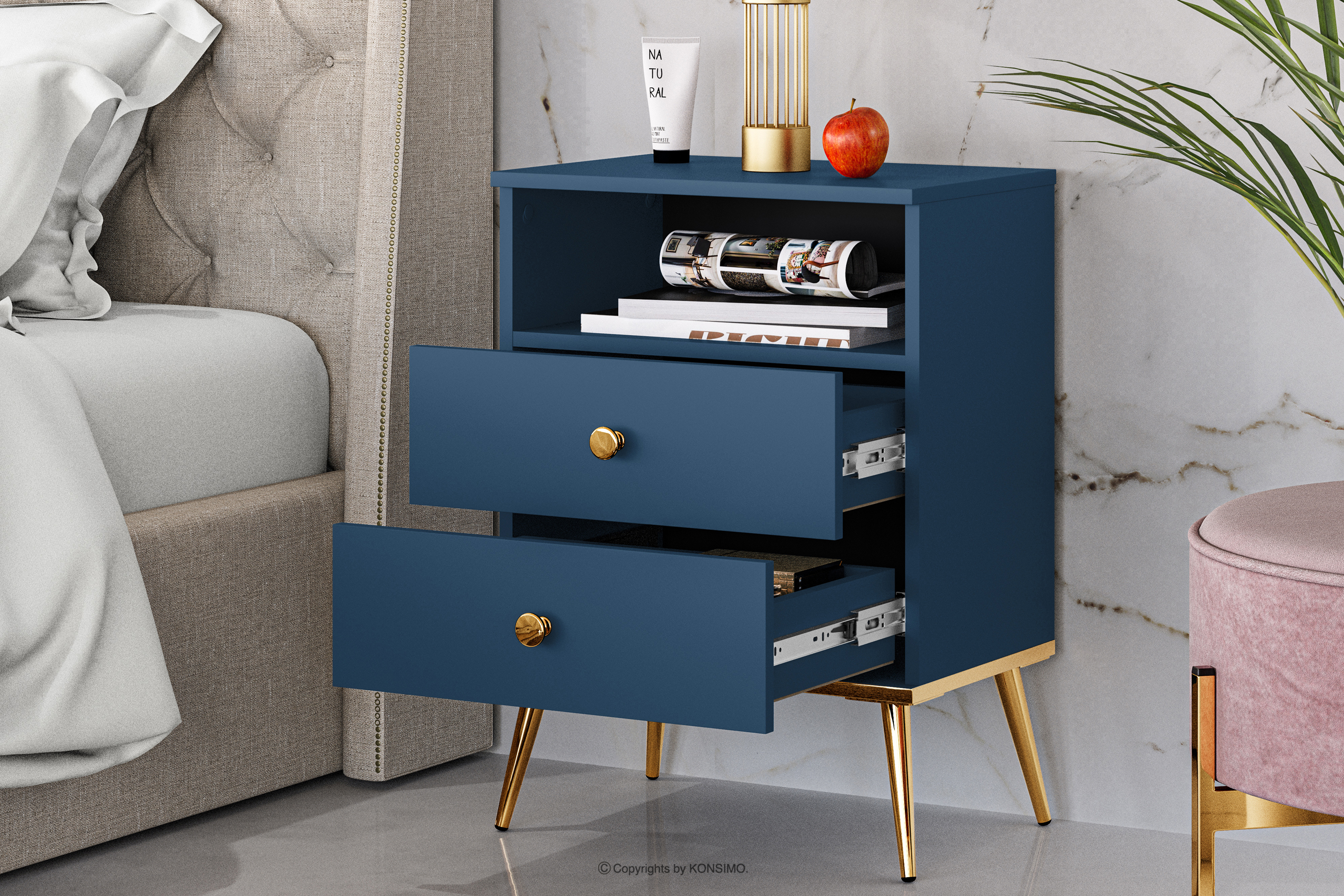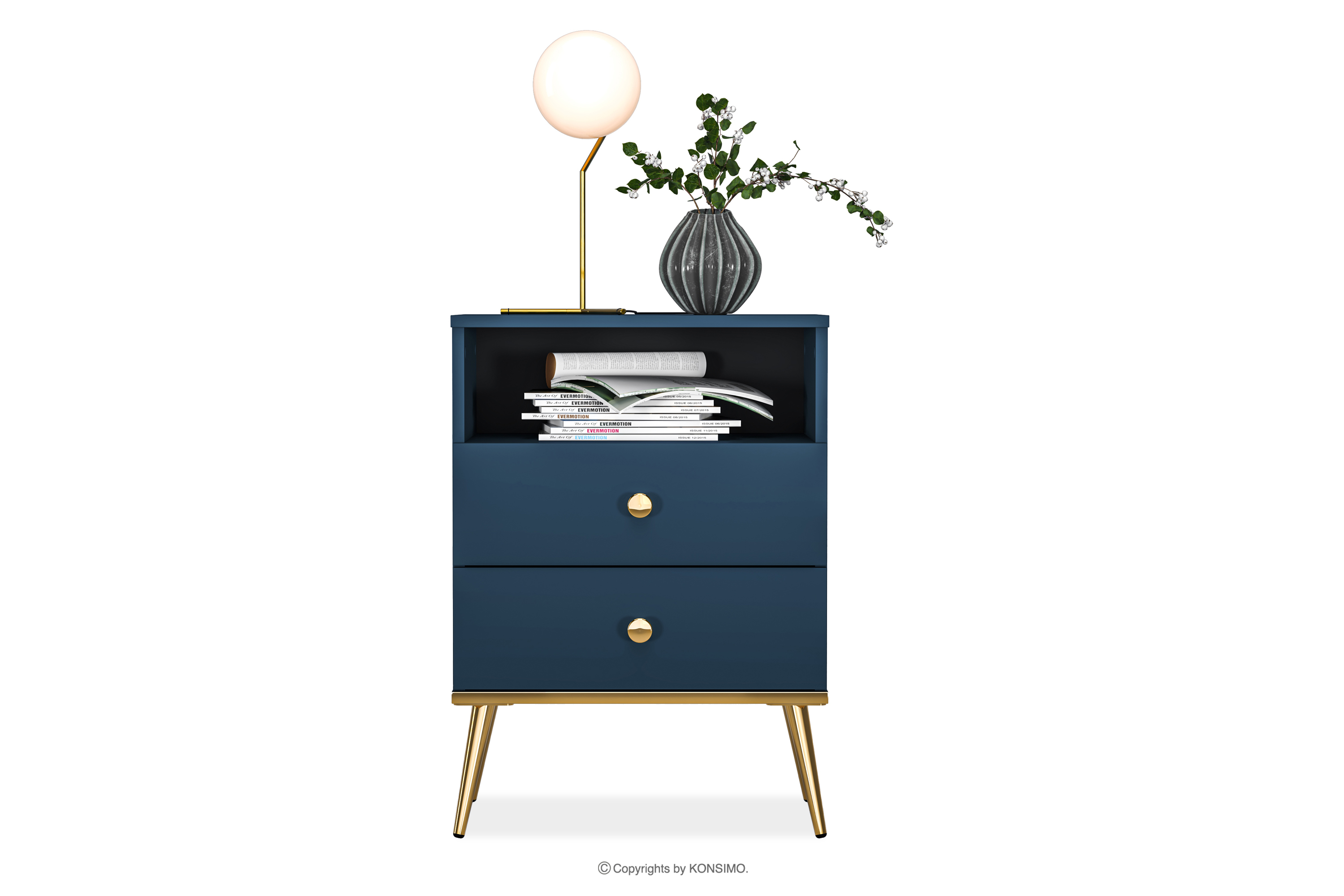 Nočný stolík v tmavomodrej farbe na vysokých nožičkách vnesie do vášho interiéru nádych elegancie. Korpus z laminovanej dosky, ktorý je určený pre milovníkov elegantného štýlu aj robustnosti, poskytuje pevný základ pre každú miestnosť. Zlaté zúžené nohy a úchyty sú ako čerešnička na torte. A to nie je všetko! ABS hrany sú nielen elegantným detailom, ale aj zárukou proti poškodeniu a vlhkosti, vďaka čomu je nábytok nielen efektný, ale aj ľahko čistiteľný.
