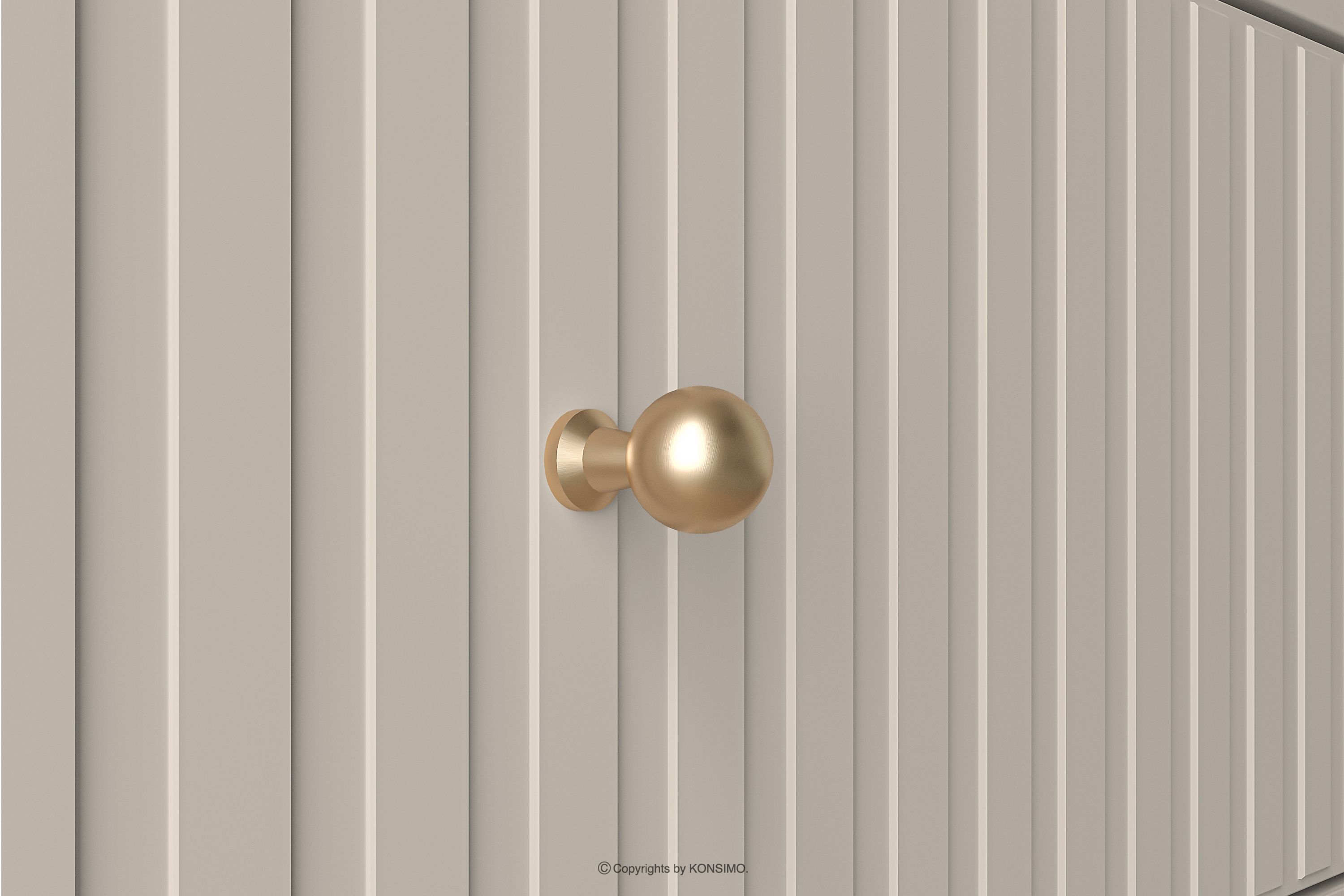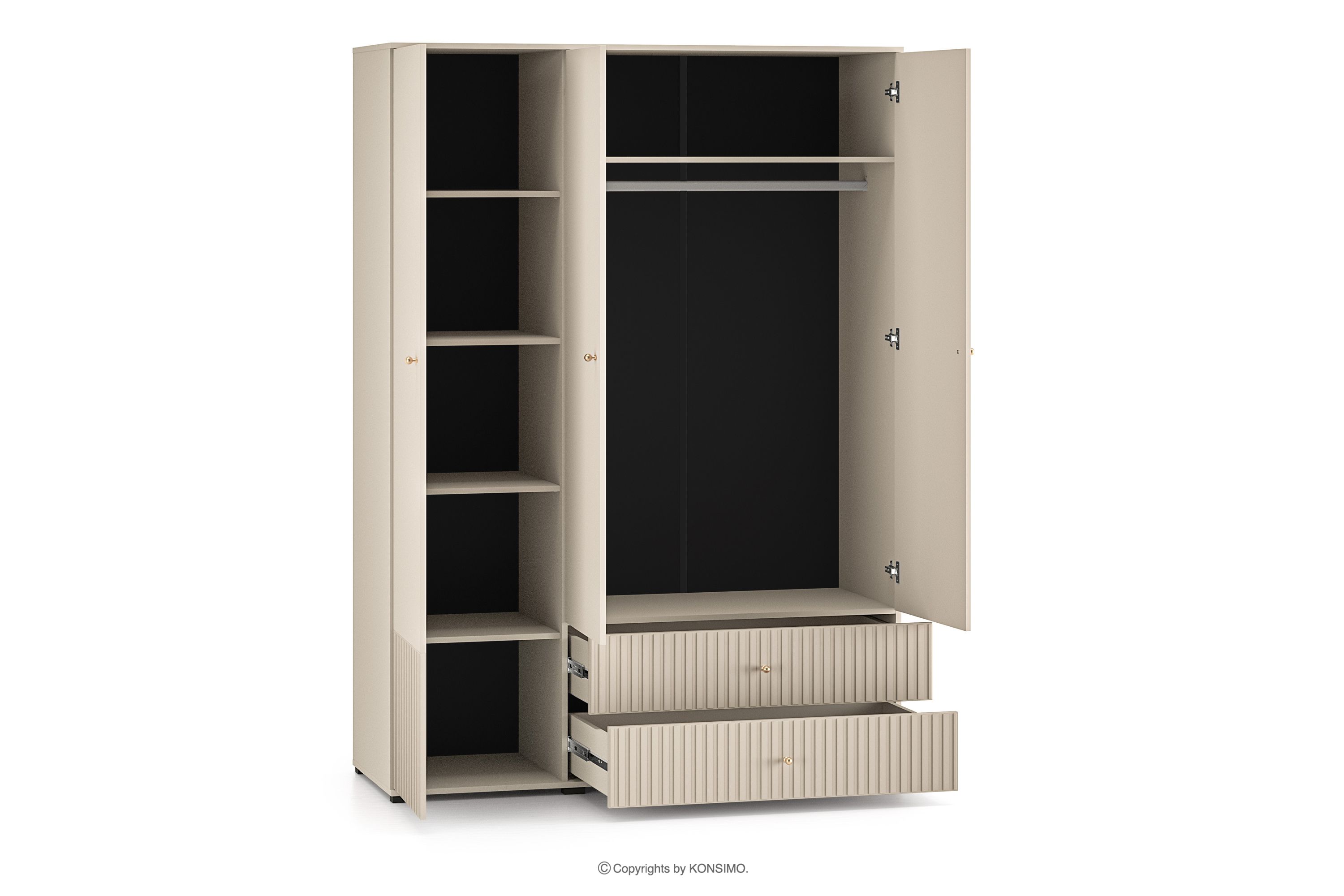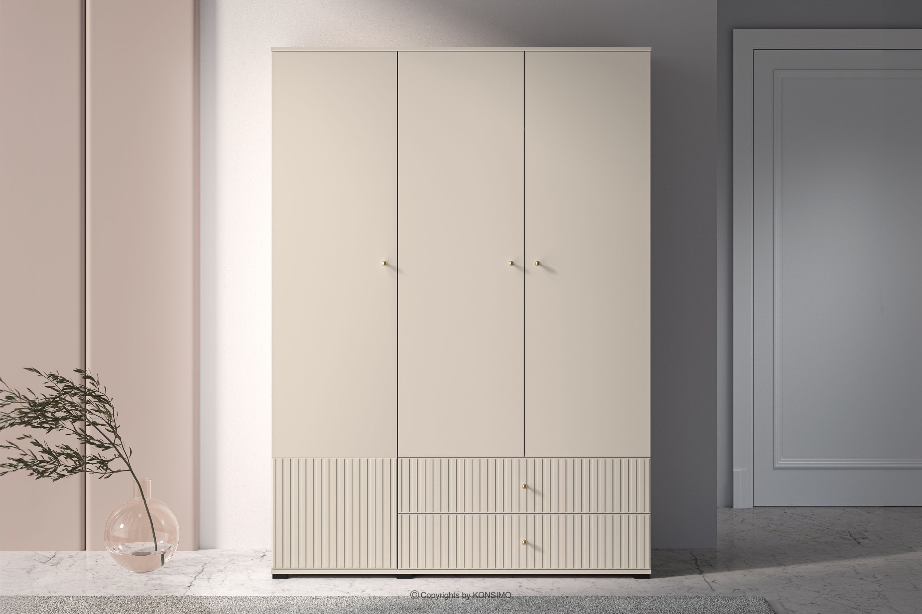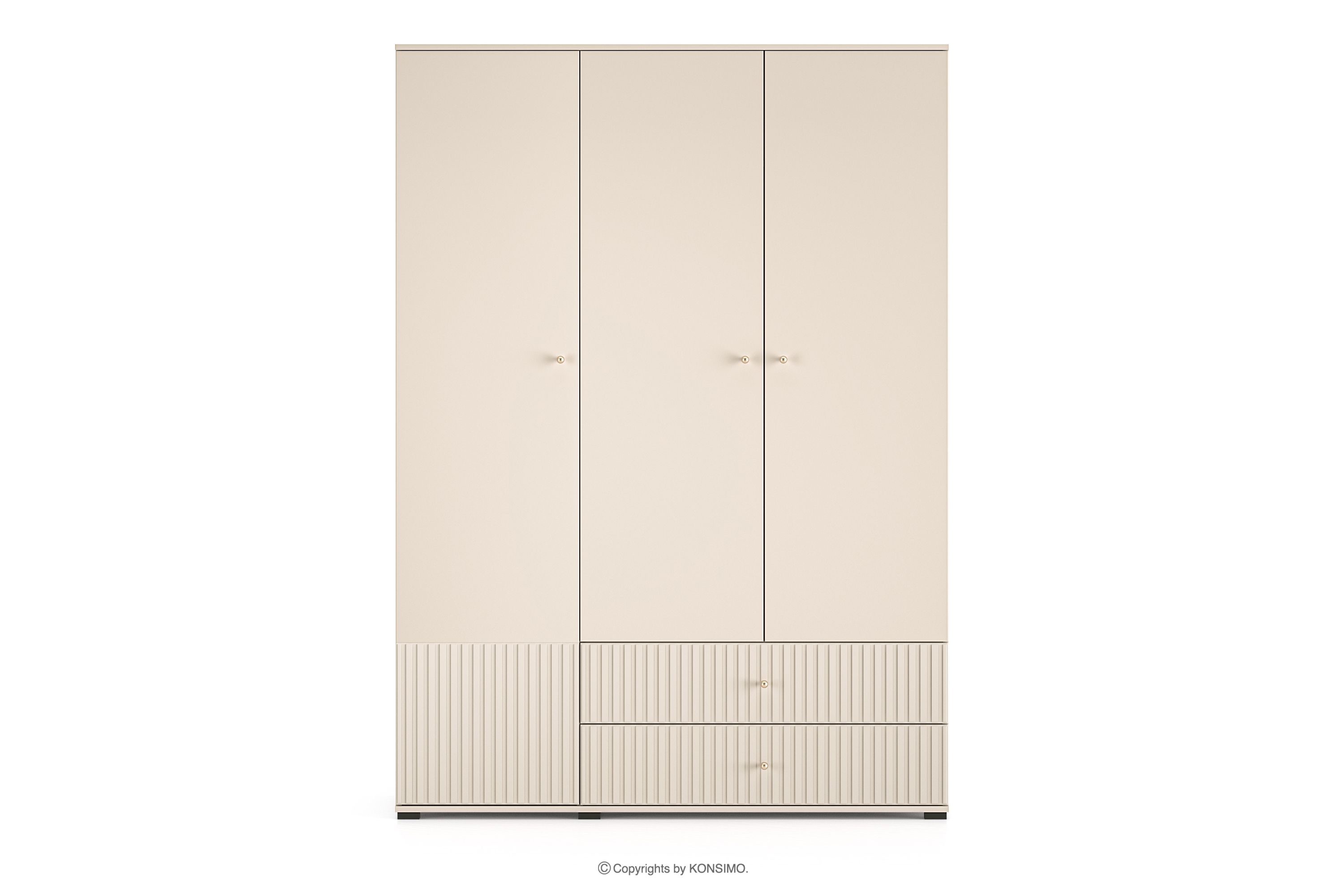 Objemná krémová trojdverová šatníková skriňa do spálne vnesie do vášho interiéru jemný nádych elegancie. Korpus z laminovanej dosky/MDF, ktorý je určený pre milovníkov elegantného štýlu a funkčnosti, poskytuje pevný základ nábytku. Čierne kovové nožičky a zlaté úchyty dodávajú nábytku jemnú eleganciu. To však nie je všetko! ABS hrany sú nielen elegantným detailom, ale aj zárukou odolnosti voči poškodeniu a vlhkosti, vďaka čomu je kus nábytku nielen pôsobivý, ale aj ľahko udržiavateľný v čistote.