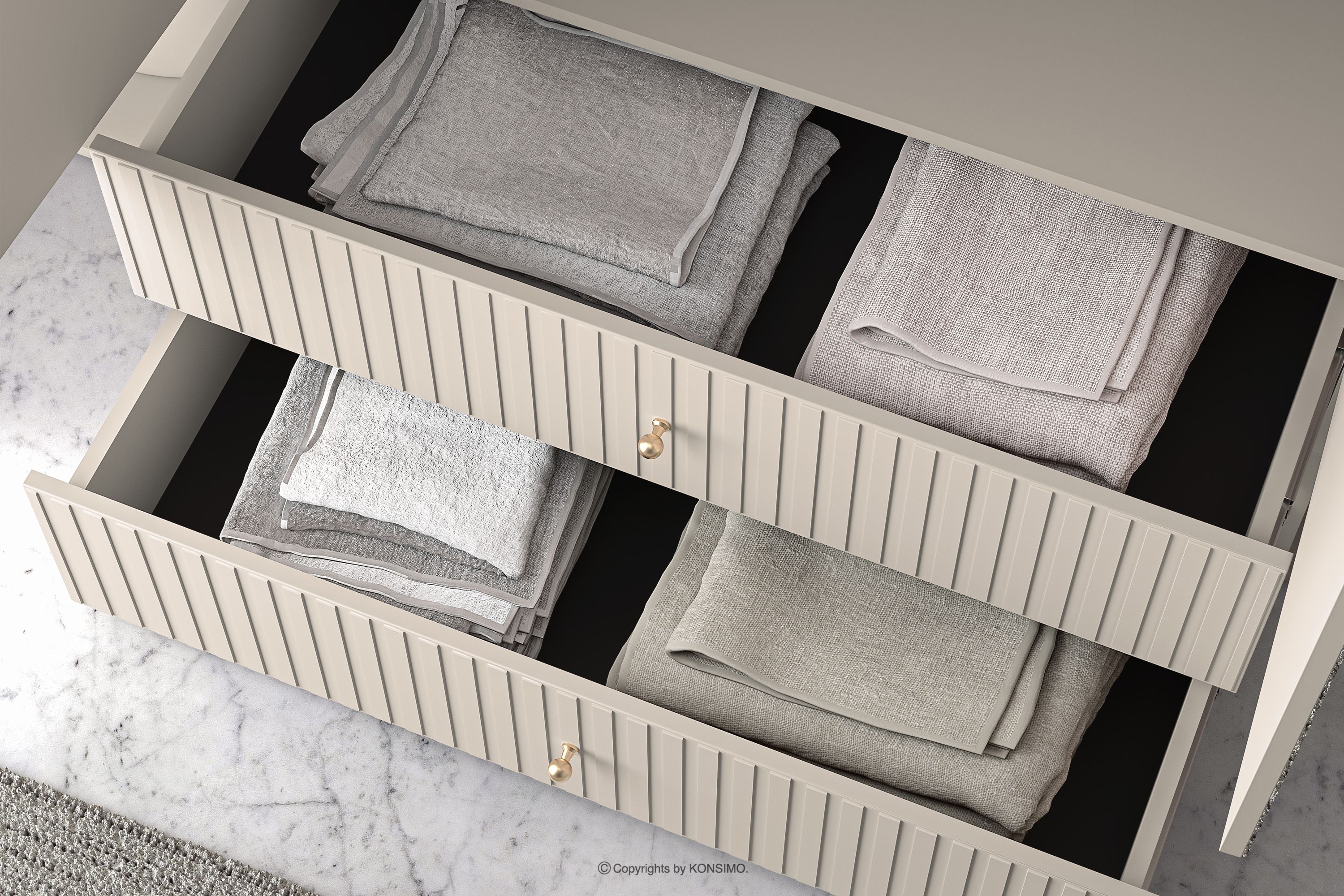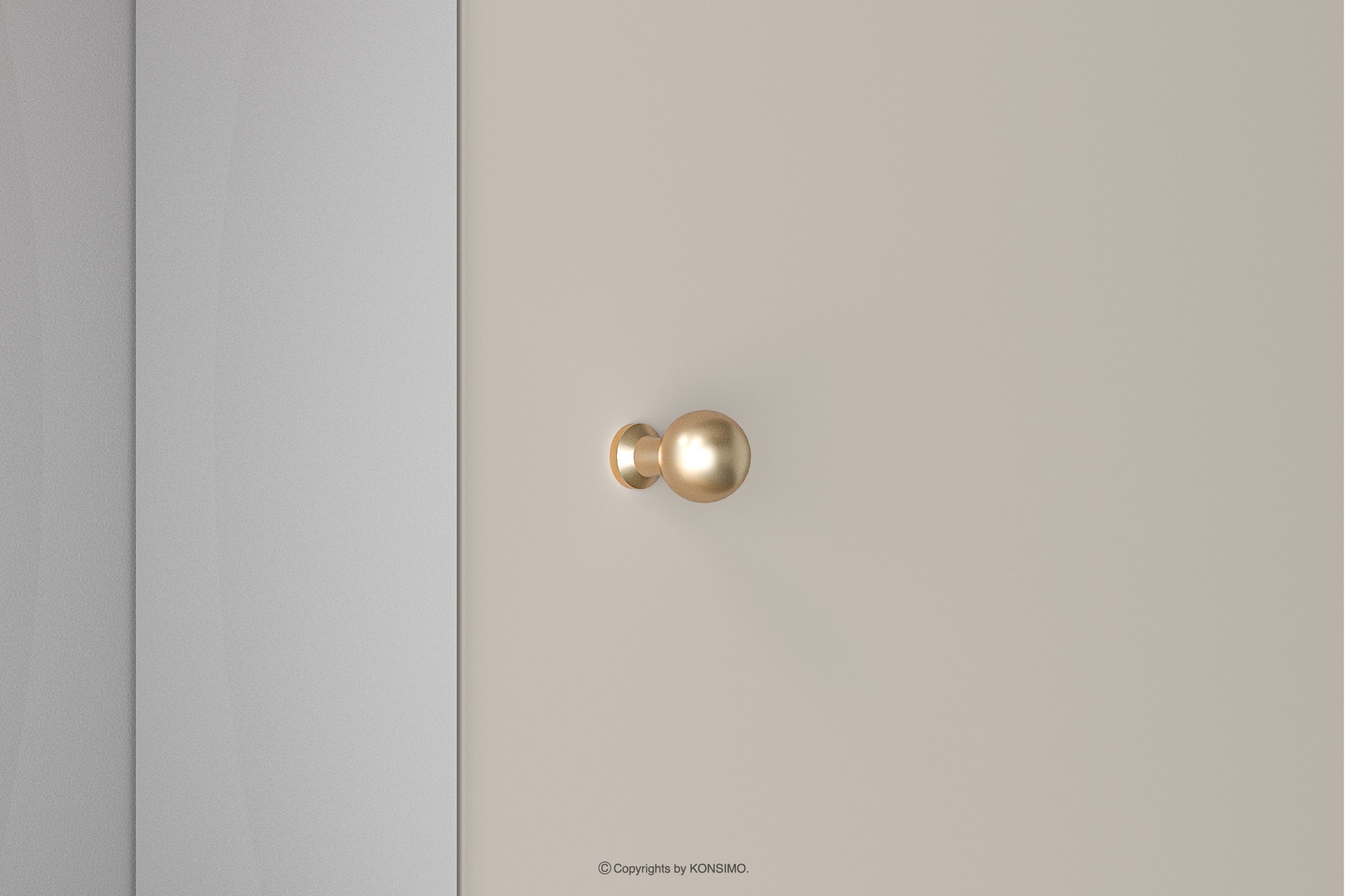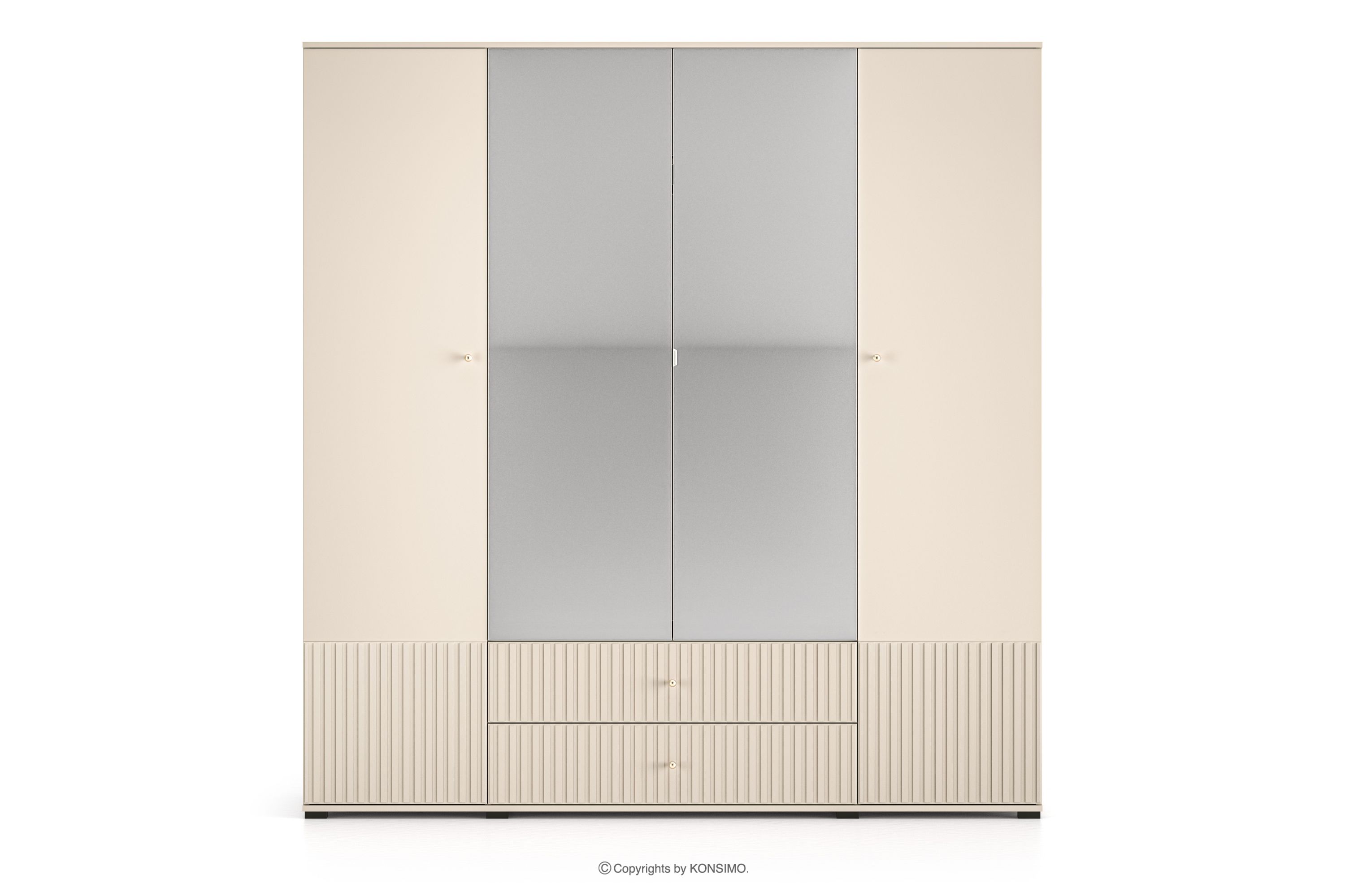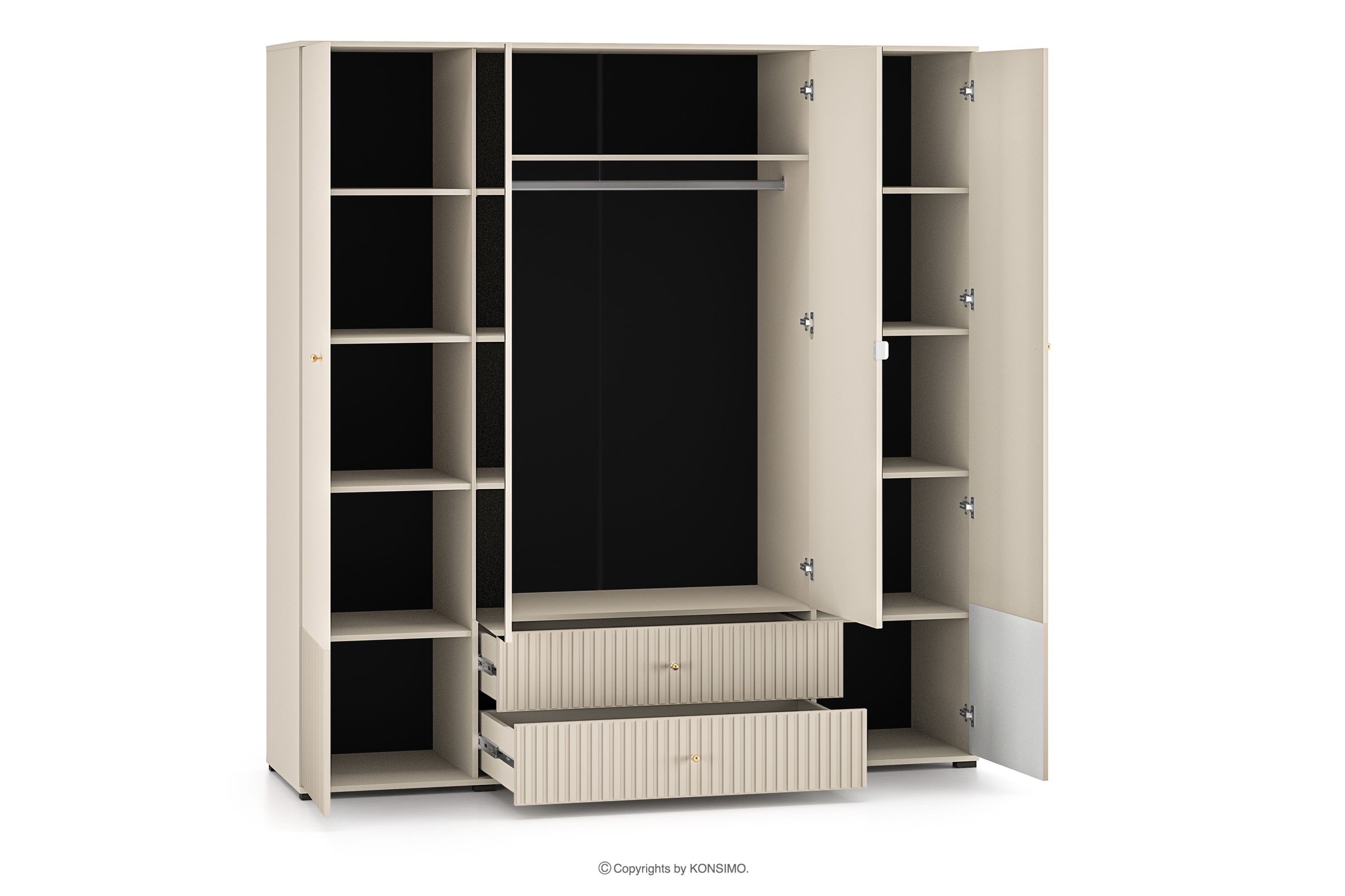 Veľká krémová štvordverová šatníková skriňa do spálne vnesie do vášho interiéru jemný nádych elegancie. Korpus z laminovanej dosky/MDF, ktorý je určený pre milovníkov elegantného štýlu a funkčnosti, poskytuje pevný základ nábytku. Čierne kovové nožičky a zlaté úchyty dodávajú nábytku jemnú eleganciu. To však nie je všetko! ABS hrany sú nielen elegantným detailom, ale aj zárukou odolnosti voči poškodeniu a vlhkosti, vďaka čomu je nábytok nielen pôsobivý, ale aj ľahko udržiavateľný v čistote.