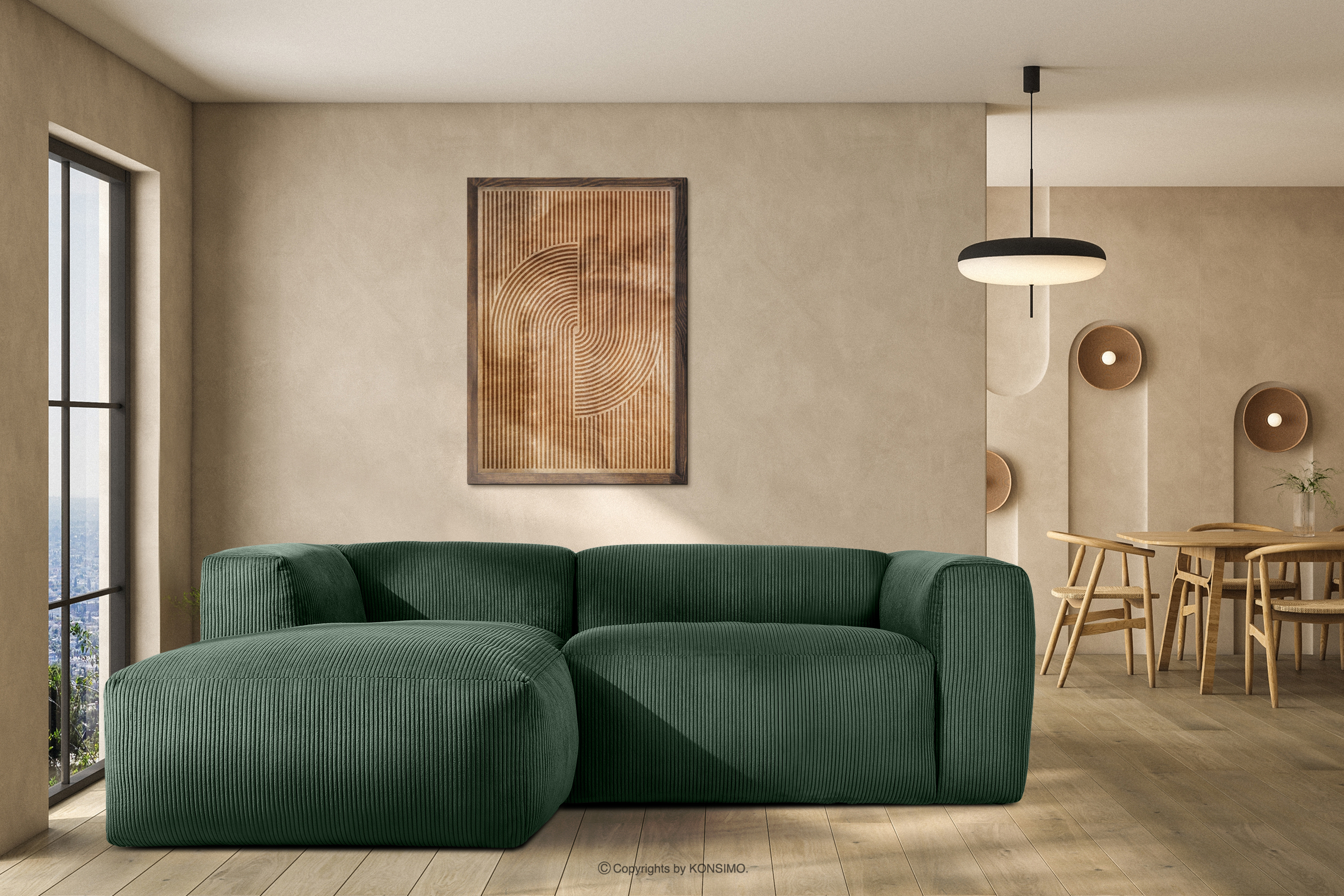 Modulová rohová sedacia súprava do obývačky v manšestrovej látke tmavozelenej ľavej farby sa určite stane ústredným bodom každej obývačky. Rám je vyrobený z odolného borovicového a bukového dreva, čo zaručuje nielen pevnosť, ale aj estetiku. Okrem toho použitie odolných drevotrieskových a drevovláknitých dosiek zvyšuje úroveň stability a odolnosti nábytku. Vďaka tomu si zachováva svoju formu aj pri intenzívnom používaní, takže je mimoriadne odolný voči všetkým nástrahám každodenného života.