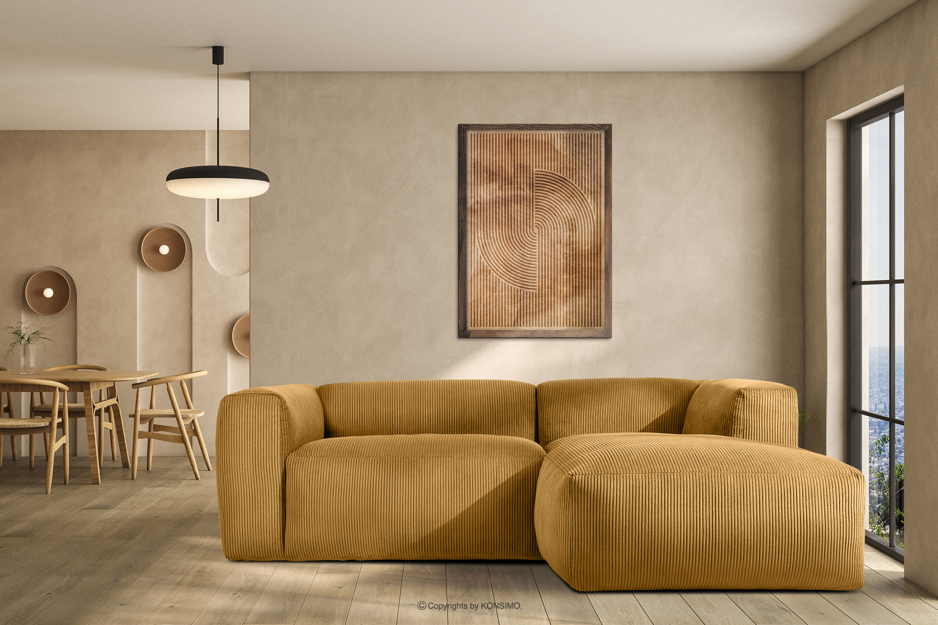 Modulárna rohová sedacia súprava do obývačky v manšestrovej žltej látke vpravo sa určite stane ústredným bodom každej obývačky. Rám je vyrobený z odolného borovicového a bukového dreva, čo zaručuje nielen pevnosť, ale aj estetiku. Okrem toho použitie odolných drevotrieskových a drevovláknitých dosiek zvyšuje úroveň stability a odolnosti nábytku. Vďaka tomu si zachováva svoju formu aj pri intenzívnom používaní, takže je mimoriadne odolný voči všetkým nástrahám každodenného života.