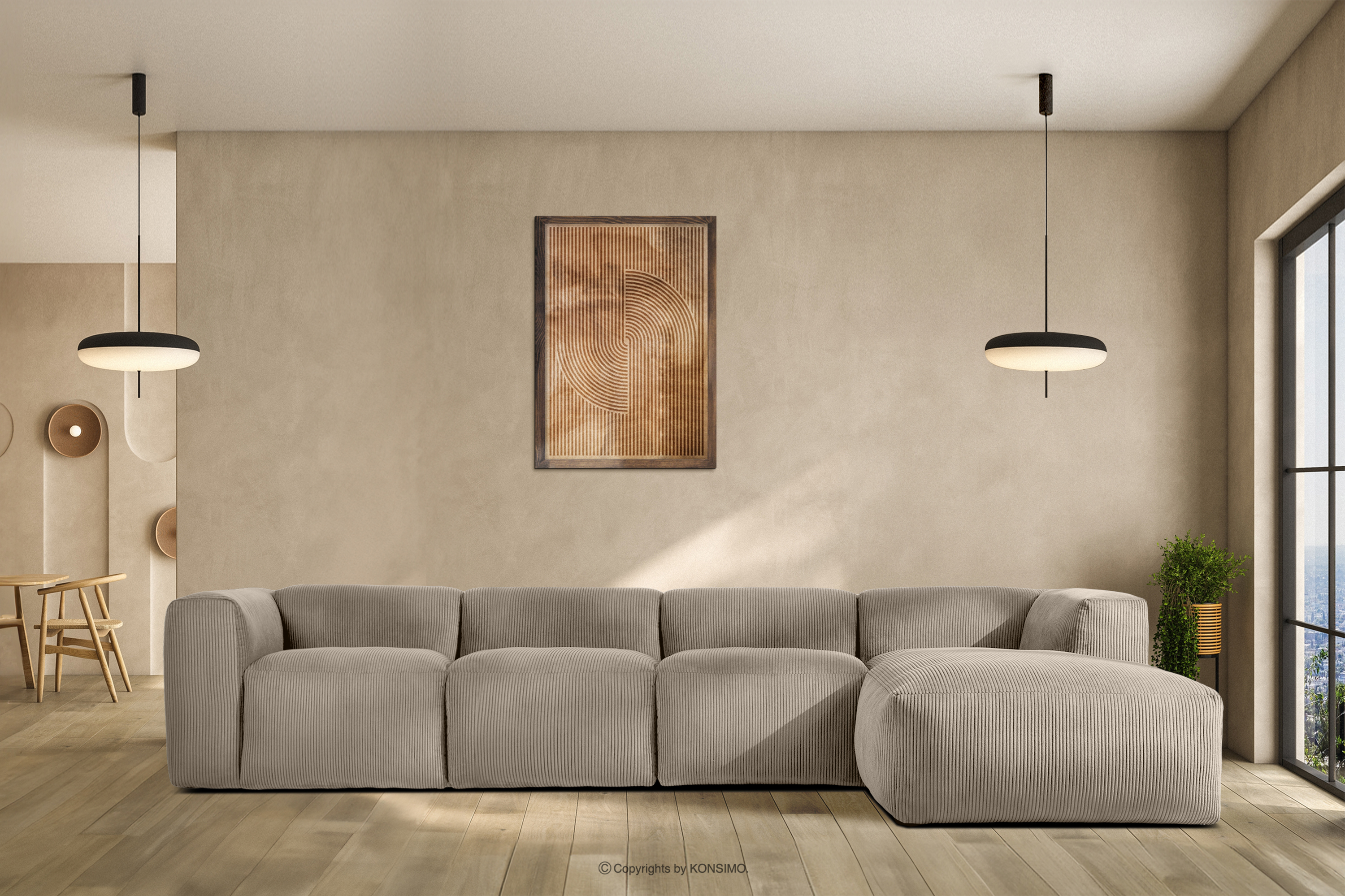 Veľká modulárna rohová pohovka do obývačky v manšestrovej béžovej látke vľavo sa určite stane ústredným bodom každej obývačky. Rám je vyrobený z odolného borovicového a bukového dreva, čo zaručuje nielen pevnosť, ale aj estetiku. Okrem toho použitie odolných drevotrieskových a drevovláknitých dosiek zvyšuje úroveň stability a odolnosti nábytku. Vďaka tomu si zachováva svoju formu aj pri intenzívnom používaní, takže je mimoriadne odolný voči všetkým nástrahám každodenného života.