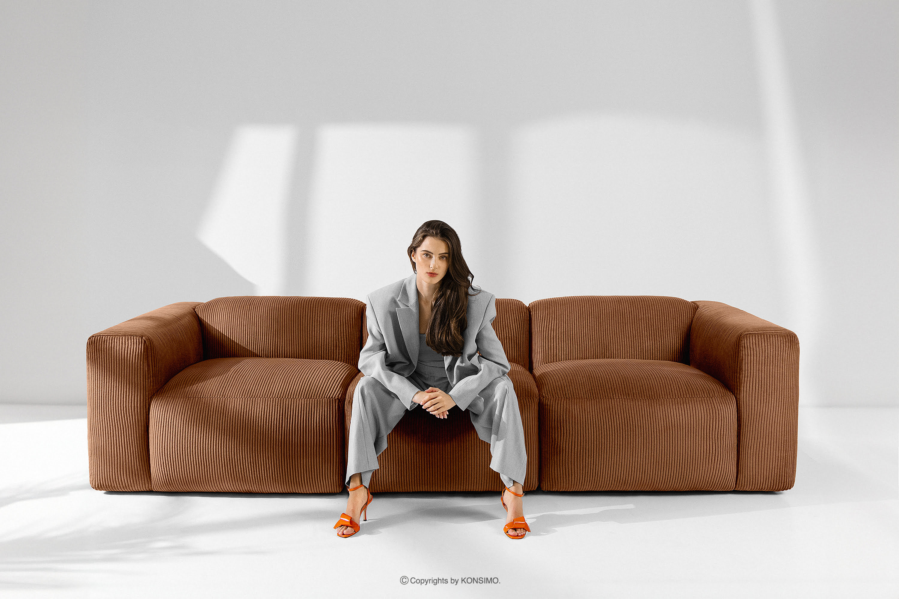 Veľká modulárna rohová pohovka do obývačky v manšestrovej látke vpravo sa určite stane ústredným bodom každej obývačky. Rám je vyrobený z odolného borovicového a bukového dreva, čo zaručuje nielen robustnosť, ale aj estetiku. Okrem toho použitie odolných drevotrieskových a drevovláknitých dosiek zvyšuje úroveň stability a odolnosti nábytku. Vďaka tomu si zachováva svoju formu aj pri intenzívnom používaní, takže je mimoriadne odolný voči všetkým nástrahám každodenného života.
