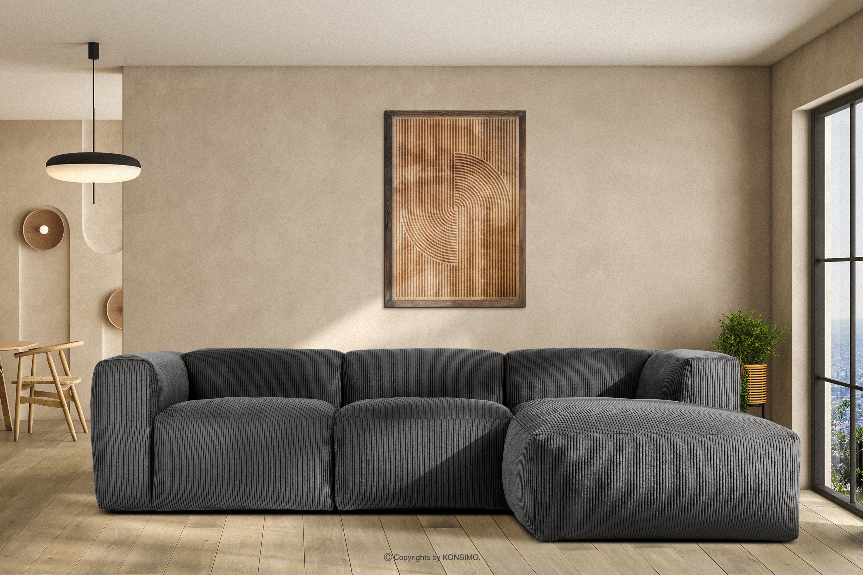 Modulárna rohová pohovka v manšestrovej sivej pravej látke sa určite stane ústredným bodom každej obývačky. Rám je vyrobený z odolného borovicového a bukového dreva, čo zaručuje nielen pevnosť, ale aj estetiku. Okrem toho použitie odolných drevotrieskových a drevovláknitých dosiek zvyšuje úroveň stability a odolnosti nábytku. Vďaka tomu si zachováva svoju formu aj pri intenzívnom používaní, takže je mimoriadne odolný voči všetkým nástrahám každodenného života.