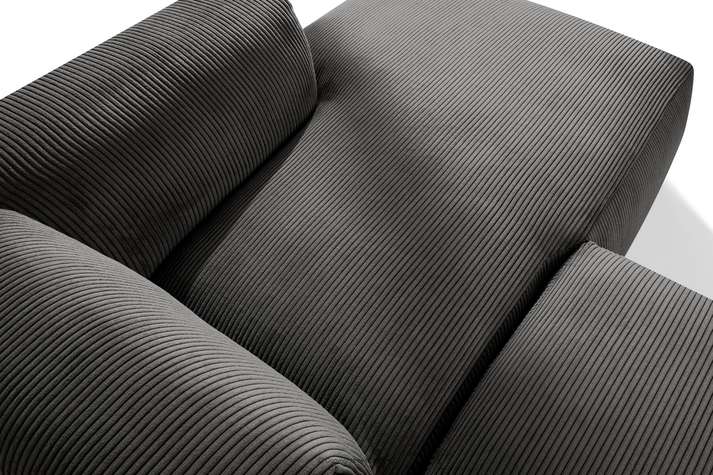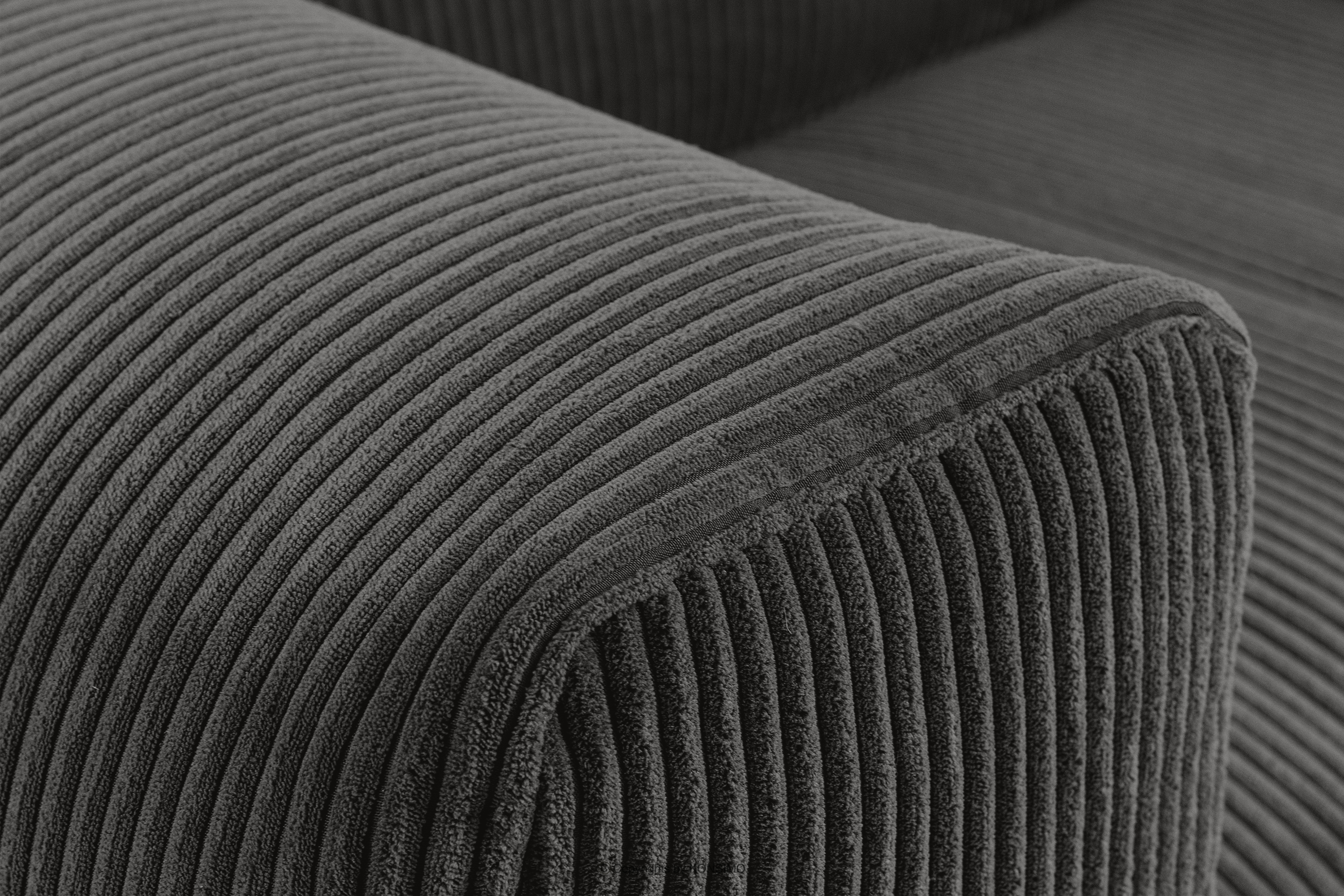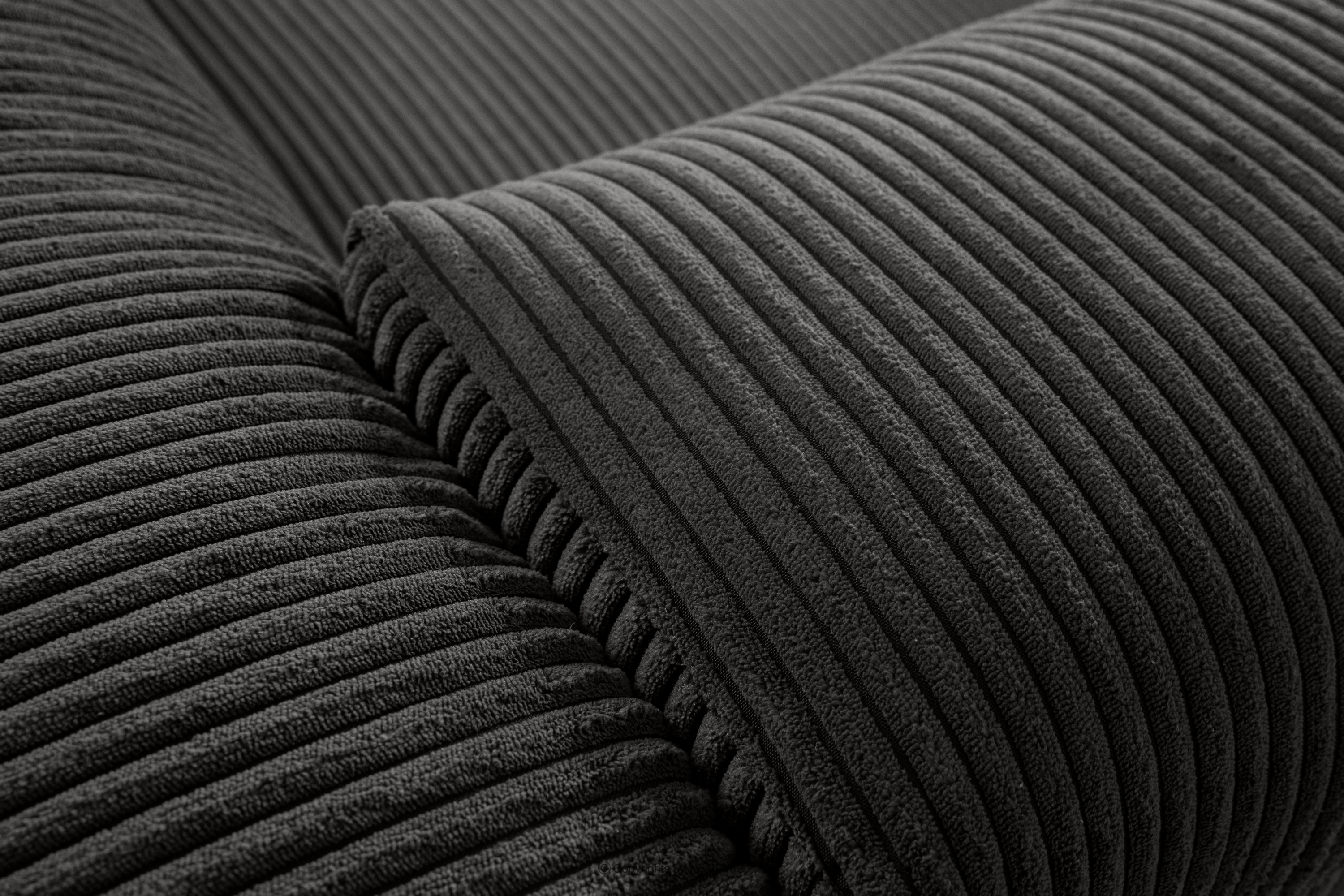 Veľká rohová pohovka v manšestrovej sivej látke sa určite stane ústredným bodom každej obývačky. Rám je vyrobený z odolného borovicového a bukového dreva, čo zaručuje nielen pevnosť, ale aj estetiku. Okrem toho použitie odolných drevotrieskových a drevovláknitých dosiek zvyšuje úroveň stability a odolnosti nábytku. Vďaka tomu si zachováva svoju formu aj pri intenzívnom používaní, takže je mimoriadne odolný voči všetkým nástrahám každodenného života.
