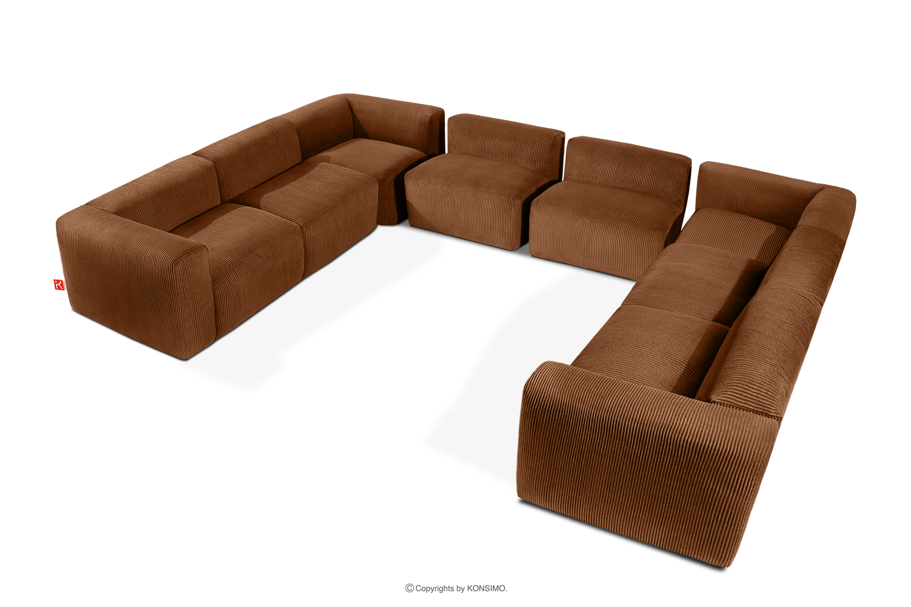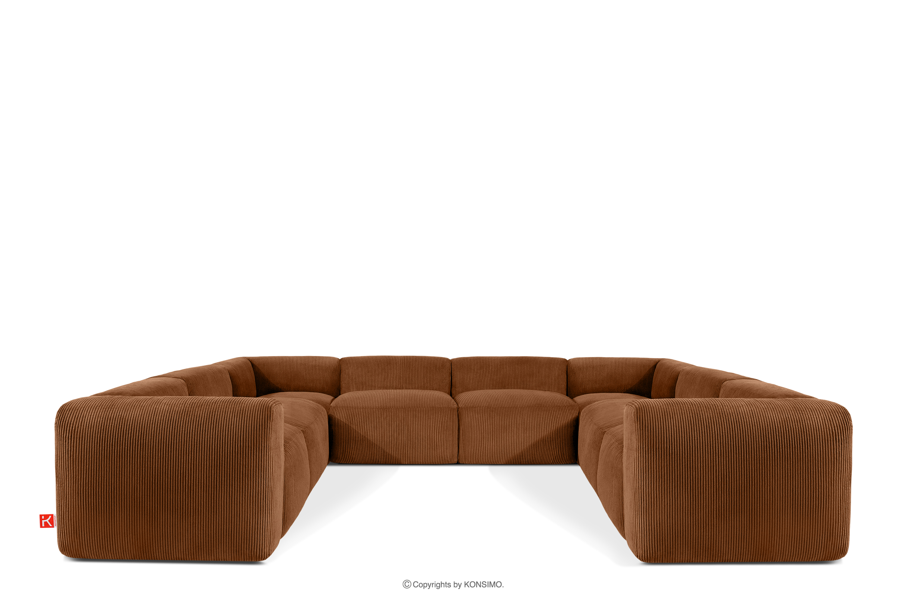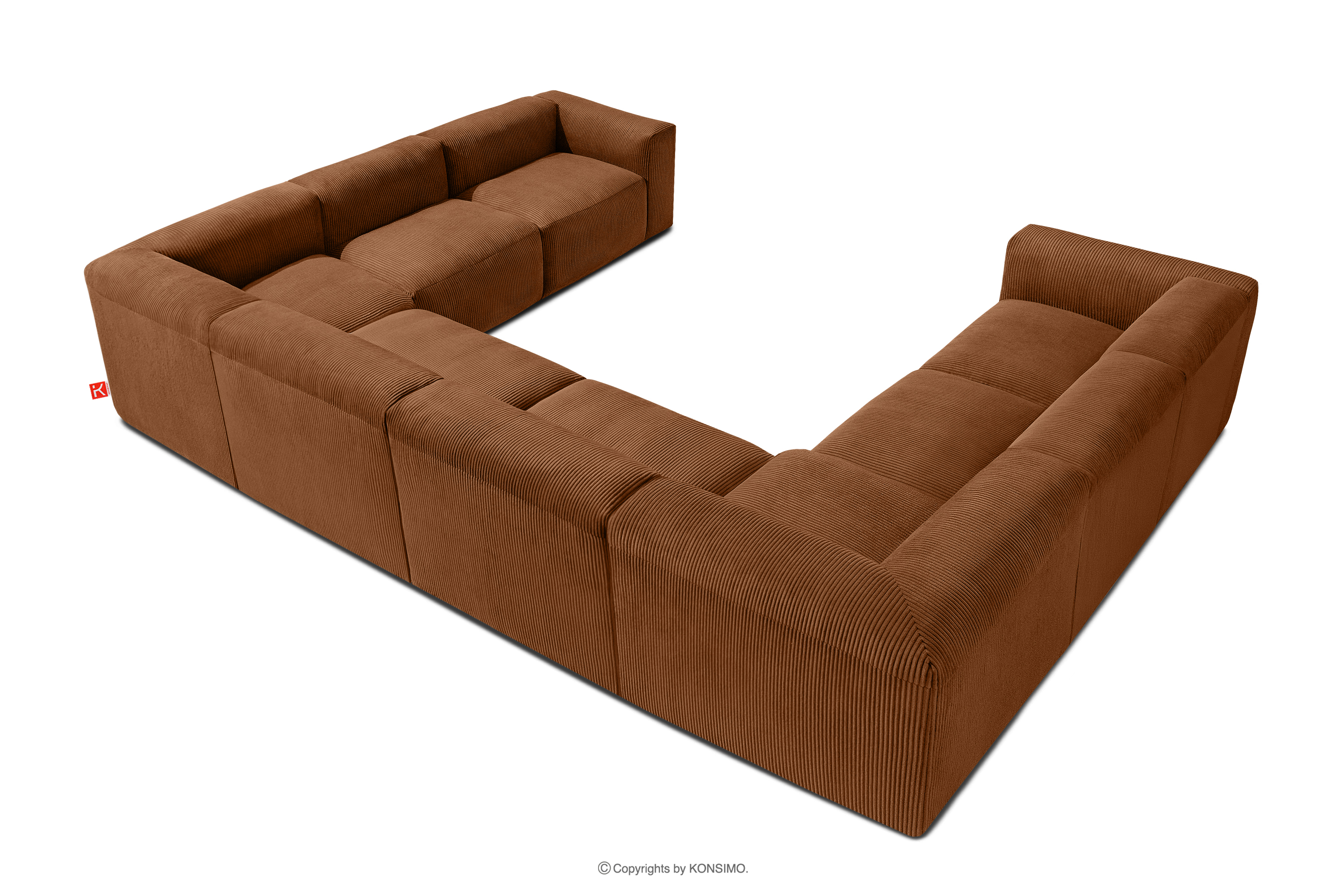 Veľká rohová pohovka do "U" v manšestrovej červenej látke sa určite stane ústredným bodom každej obývačky. Rám je vyrobený z odolného borovicového a bukového dreva, čo zaručuje nielen pevnosť, ale aj estetiku. Okrem toho použitie odolných drevotrieskových a drevovláknitých dosiek zvyšuje úroveň stability a odolnosti nábytku. Vďaka tomu si zachováva svoju formu aj pri intenzívnom používaní, takže je mimoriadne odolný voči všetkým nástrahám každodenného života.