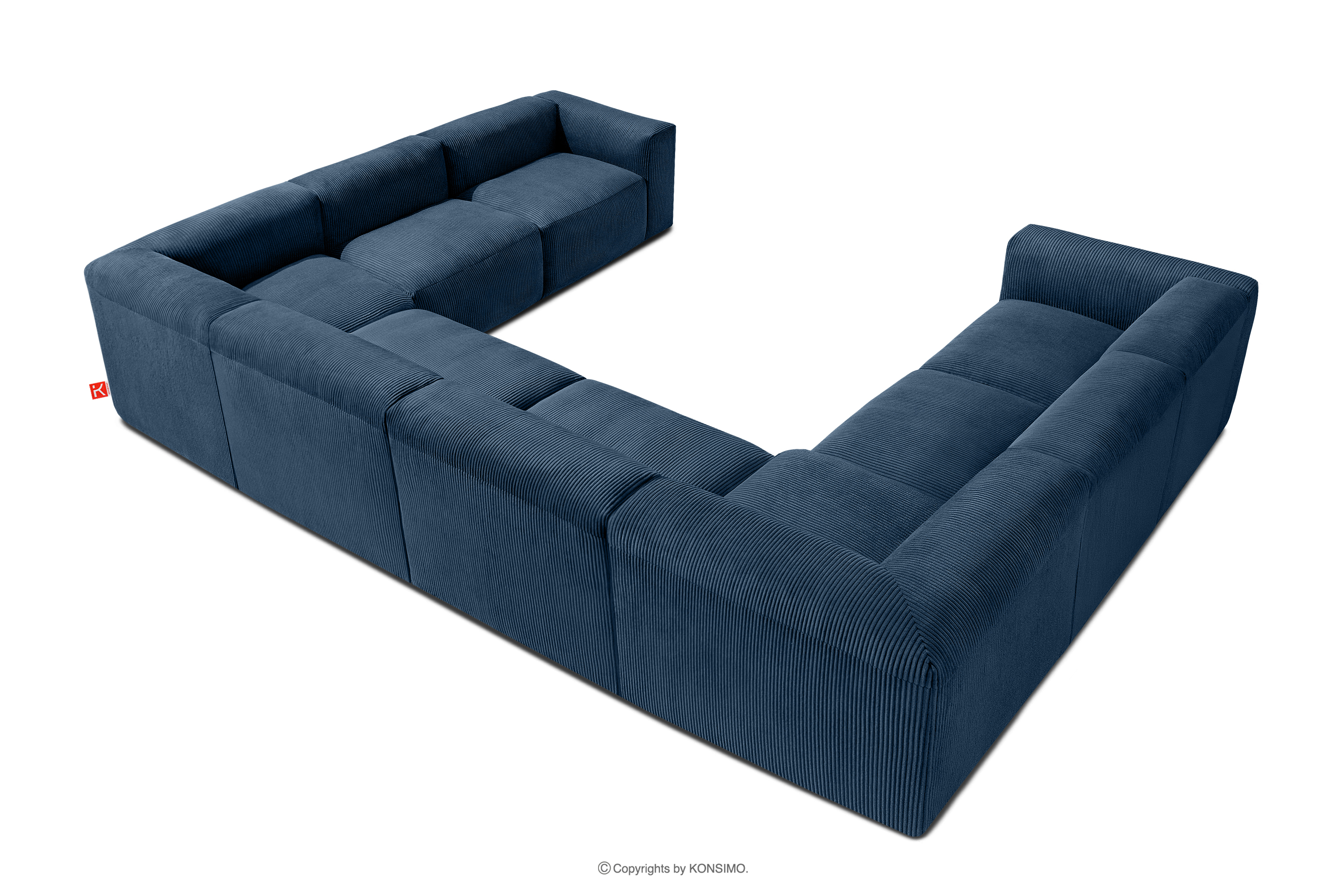 Veľká rohová pohovka do "U" v tmavomodrej manšestrovej látke sa určite stane ústredným bodom každej obývačky. Rám je vyrobený z odolného borovicového a bukového dreva, čo zaručuje nielen robustnosť, ale aj estetiku. Okrem toho použitie odolných drevotrieskových a drevovláknitých dosiek zvyšuje úroveň stability a odolnosti nábytku. Vďaka tomu si zachováva svoju formu aj pri intenzívnom používaní, takže je mimoriadne odolný voči všetkým nástrahám každodenného života.
