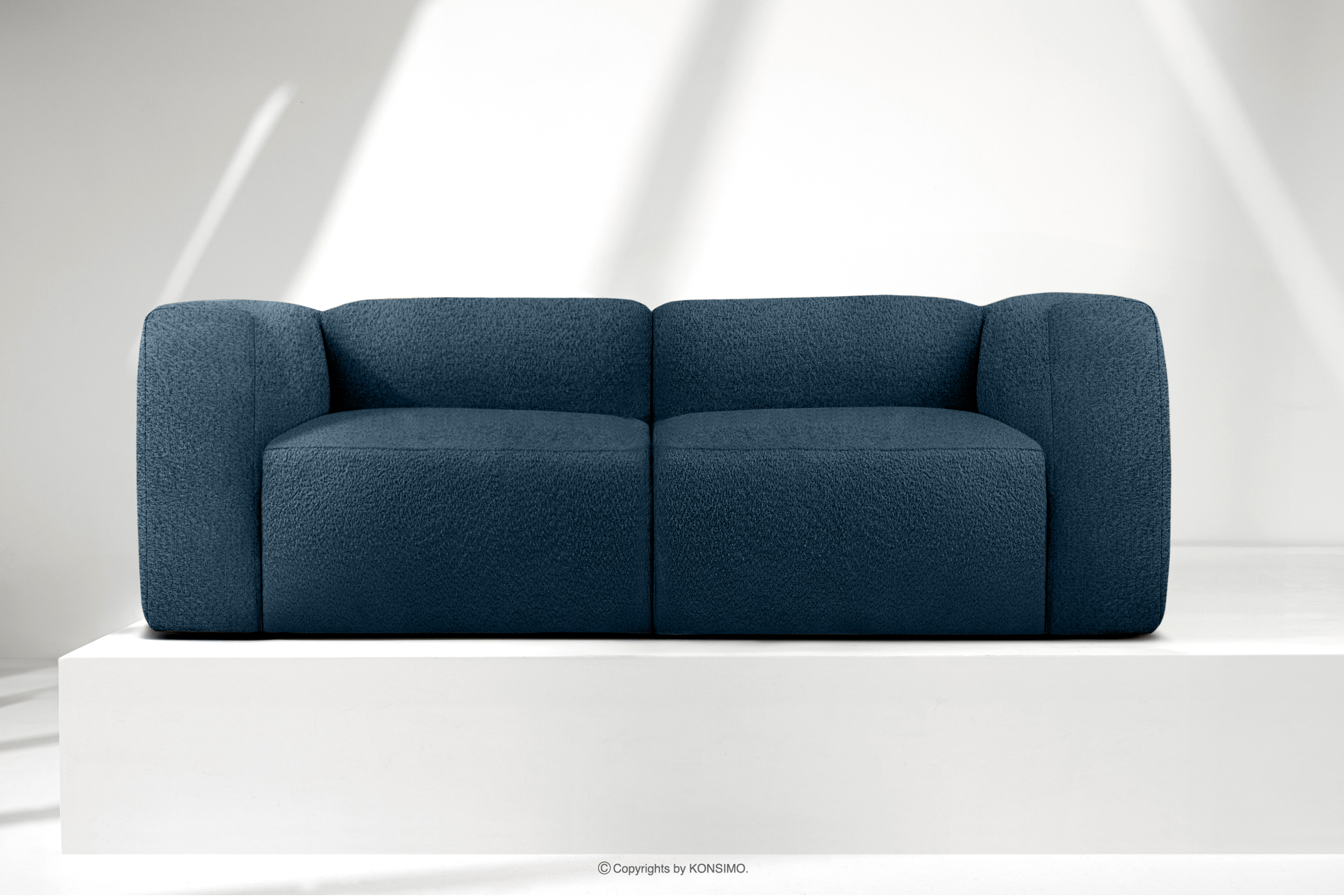 BUFFO Objav celú kolekciu Mäkká dvojmiestna pohovka z tmavomodrej bouclé tkaniny- farba tmavě modrá