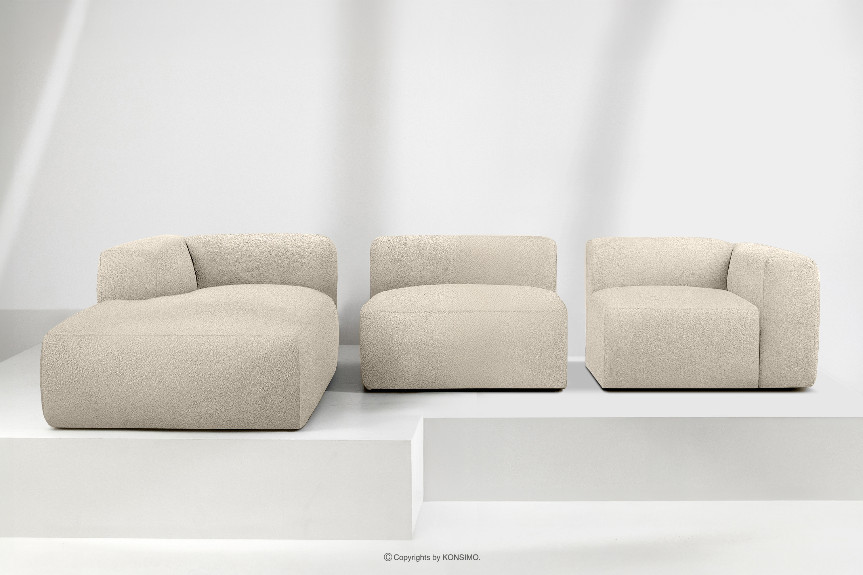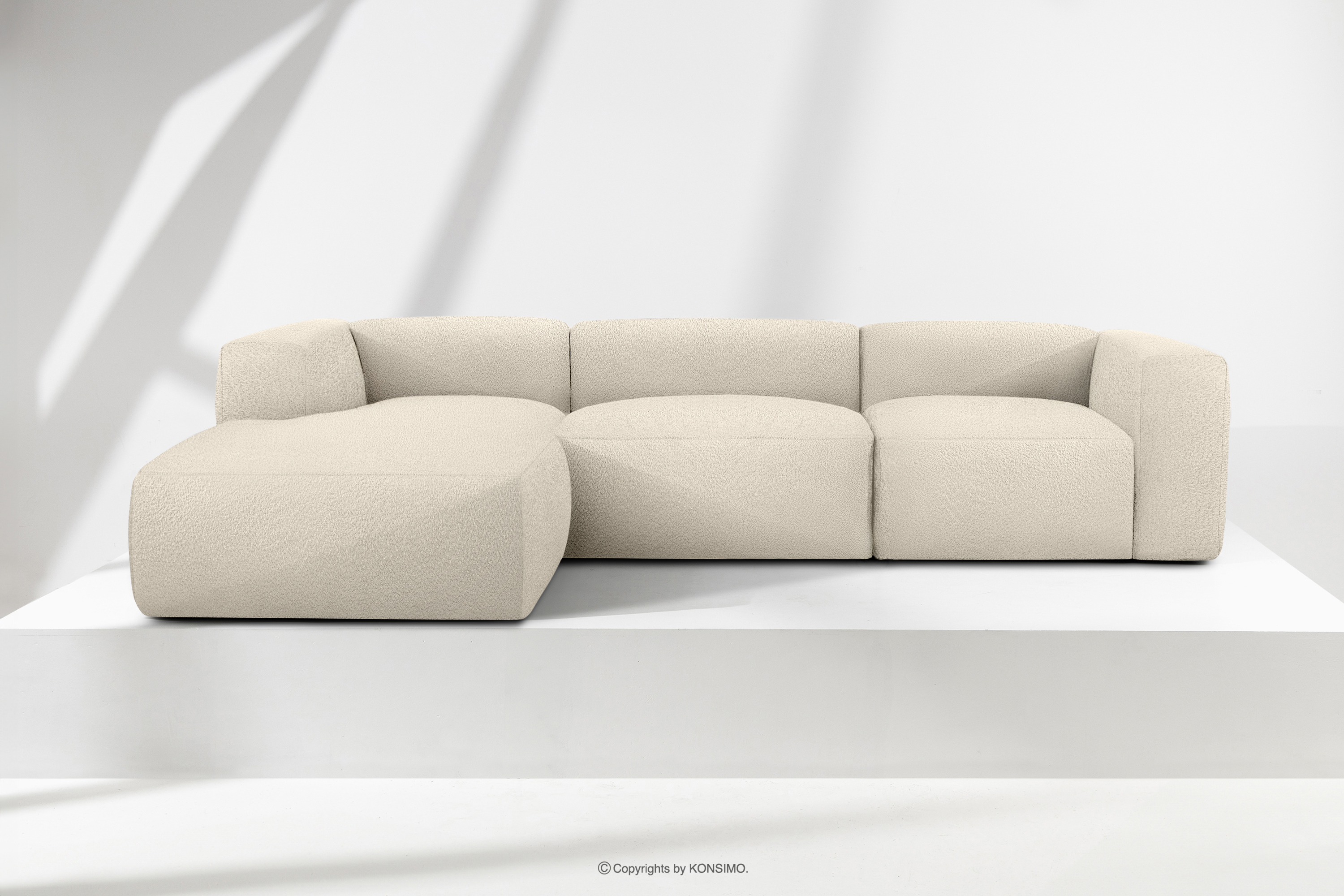 BUFFO Objav celú kolekciu Veľká mäkká rohová pohovka z bouclé tkaniny ľavá svetlo béžová- farba světle béžová