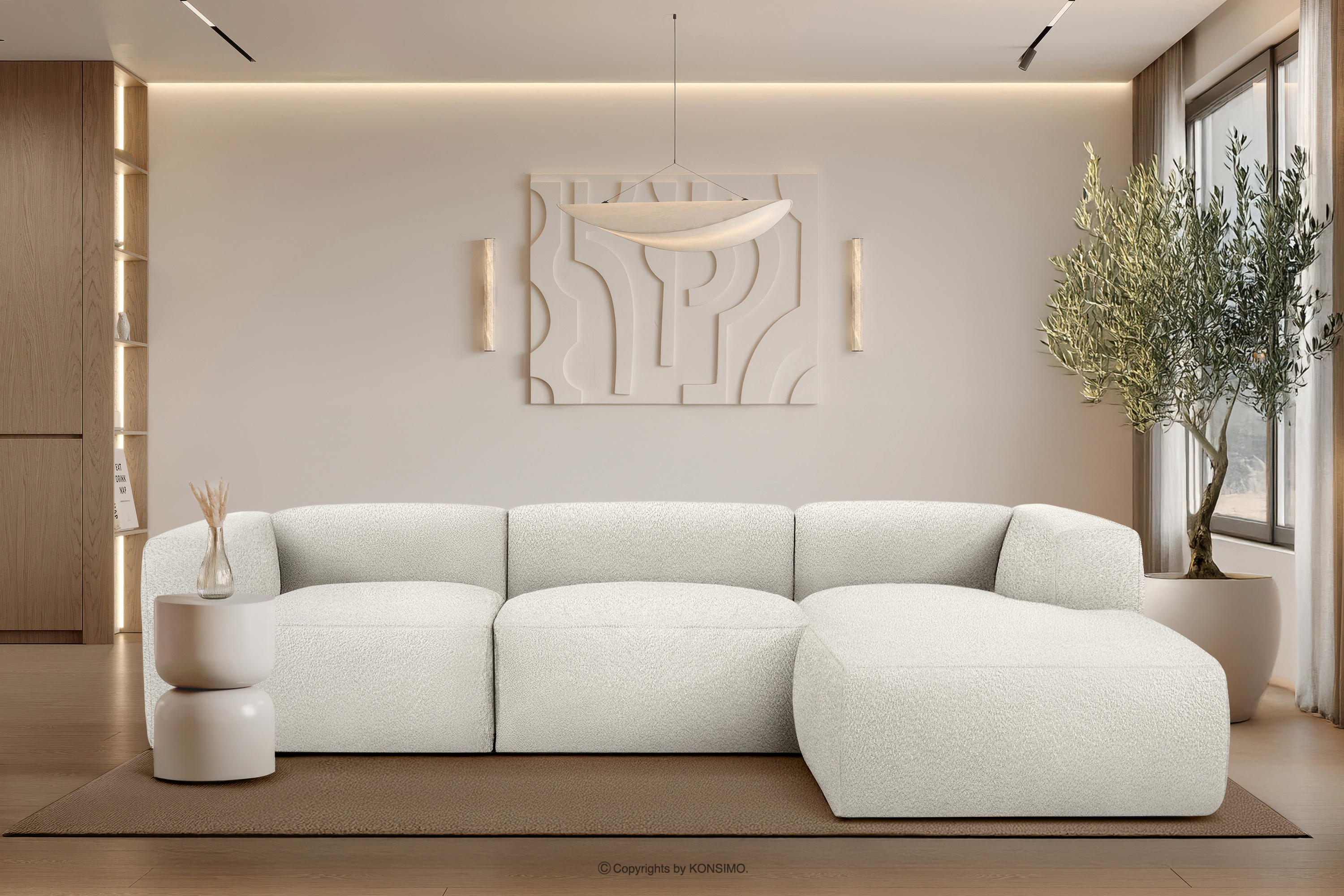 BUFFO Objav celú kolekciu Veľká mäkká rohová pohovka z bouclé tkaniny pravá biela- farba bílá