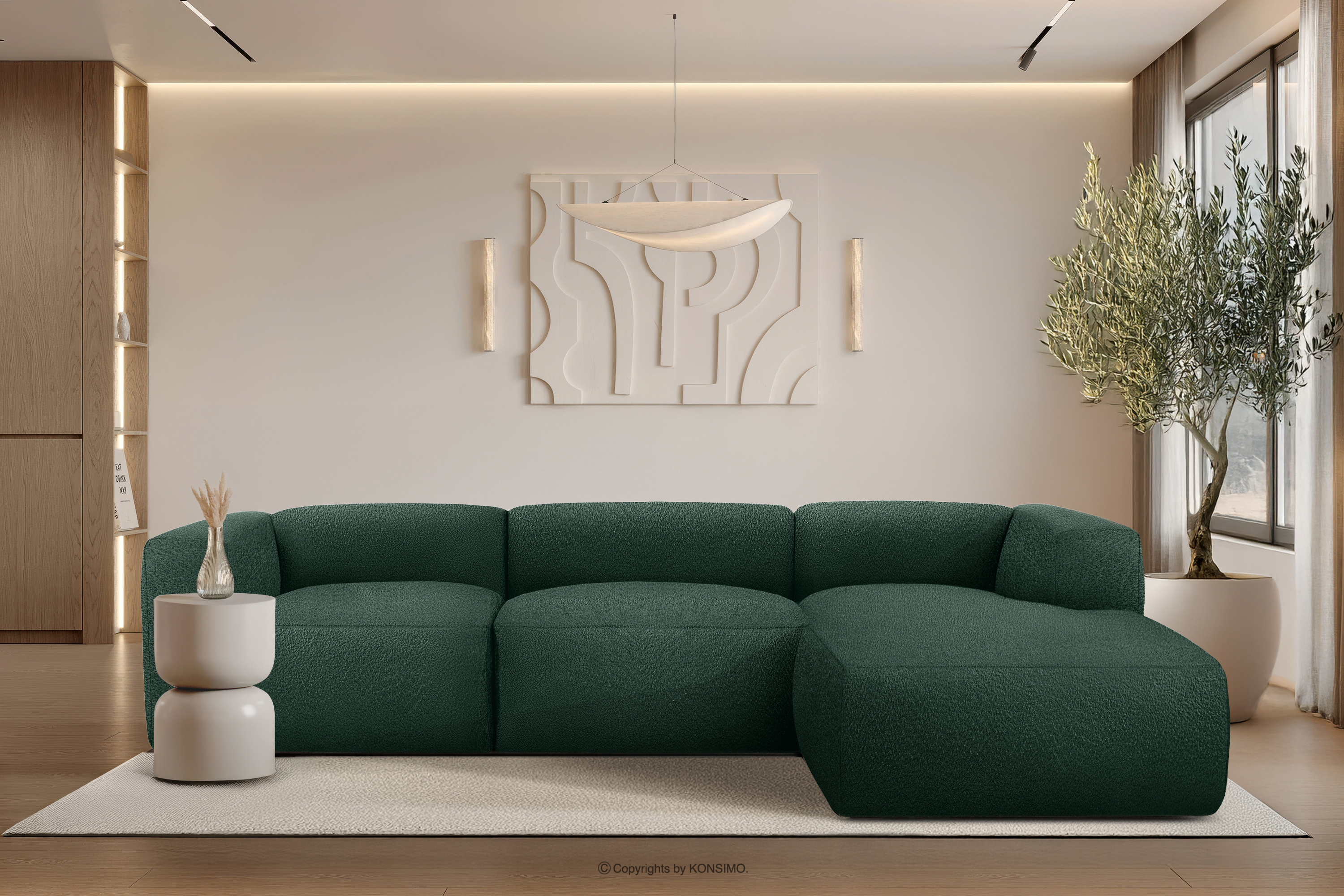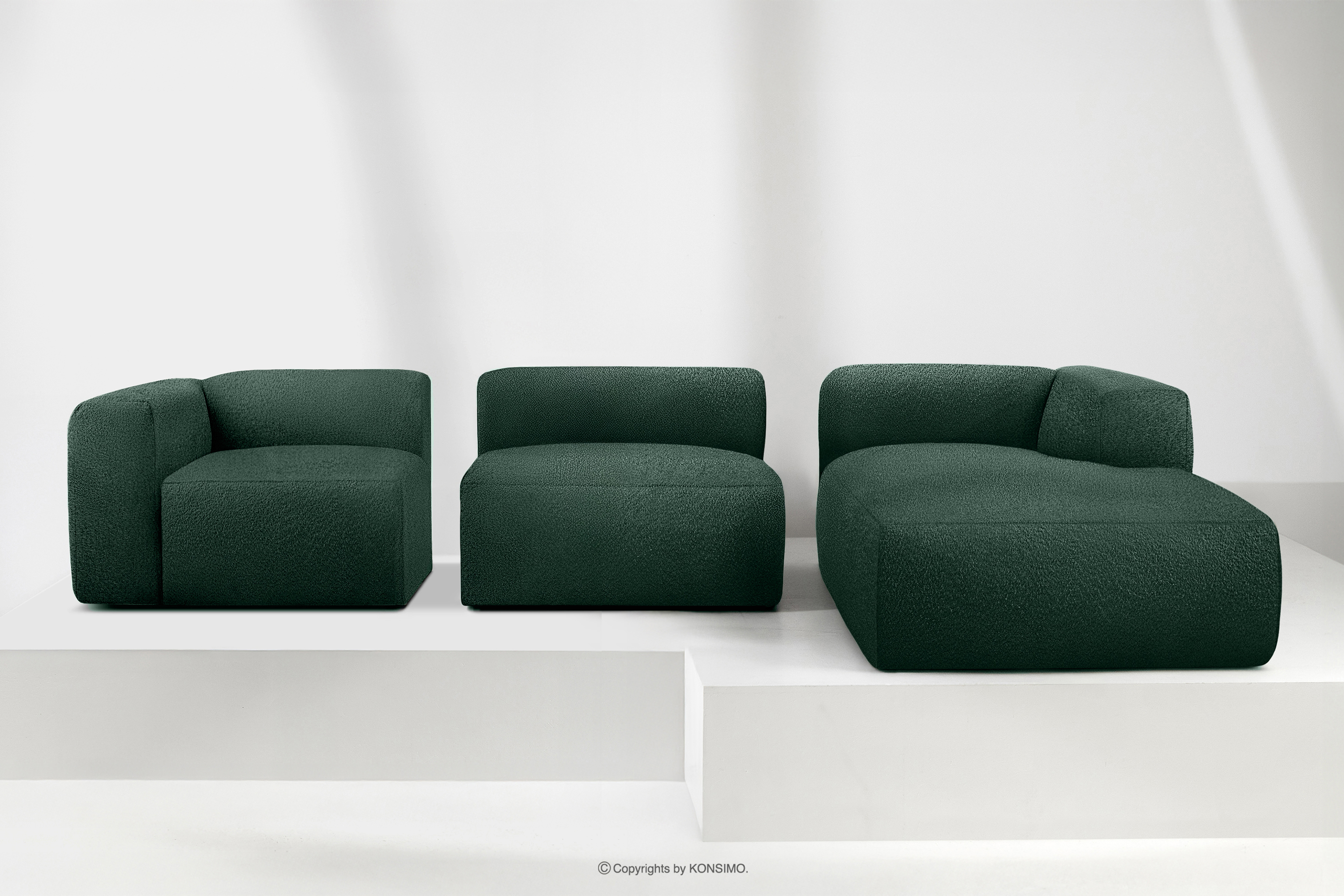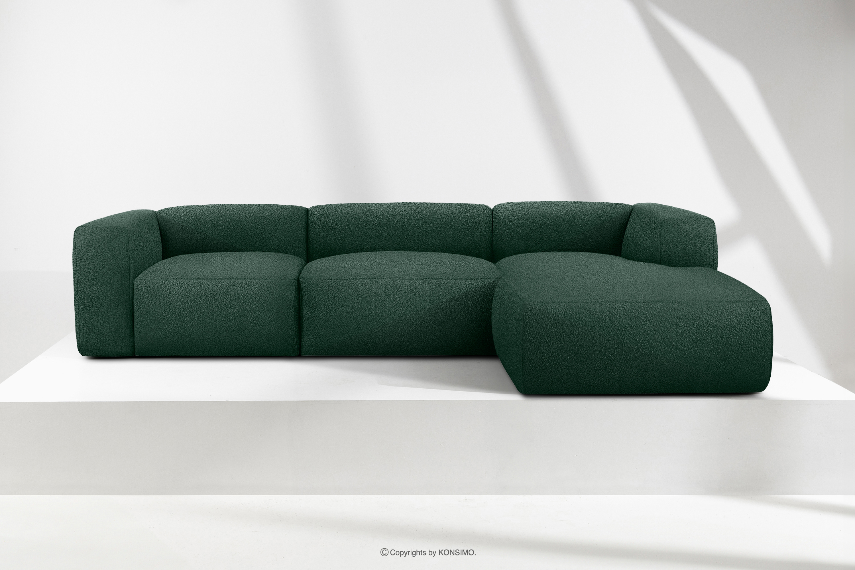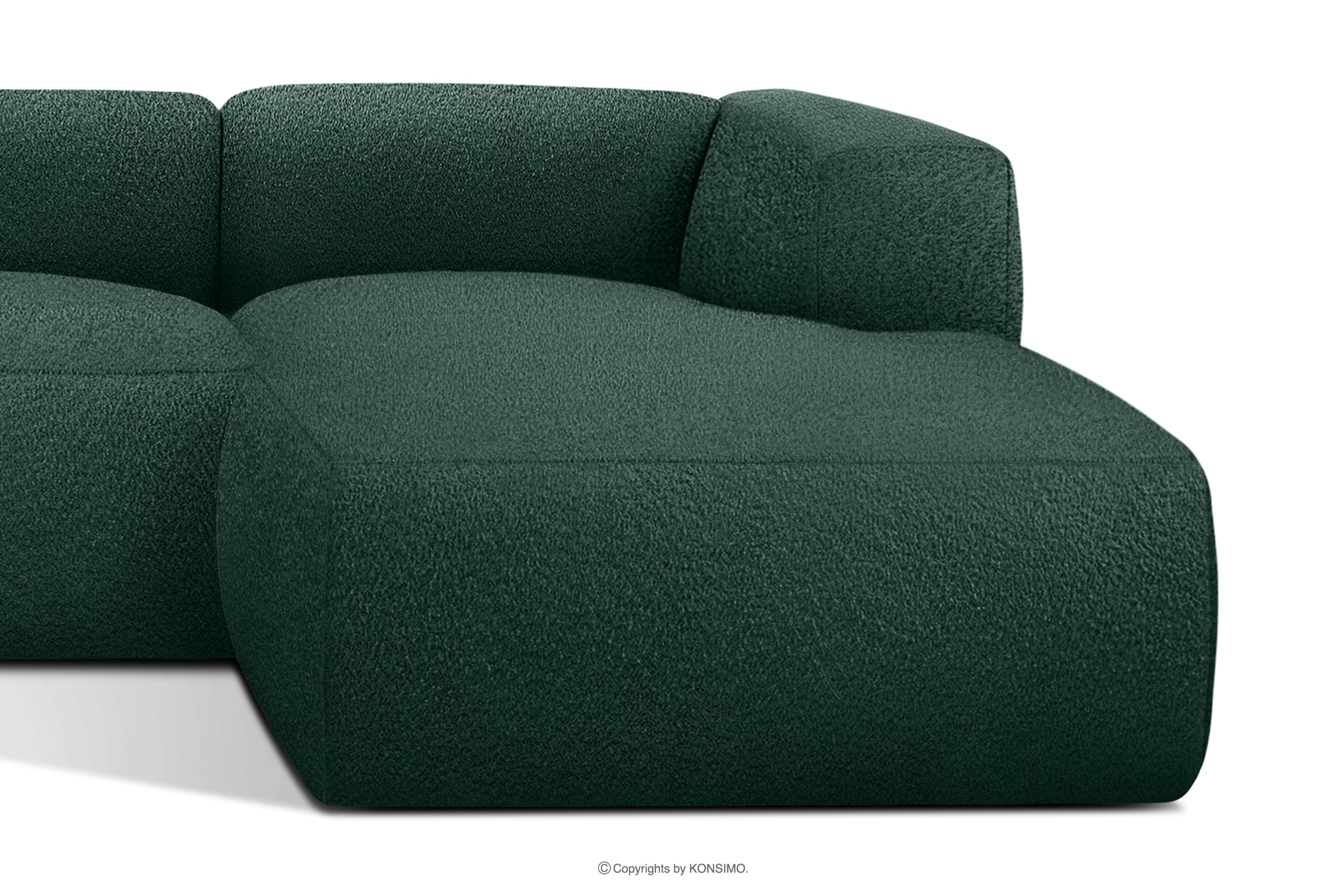 BUFFO Objav celú kolekciu Veľká mäkká rohová pohovka z bouclé tkaniny pravá tmavozelená- farba tmavě zelená