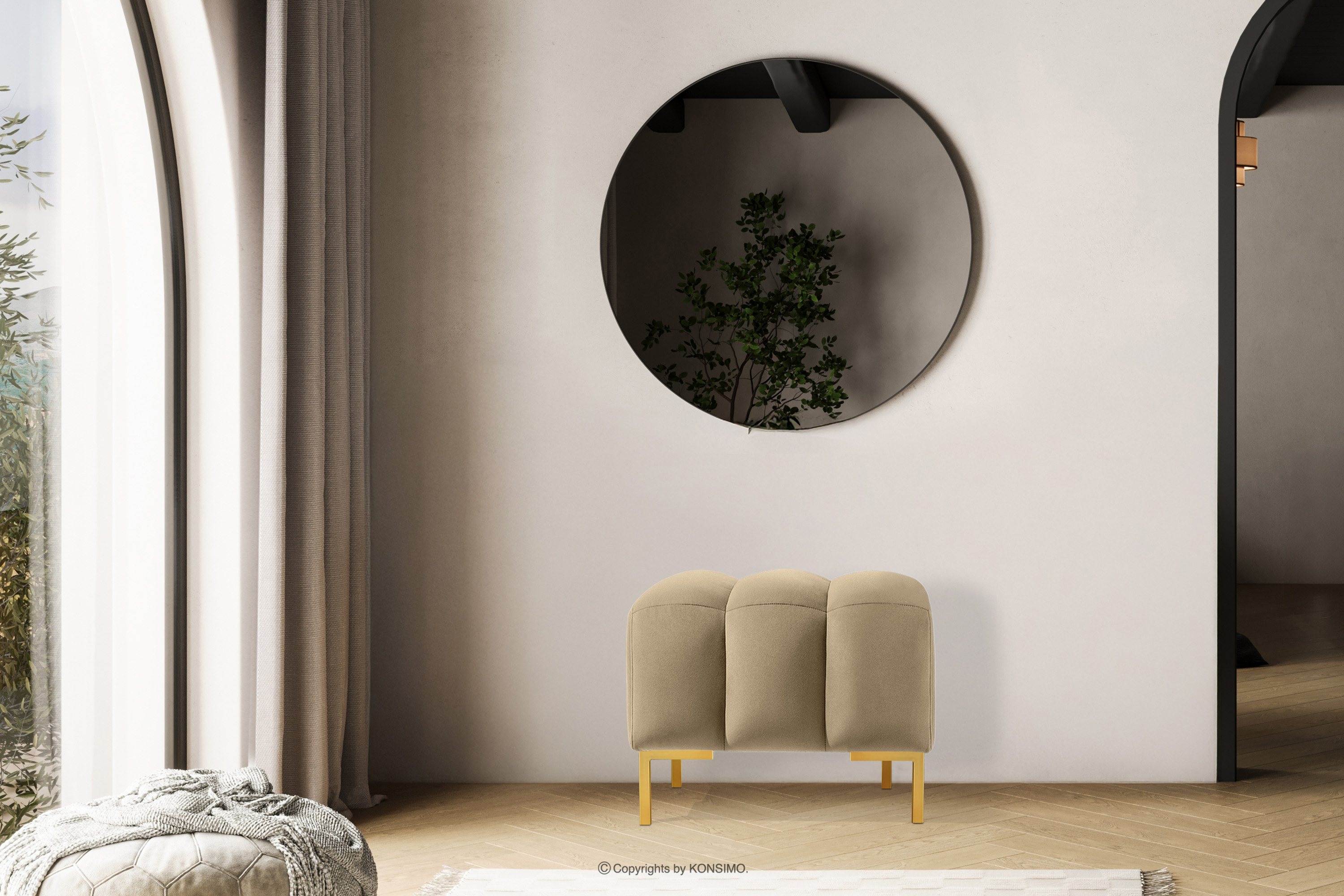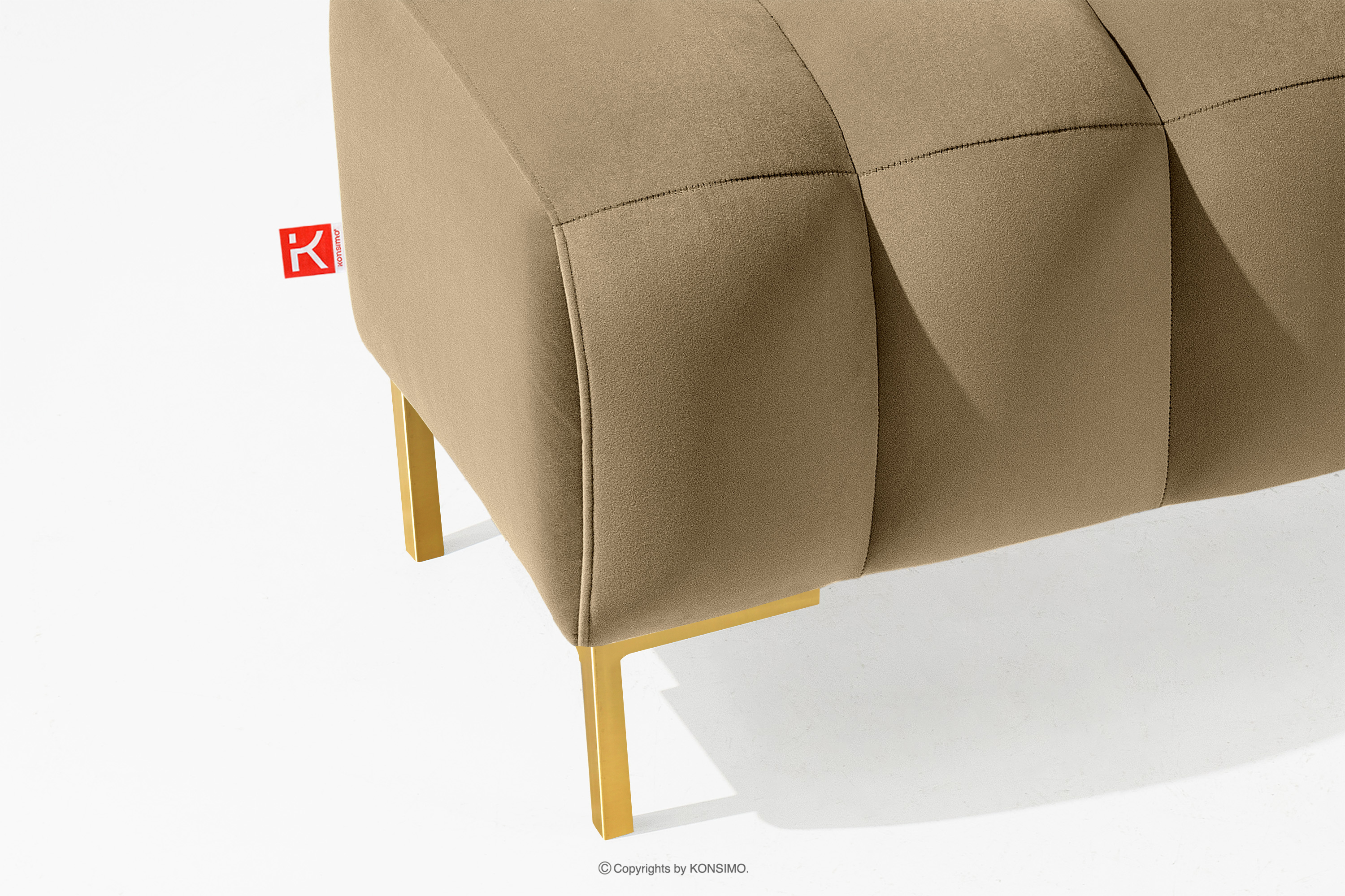 Puf na vysokých zlatých nožičkách elegantnej béžovej farby spája funkčnosť s estetikou. Vysoké nohy dodávajú celej kompozícii eleganciu a ľahkosť a vytvárajú výrazný kontrast s mäkkým sedadlom. Precízne prešívanie je ďalším prvkom, ktorý dodáva tomuto kusu nábytku jedinečný charakter. Starostlivé detaily a pozornosť venovaná každému švu robia z pufu nielen praktický kus nábytku, ale aj dizajnový kúsok.