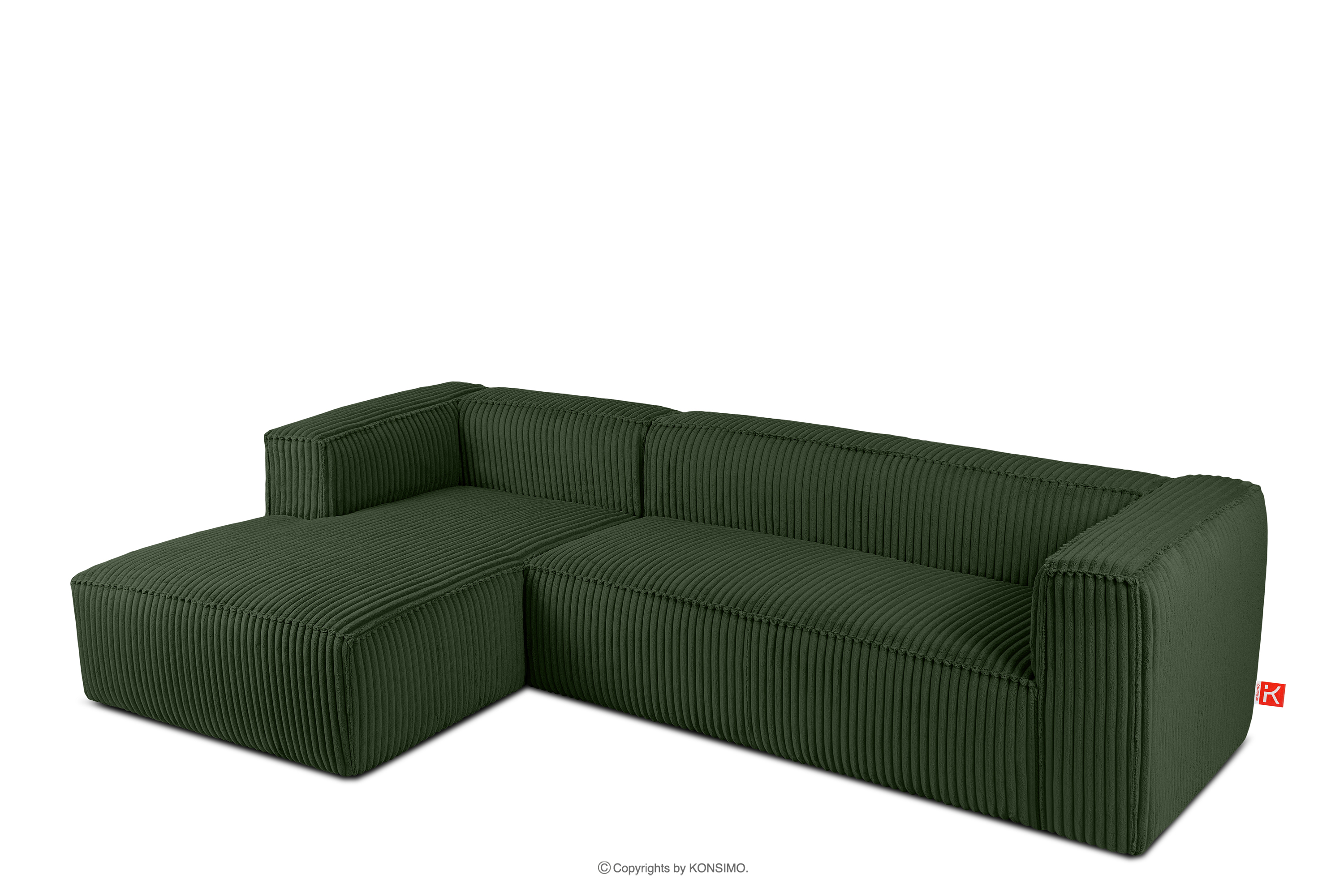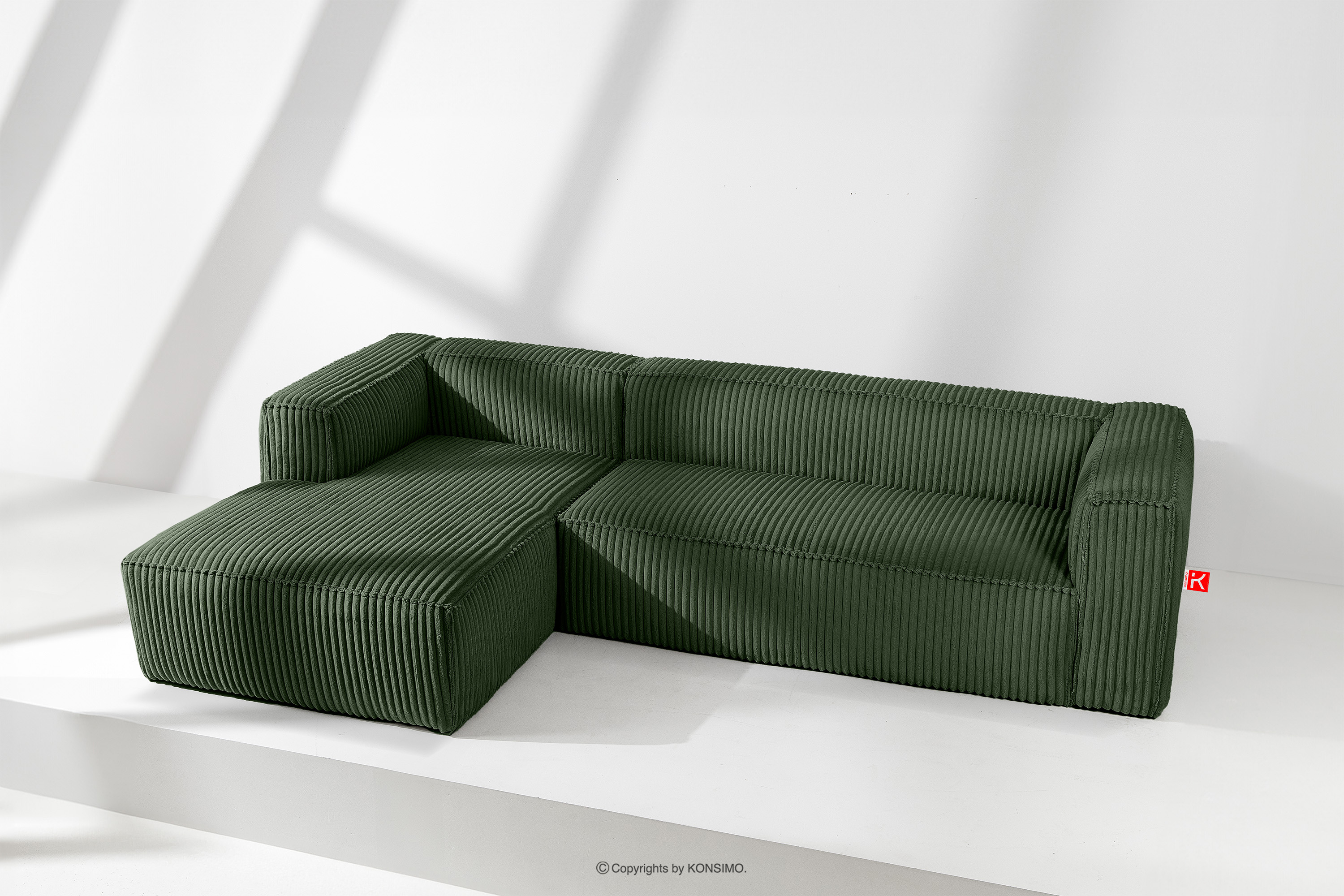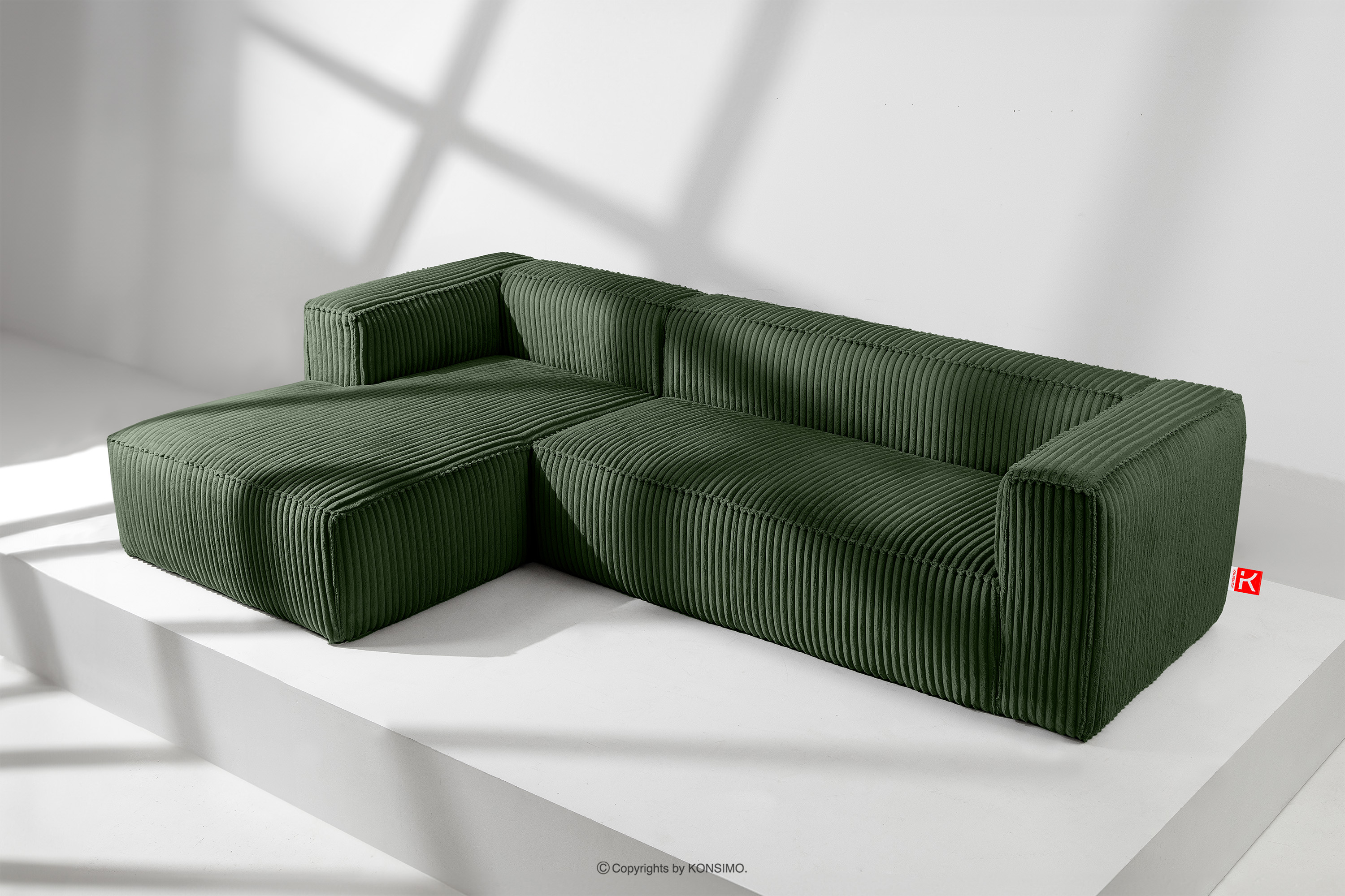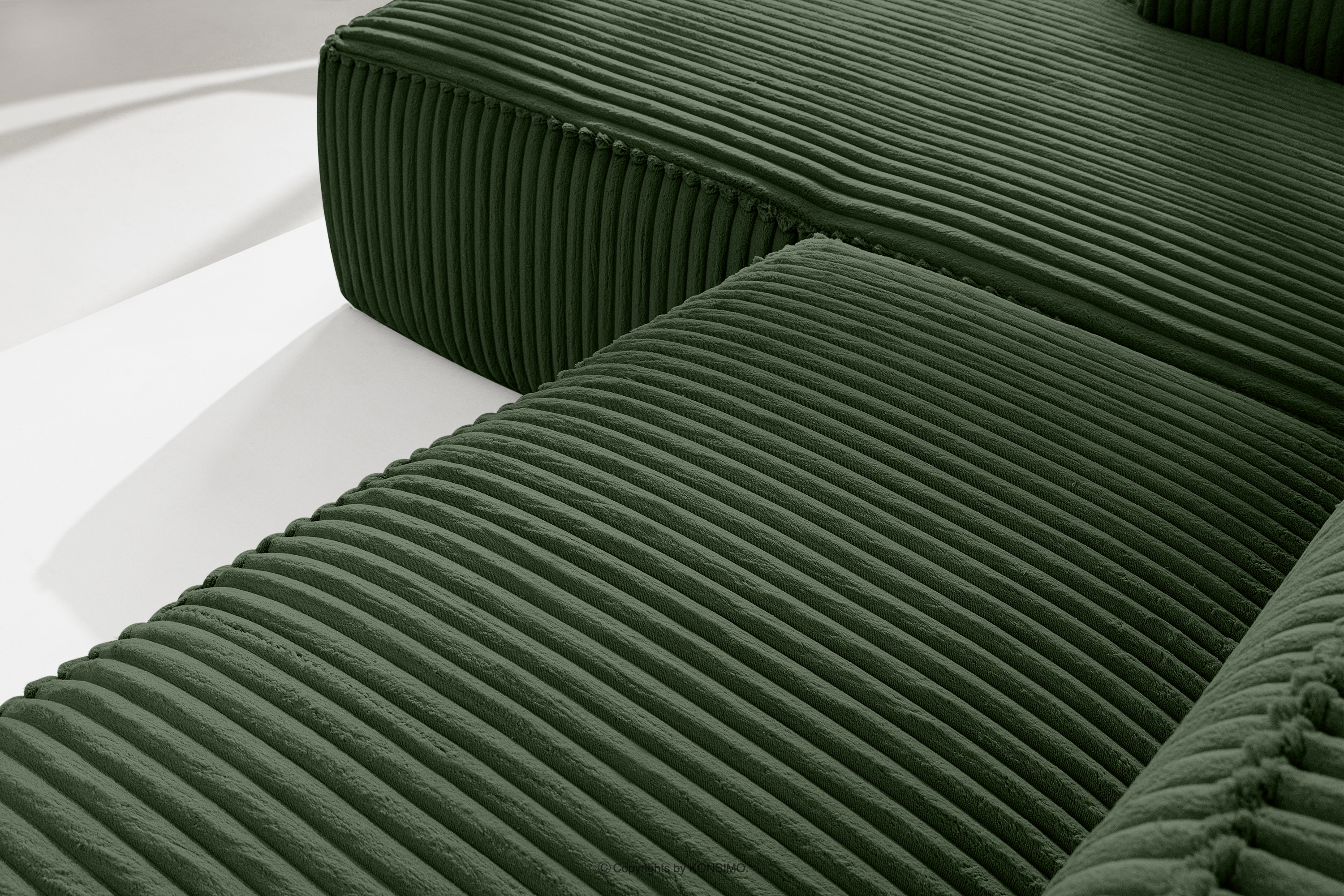 Veľká tmavozelená rohová sedacia súprava z manšestrovej látky vľavo s pevnou konštrukciou a jedinečným dizajnom. Rám tohto elegantného kusu nábytku bol vyrobený z kombinácie borovicového a bukového dreva, čo zaručuje nielen estetický vzhľad, ale aj odolnosť na dlhé roky. Interiér podporuje pevná konštrukcia na báze drevotrieskových a drevovláknitých dosiek, ktorá zaručuje stabilitu a komfort pri používaní.