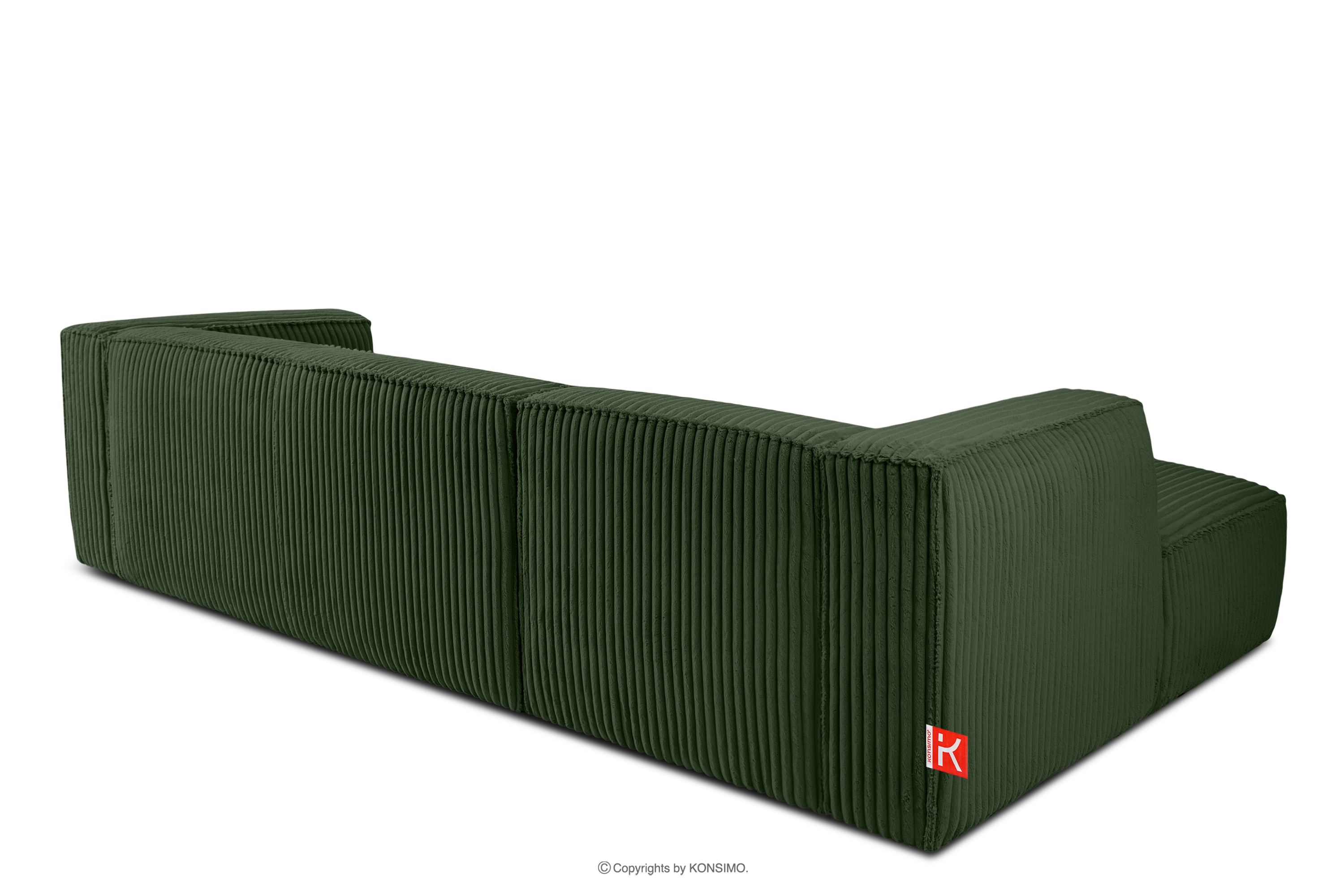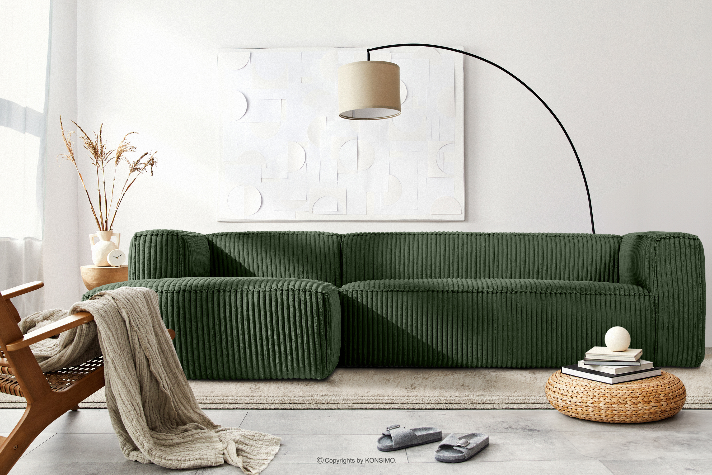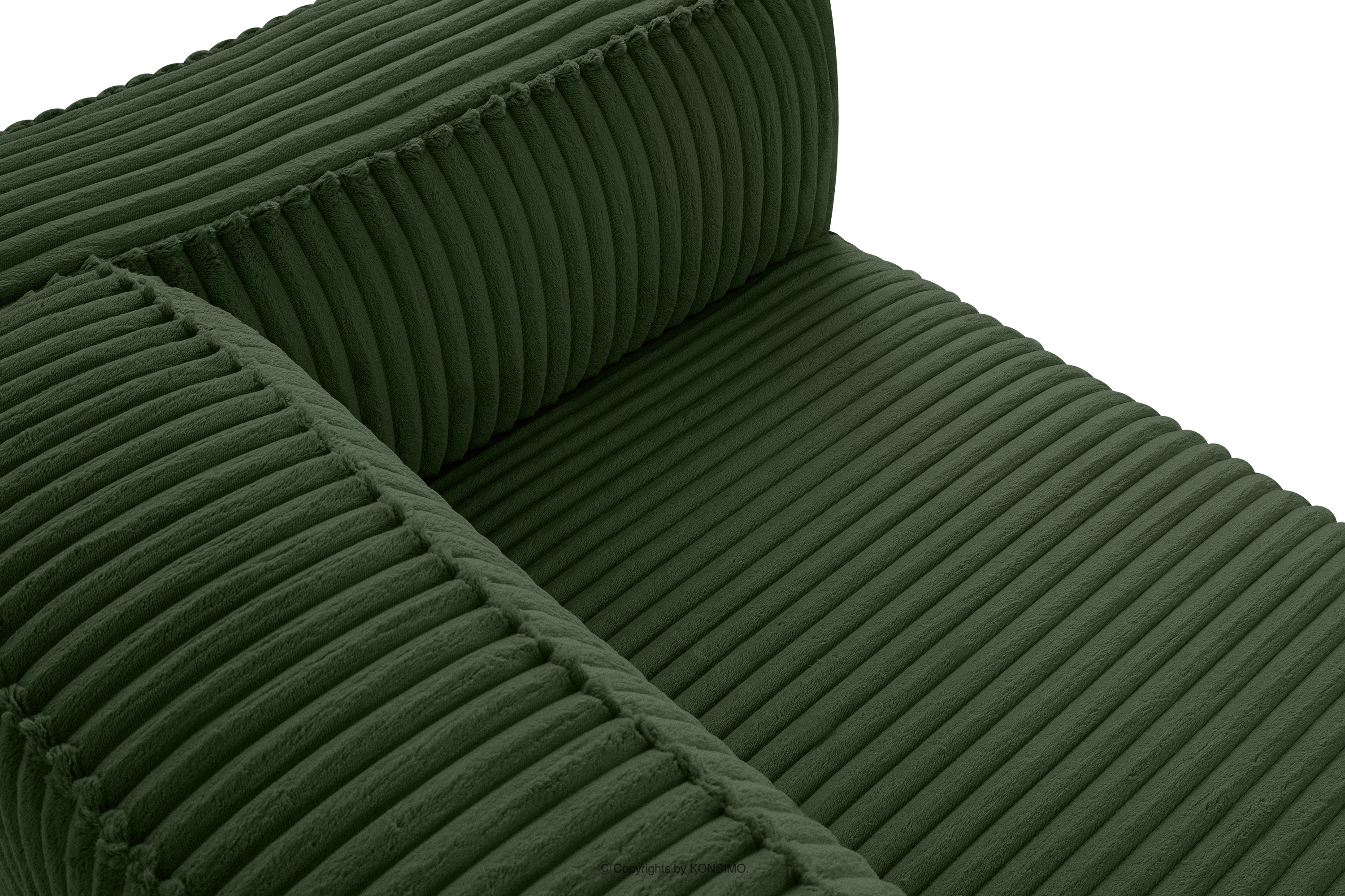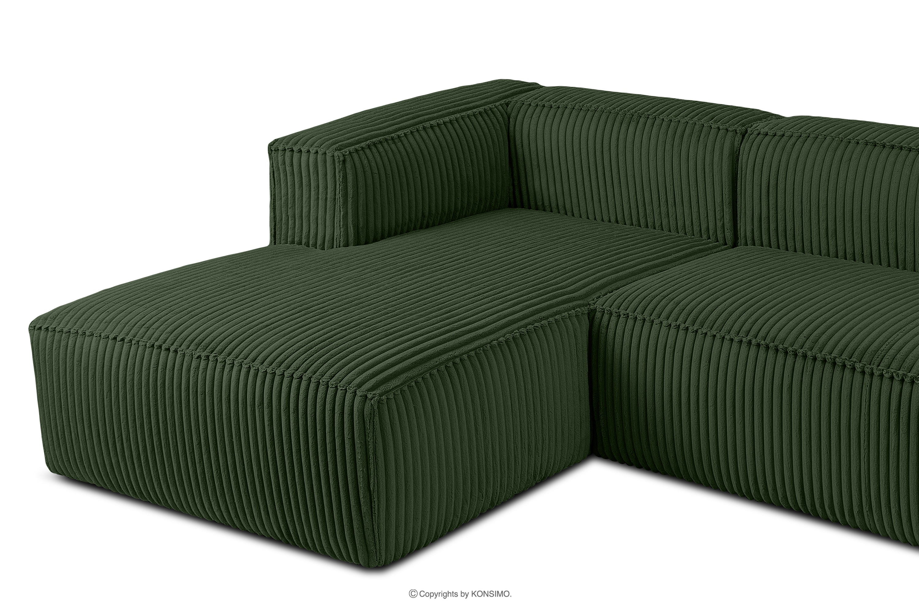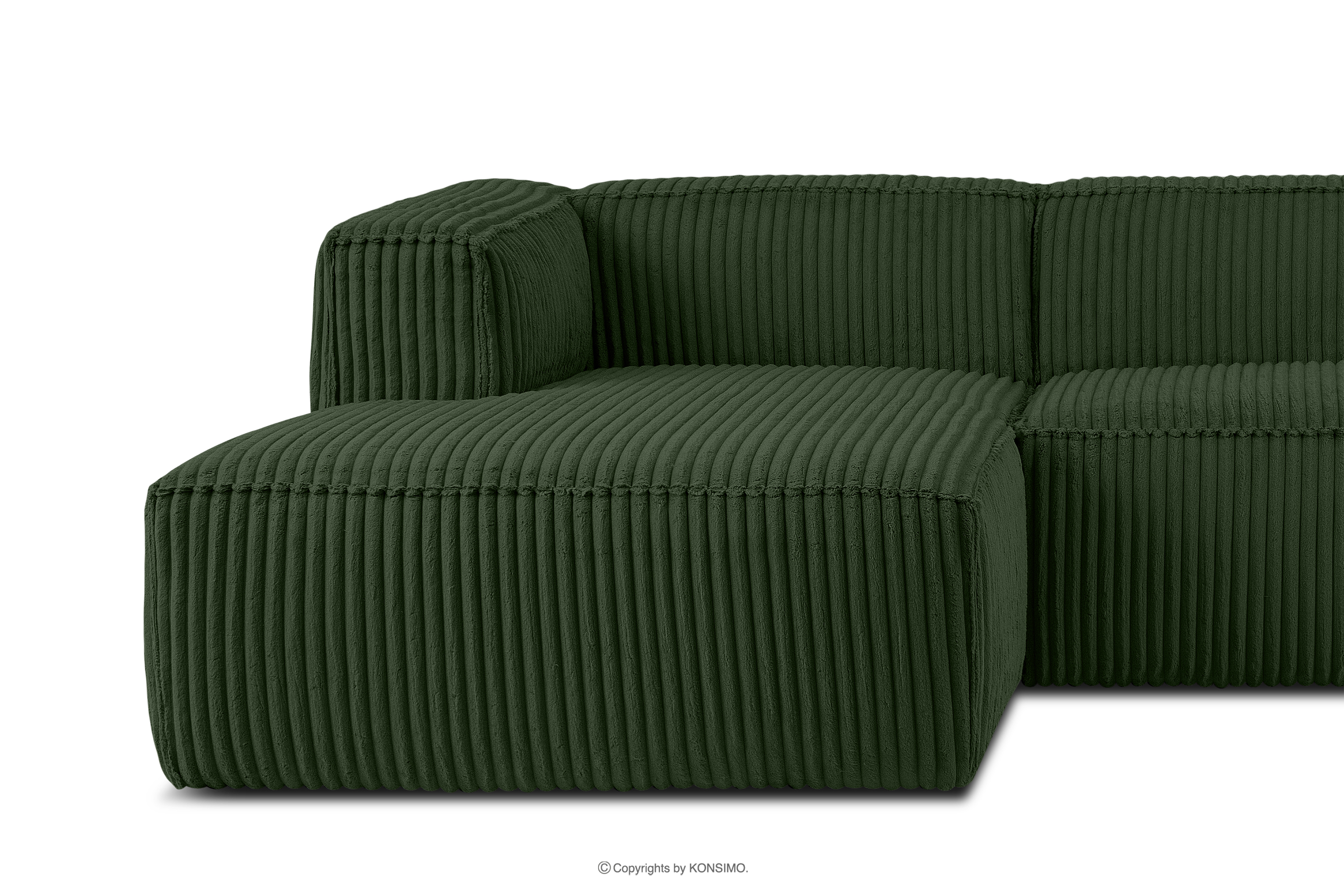 Veľká tmavozelená rohová sedacia súprava z manšestrovej látky vľavo s pevnou konštrukciou a jedinečným dizajnom. Rám tohto elegantného kusu nábytku bol vyrobený z kombinácie borovicového a bukového dreva, čo zaručuje nielen estetický vzhľad, ale aj odolnosť na dlhé roky. Interiér podporuje pevná konštrukcia na báze drevotrieskových a drevovláknitých dosiek, ktorá zaručuje stabilitu a komfort pri používaní.
