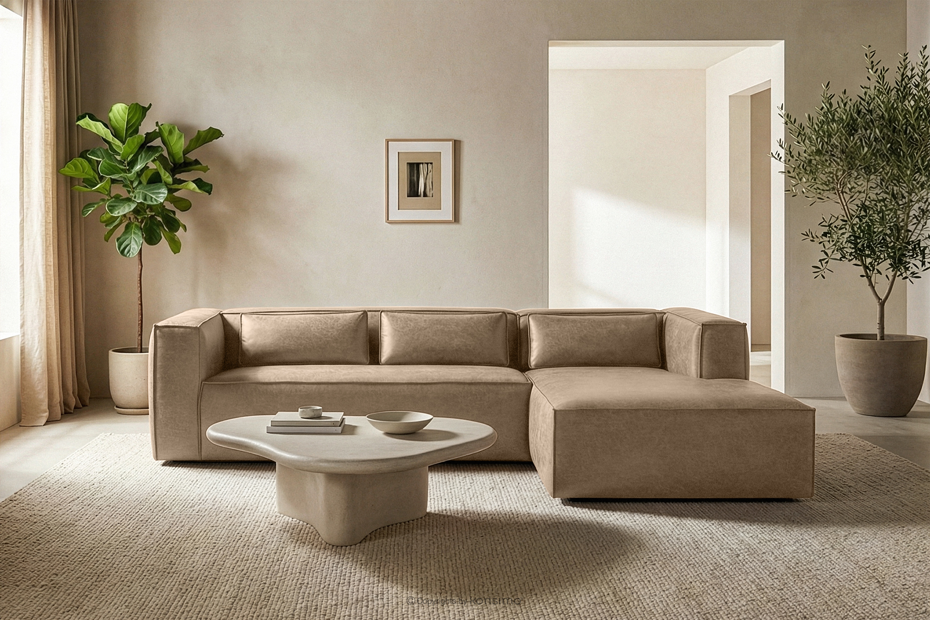 FEROX Objav celú kolekciu Rohová pohovka v štýle loft látka podobná koži béžová pravá- farba béžová