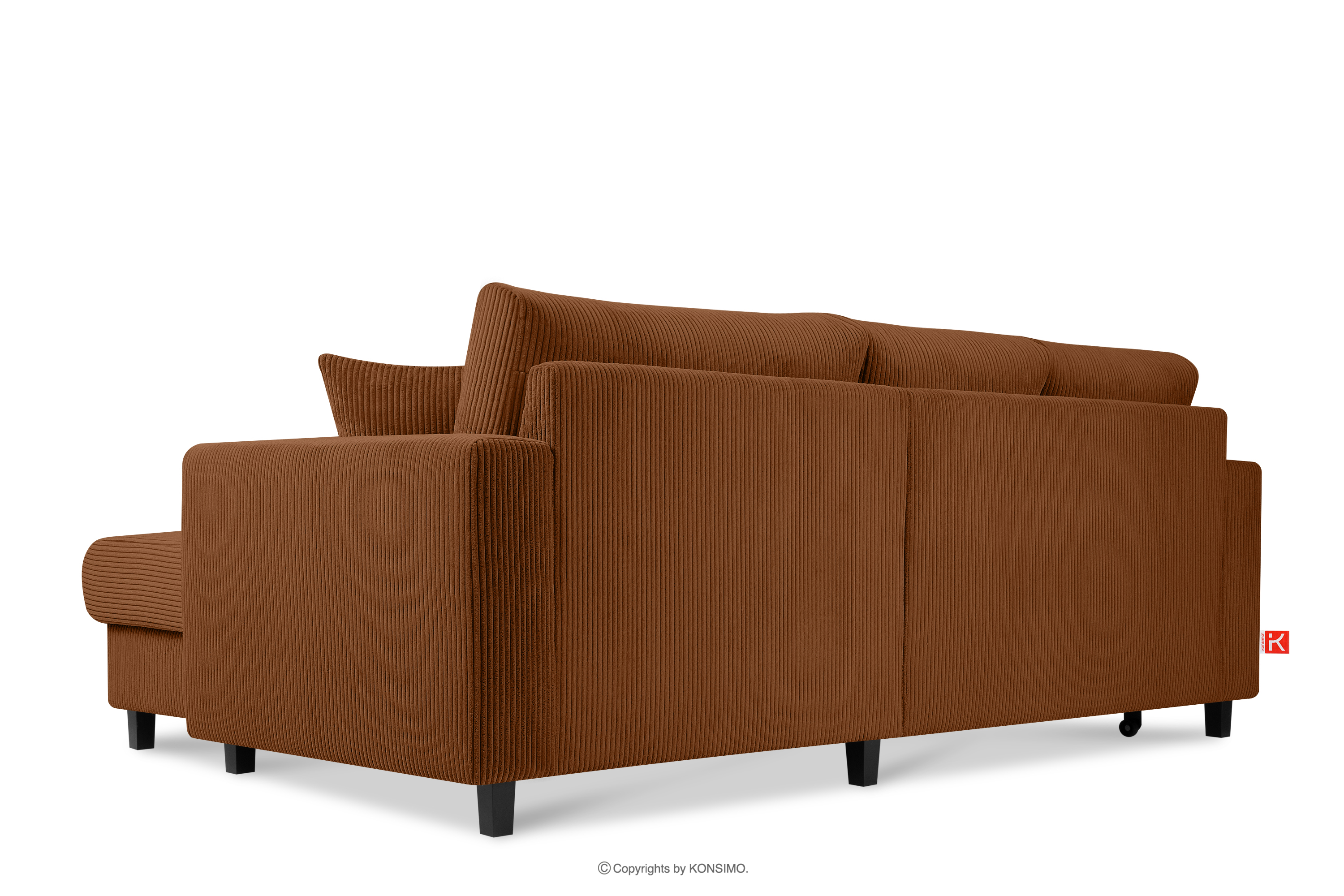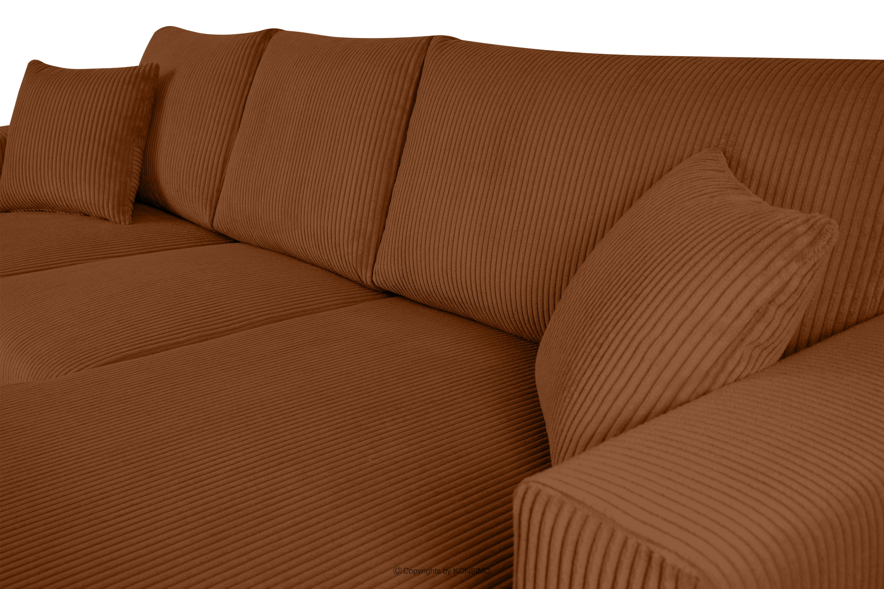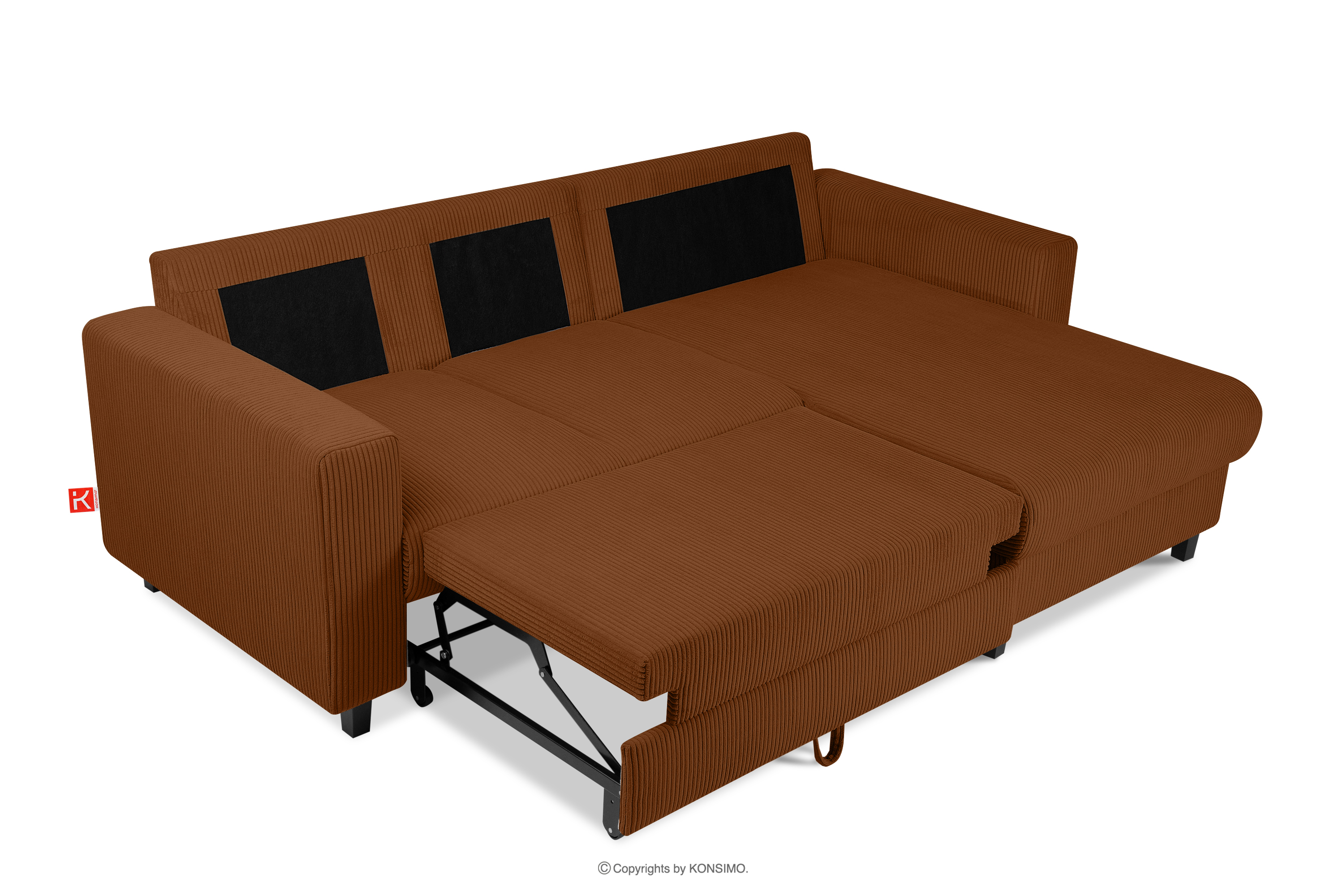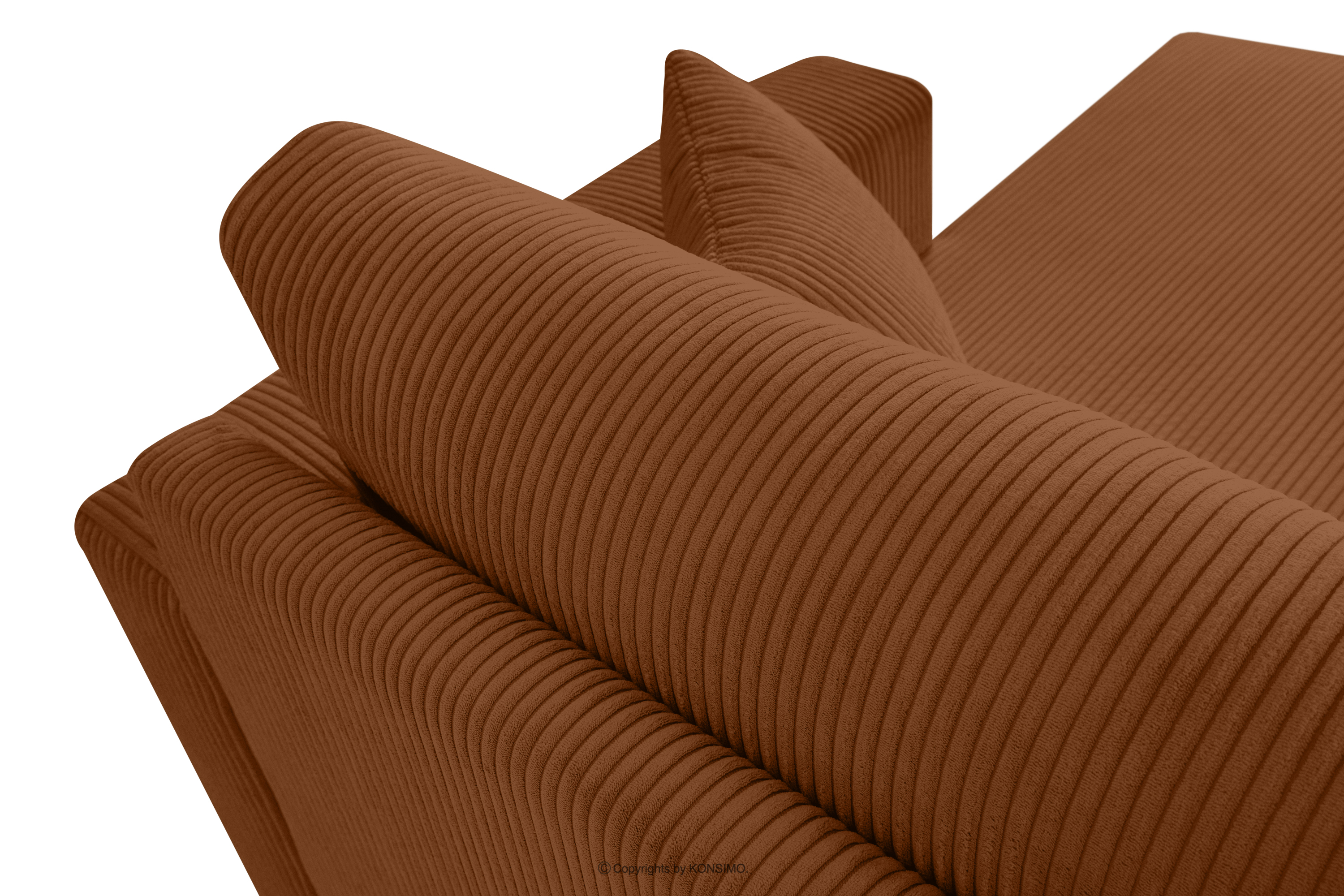 Rozkladacia rohová pohovka na manšestrových nožičkách v rude vpravo je jedinečnou kombináciou funkčnosti, pohodlia a elegancie. Rám z borovicového a bukového dreva zaručuje odolnosť a pevnosť konštrukcie, vďaka čomu je nábytok ideálny na každodenné používanie. Materiály použité pri výrobe, ako sú drevotrieskové a drevovláknité dosky, boli starostlivo vybrané, aby sa zabezpečila ich dlhodobá použiteľnosť.