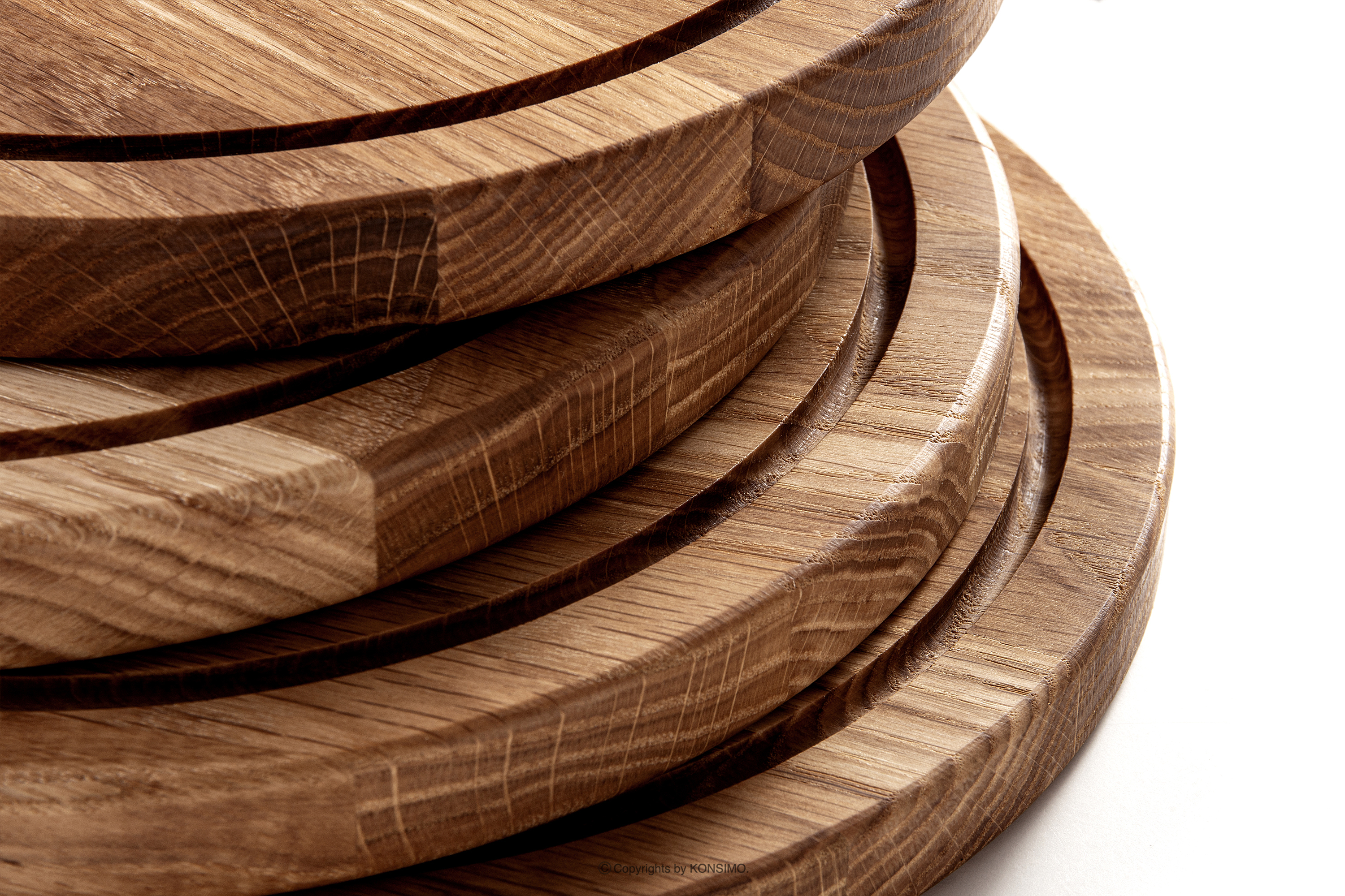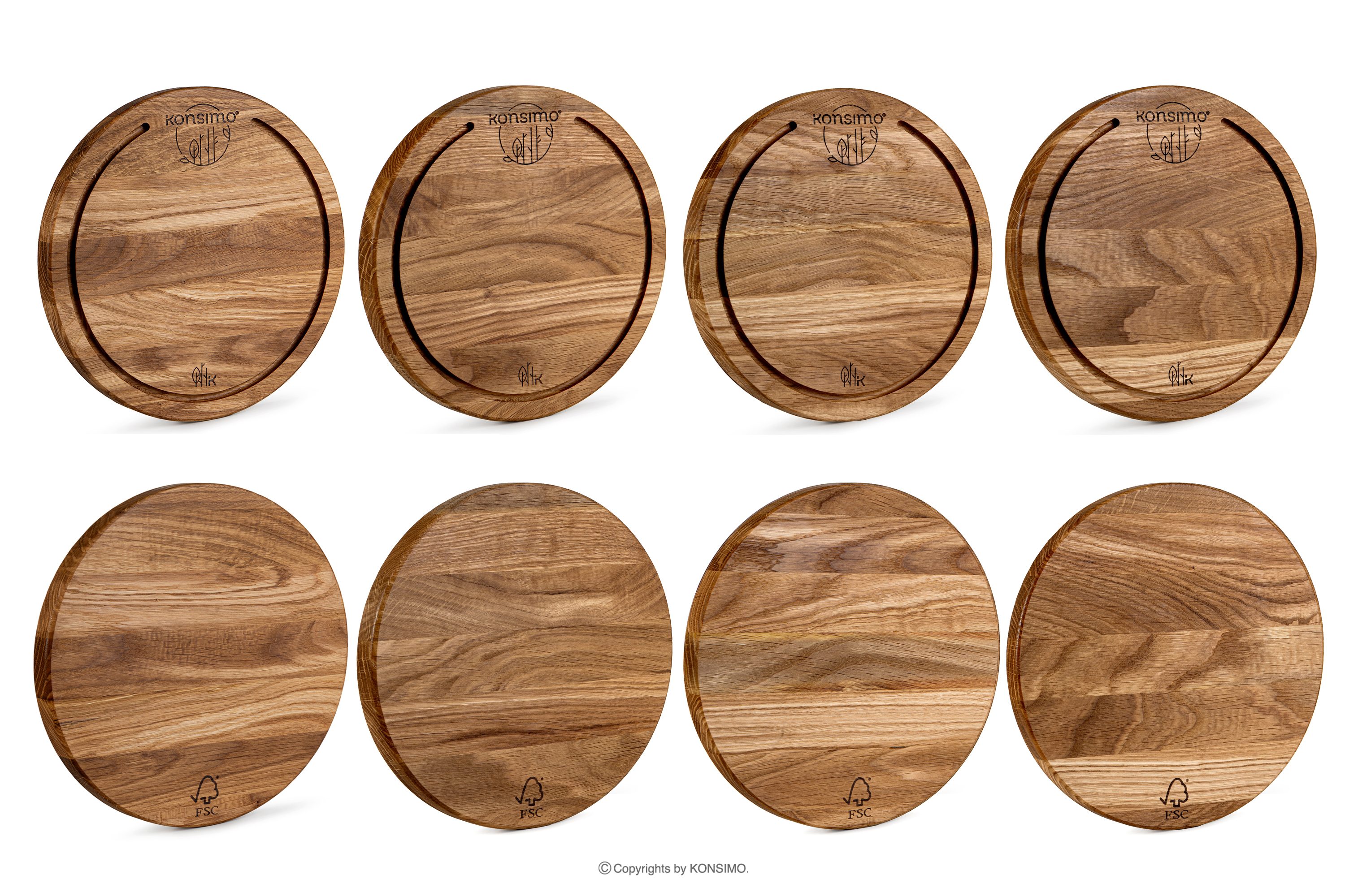 Táto súprava 4 dosiek na krájanie s dubovým stojanom je nielen praktická na používanie, ale slúži aj ako dizajnový doplnok na servírovanie občerstvenia alebo pokrmov. Jej kruhový tvar vyrobený z dubového dreva najvyššej kvality dodáva eleganciu, ako aj odolnosť a pevnosť. Vďaka tomu je ideálny na krájanie rôznych produktov bez otupenia nožov.