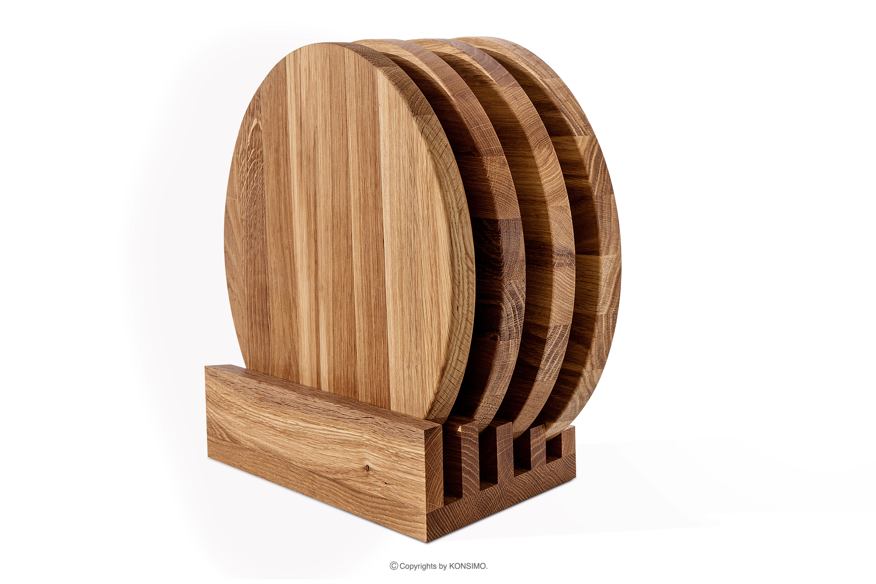 Krájacie dosky 4 ks s dubovým stojanom sú nielen praktické na používanie, ale slúžia aj ako dizajnový doplnok na servírovanie občerstvenia alebo pokrmov. Jej okrúhly tvar vyrobený z dubového dreva najvyššej kvality dodáva eleganciu, ako aj odolnosť a pevnosť. Vďaka tomu je ideálny na krájanie rôznych produktov bez otupenia nožov. Olejované dubové drevo dodáva doske prirodzený, teplý vzhľad, ktorý dokonale zapadne do každého interiéru.