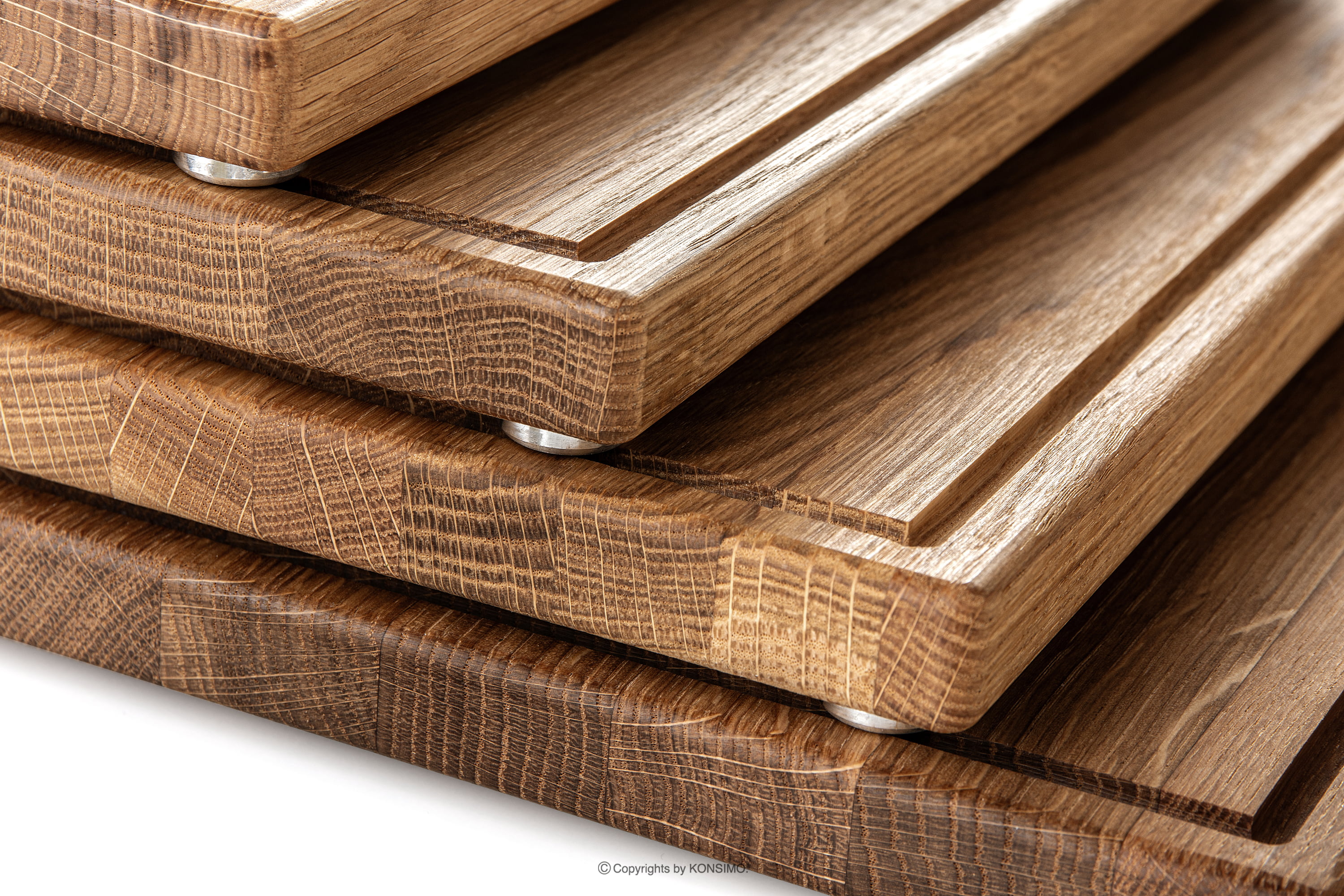 Súprava 4 ks obdĺžnikových dosiek na krájanie z olejovaného dubového dreva je kombináciou funkčnosti, elegancie a odolnosti. Vyznačujú sa precíznym spracovaním vďaka ručnej výrobe zručných remeselníkov. Farebné prevedenie olejovaný dub im dodáva prirodzený, teplý vzhľad, ktorý sa dokonale hodí do každého interiéru. Hliníkové nožičky zabezpečujú, aby sa doska nešmýkala a bola stabilná počas používania.