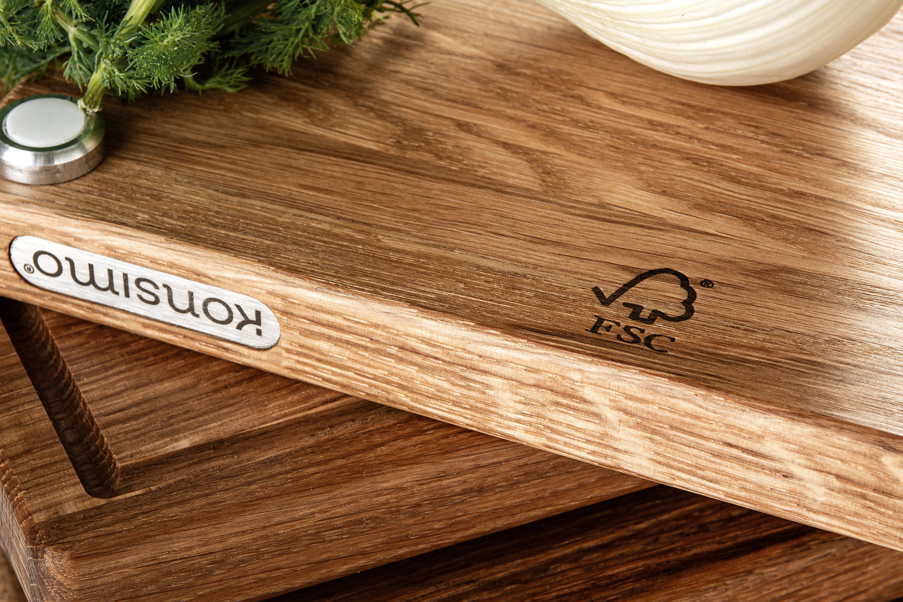 Drevo použité pri výrobe je vykorenené a vysušené tak, aby sa dosiahla 8 % vlhkosť. To zaručuje, že sa vaše nože neotupia tak rýchlo ako pri doskách vyrobených z iných surovín. Dubové drevo pochádza zo zdrojov s certifikátom FSC, čo zaručuje, že je nielen estetické, ale aj ekologické.