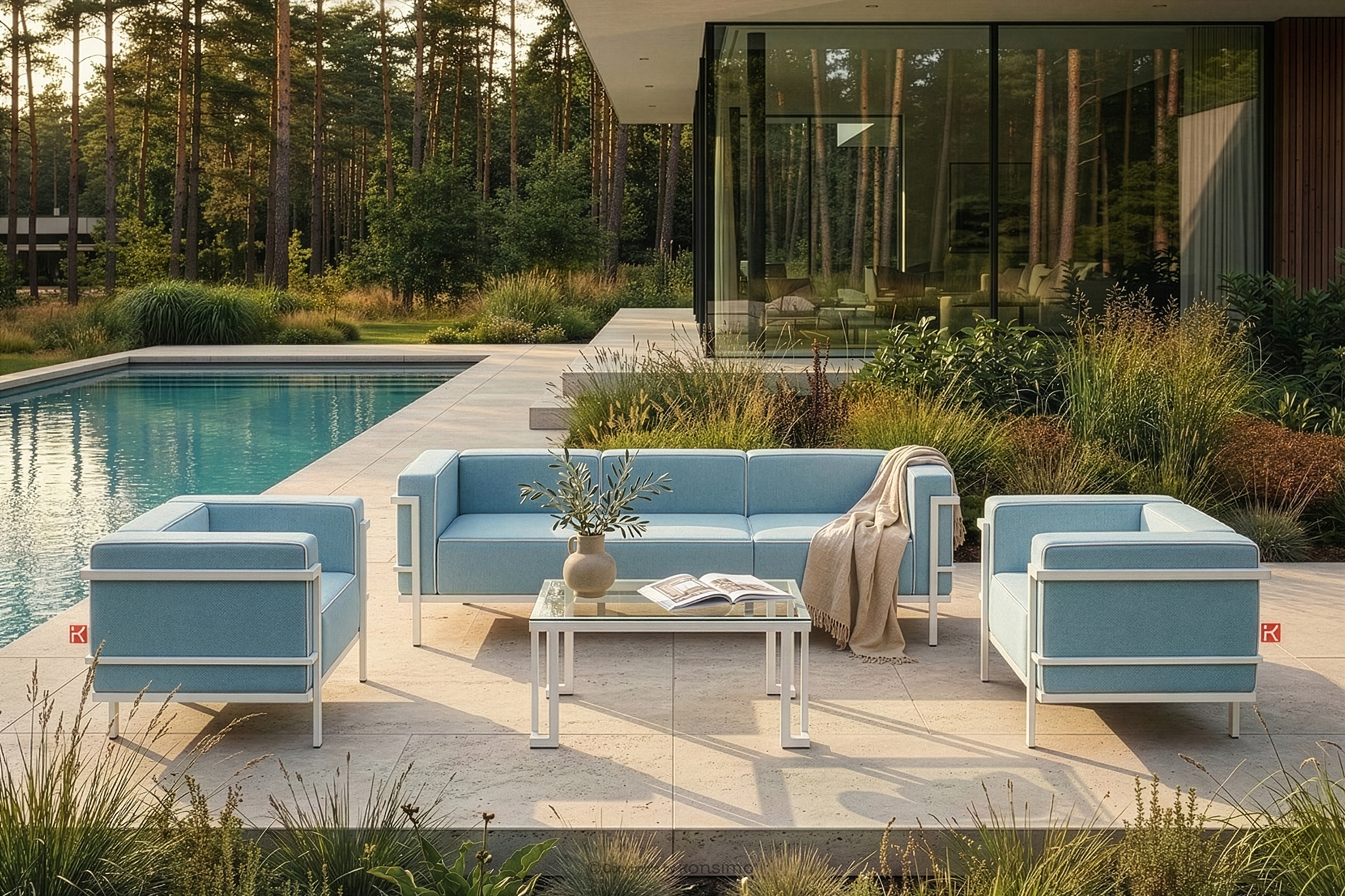 Záhradný nábytok: 2 kreslá, trojmiestna pohovka, konferenčný stolík v bielej/morskej modrej/bielej farbe je vyrobená z odolnej ocele, ktorá nielen dodáva priestoru eleganciu, ale poskytuje aj výnimočný komfort. Vďaka mäkkému penovému sedadlu a operadlu sa relaxovanie vonku stáva skutočným potešením. Nábytok je umiestnený na pevných oceľových nohách s práškovým náterom, ktoré zaisťujú stabilitu aj pri intenzívnom používaní.