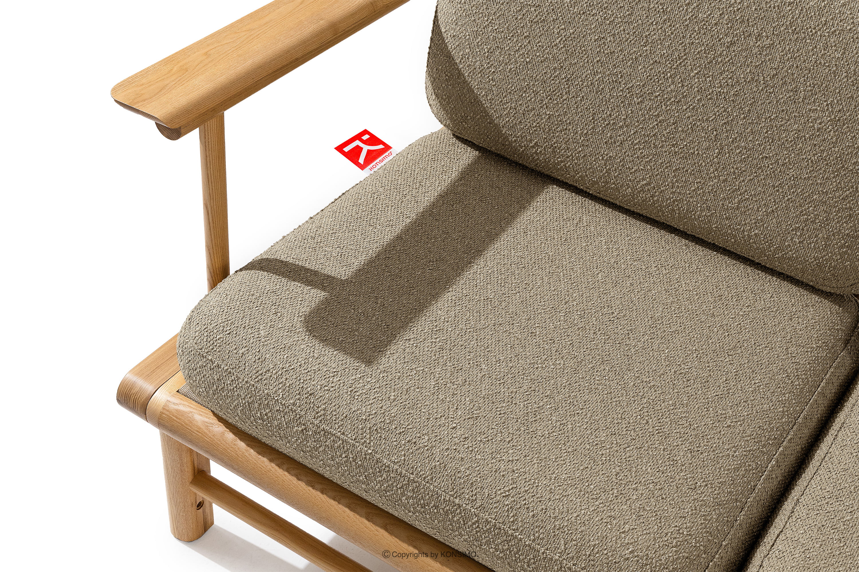 Béžová dvojmiestna záhradná pohovka z jaseňového dreva je jedinečný výrobok, ktorý ozdobí váš priestor. Vankúše sedadla a operadla sú vyplnené vysokokvalitnou PU penou pre jedinečné pohodlie. Poťahová látka obsahujúca 93 % recyklovaného polypropylénu a 7 % polyesteru je nielen šetrná k životnému prostrediu, ale aj jednoduchá na údržbu - stačí ju utrieť vlhkou handričkou.