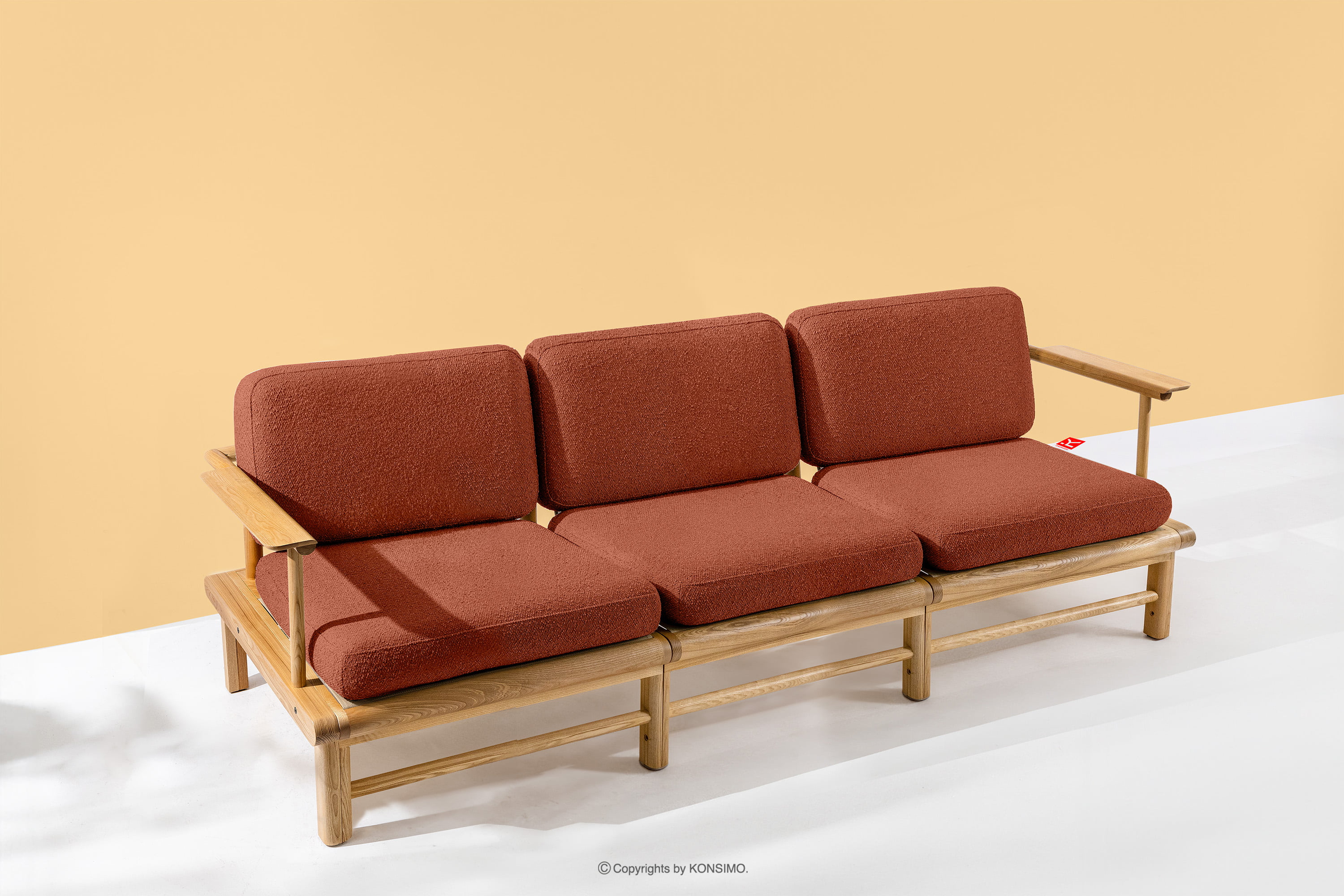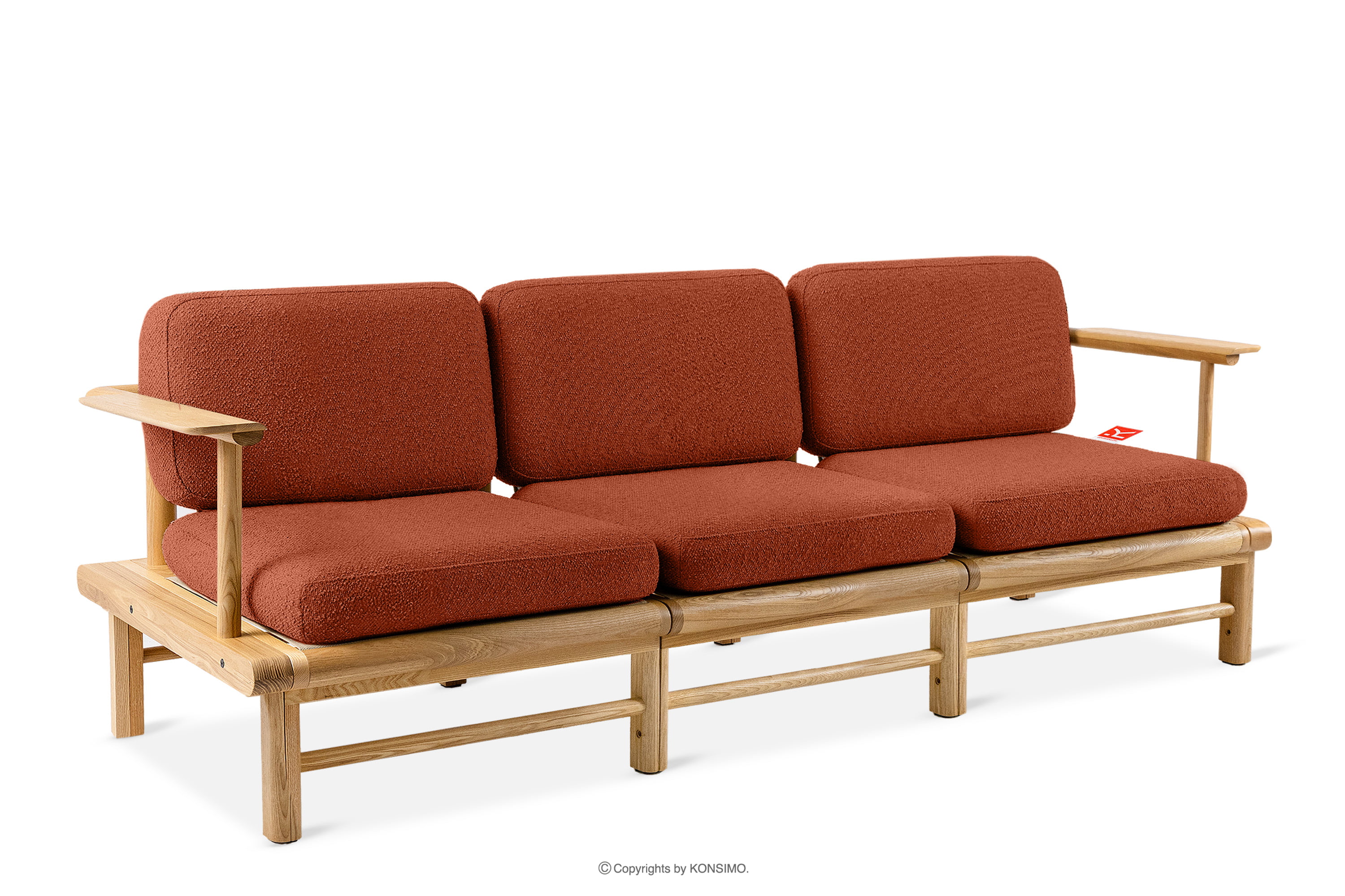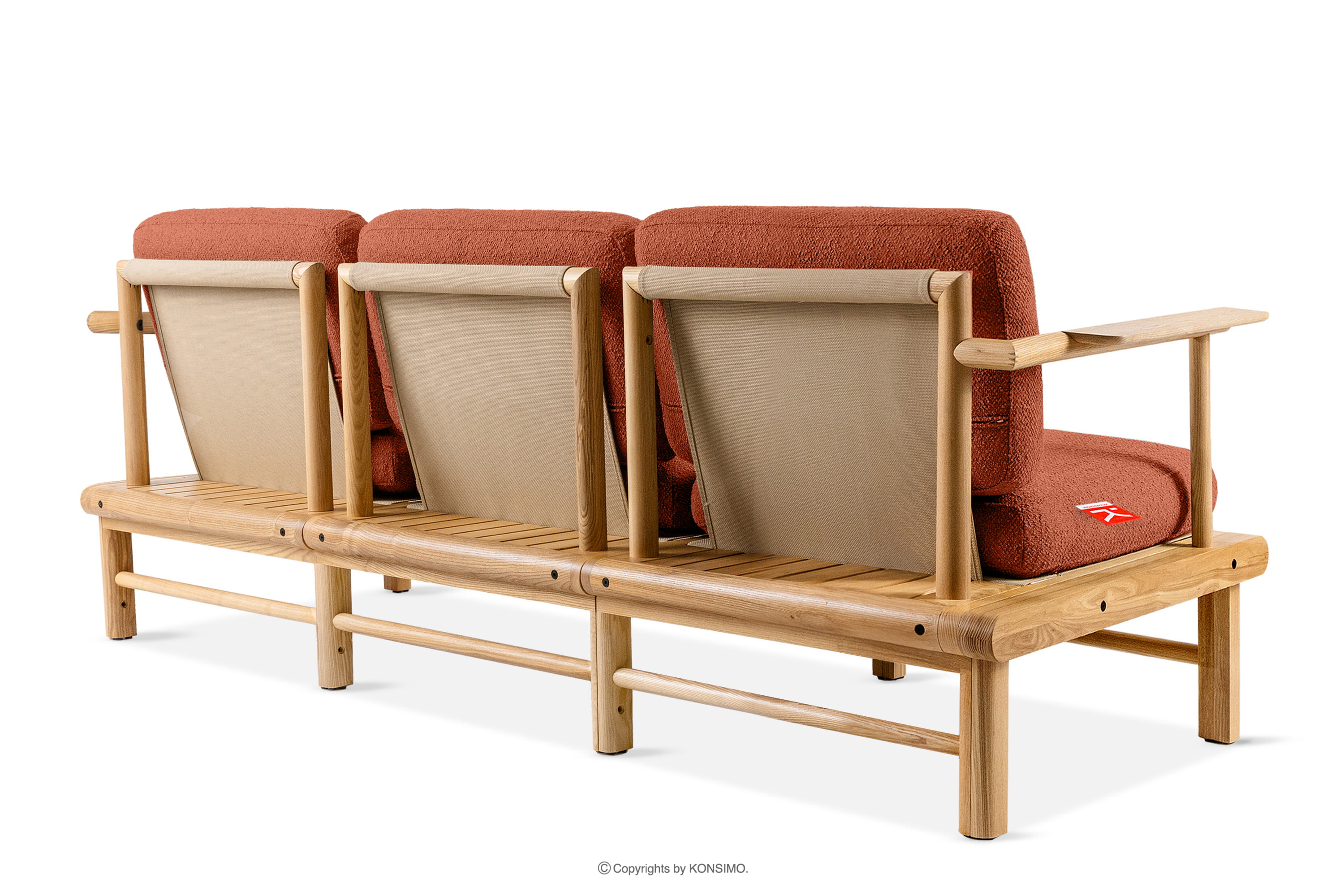 Záhradná pohovka 3 z jaseňového dreva v boho štýle oranžovej farby je jedinečný výrobok, ktorý ozdobí váš priestor. Vankúše sedadla a operadla sú vyplnené vysokokvalitnou PU penou pre jedinečné pohodlie. Poťahová látka obsahujúca 93 % recyklovaného polypropylénu a 7 % polyesteru je nielen šetrná k životnému prostrediu, ale aj jednoduchá na údržbu - stačí ju utrieť vlhkou handričkou.