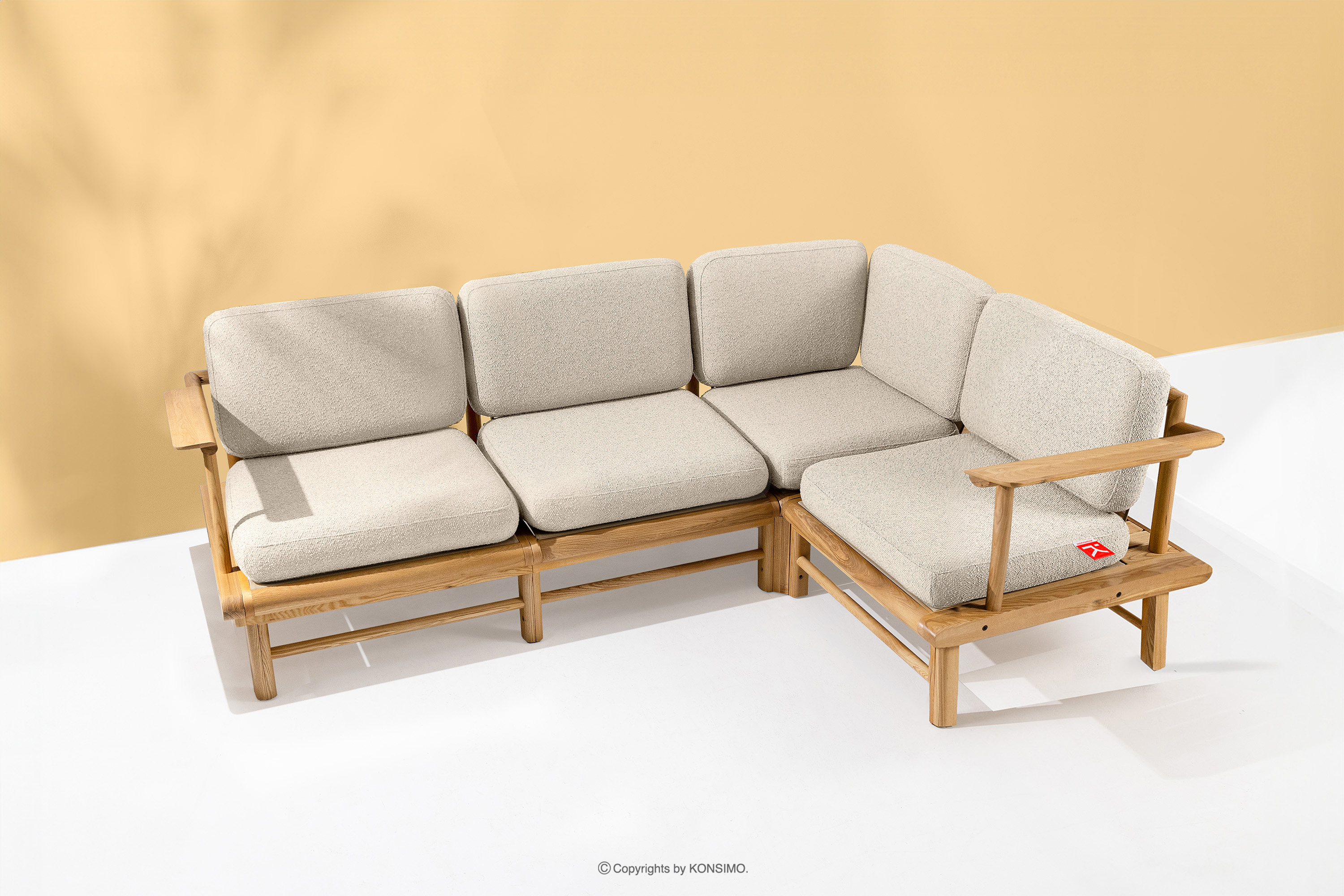 Záhradný roh z jaseňového dreva krémový pravý je jedinečný výrobok, ktorý ozdobí váš priestor. Sedáky a operadlá sú vyplnené kvalitnou PU penou pre jedinečné pohodlie. Poťahová látka obsahujúca 93 % recyklovaného polypropylénu a 7 % polyesteru je nielen šetrná k životnému prostrediu, ale aj jednoduchá na údržbu - stačí ju utrieť vlhkou handričkou.