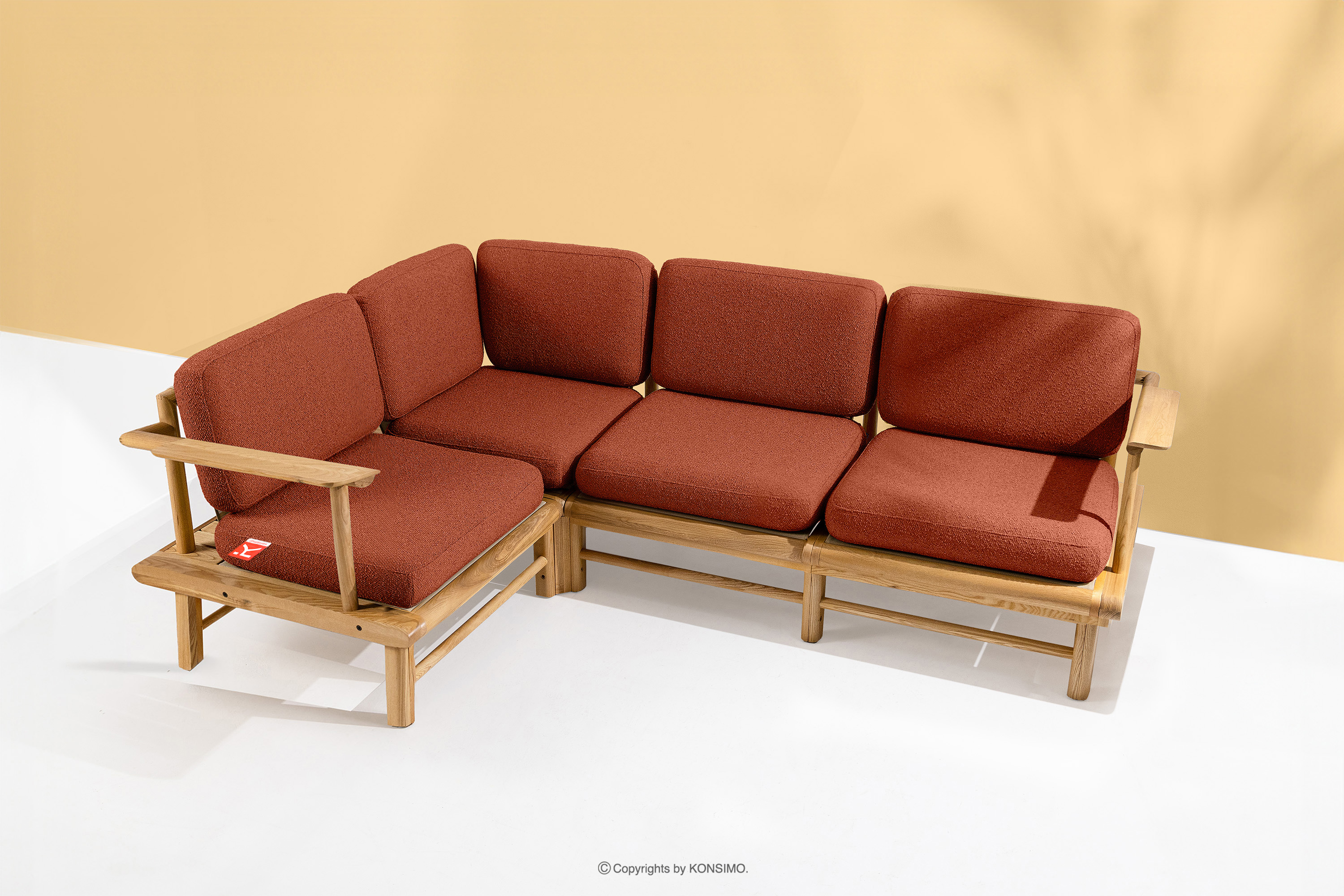 Záhradný roh z jaseňového dreva oranžový ľavý je jedinečný výrobok, ktorý ozdobí váš priestor. Sedáky a operadlá sú vyplnené kvalitnou PU penou pre jedinečné pohodlie. Poťahová látka obsahujúca 93 % recyklovaného polypropylénu a 7 % polyesteru je nielen šetrná k životnému prostrediu, ale aj jednoduchá na údržbu - stačí ju utrieť vlhkou handričkou.