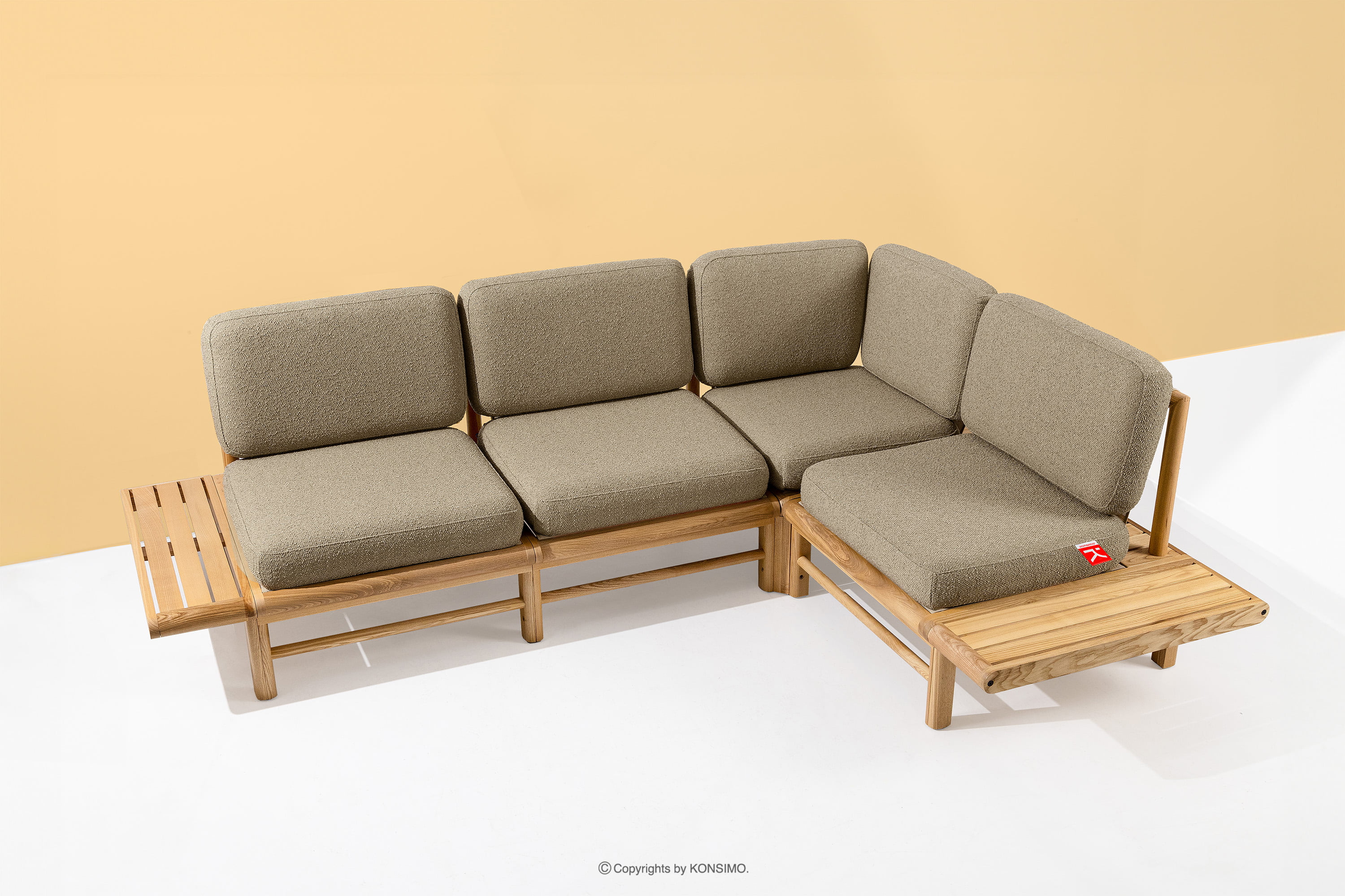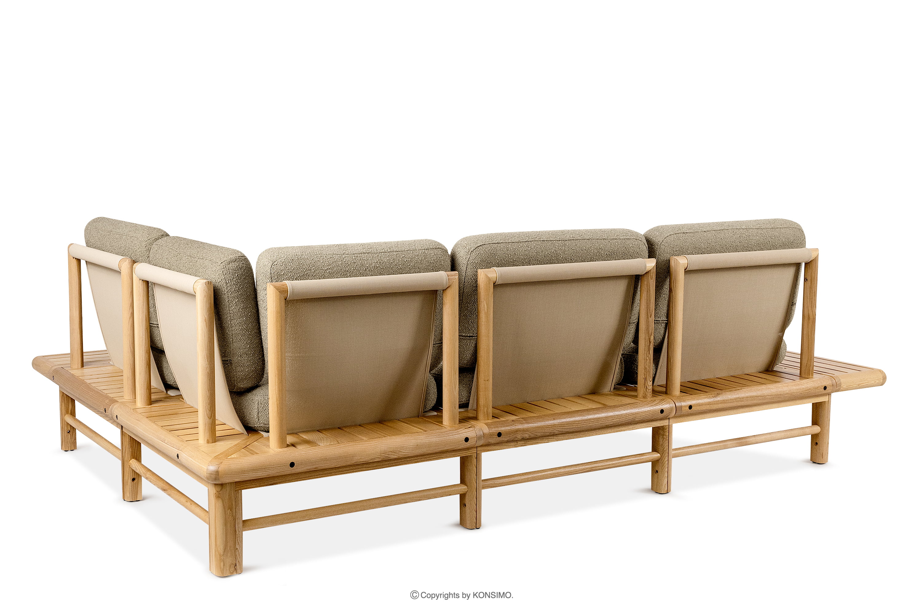 Záhradný kútik boho z masívneho jaseňového dreva béžovej farby vpravo je jedinečný výrobok, ktorý ozdobí váš priestor. Sedáky a operadlá sú vyplnené vysokokvalitnou PU penou pre jedinečné pohodlie. Poťahová látka obsahujúca 93 % recyklovaného polypropylénu a 7 % polyesteru je nielen šetrná k životnému prostrediu, ale aj jednoduchá na údržbu - stačí ju utrieť vlhkou handričkou.