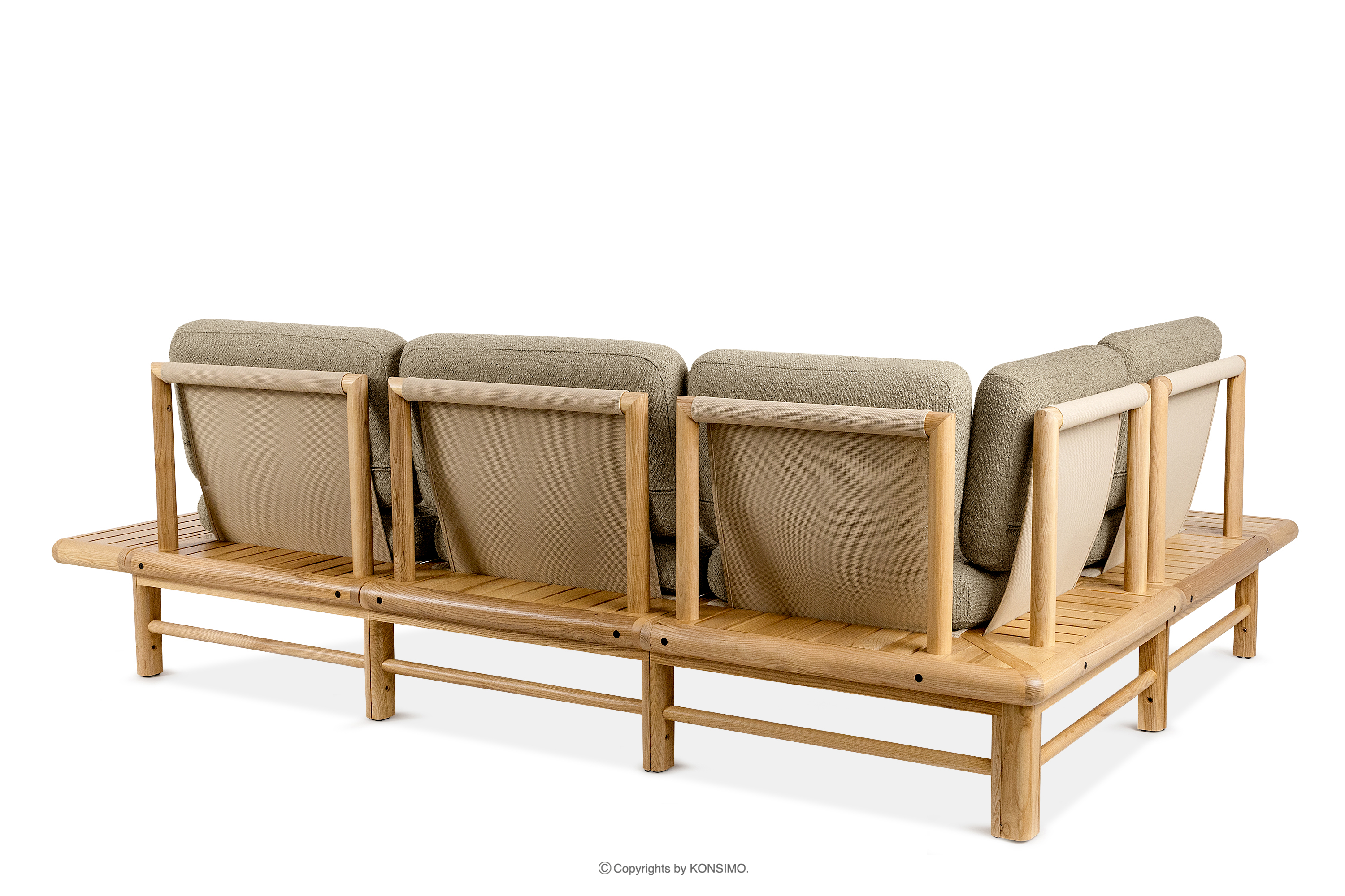 Záhradný kútik boho z masívneho jaseňového dreva béžovej farby vľavo je jedinečný výrobok, ktorý ozdobí váš priestor. Sedáky a operadlá sú vyplnené kvalitnou PU penou pre jedinečné pohodlie. Poťahová látka obsahujúca 93 % recyklovaného polypropylénu a 7 % polyesteru je nielen šetrná k životnému prostrediu, ale aj jednoduchá na údržbu - stačí ju utrieť vlhkou handričkou.