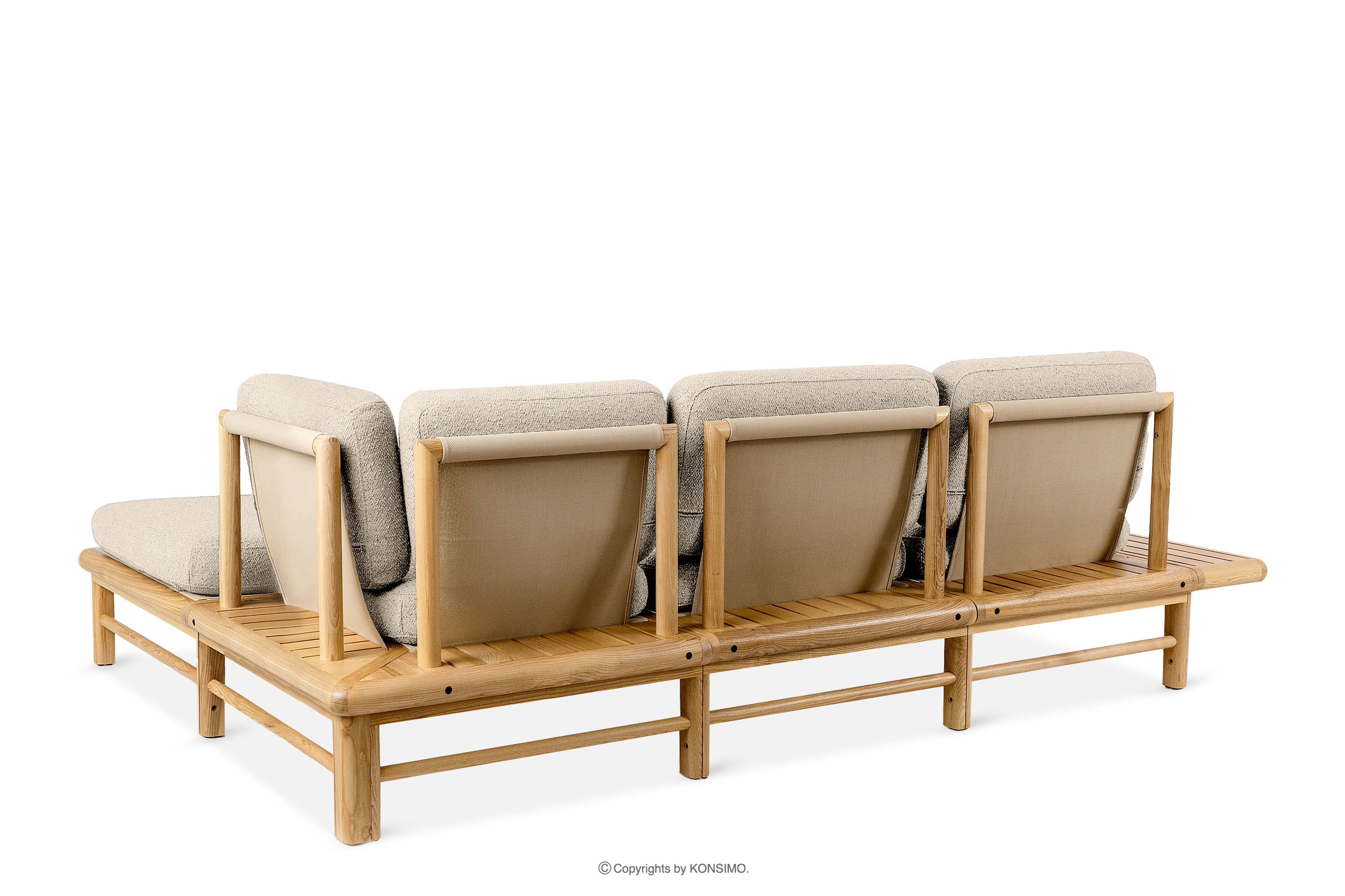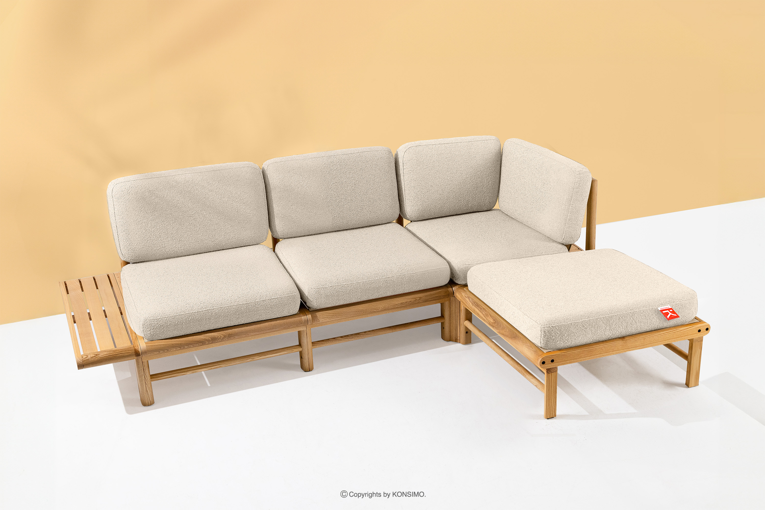 Drevený záhradný roh krémový/prírodný jaseň pravý je jedinečný výrobok, ktorý ozdobí váš priestor. Sedáky a operadlá sú vyplnené vysokokvalitnou PU penou pre jedinečné pohodlie. Poťahová látka obsahujúca 93 % recyklovaného polypropylénu a 7 % polyesteru je nielen šetrná k životnému prostrediu, ale aj jednoduchá na údržbu - stačí ju utrieť vlhkou handričkou.