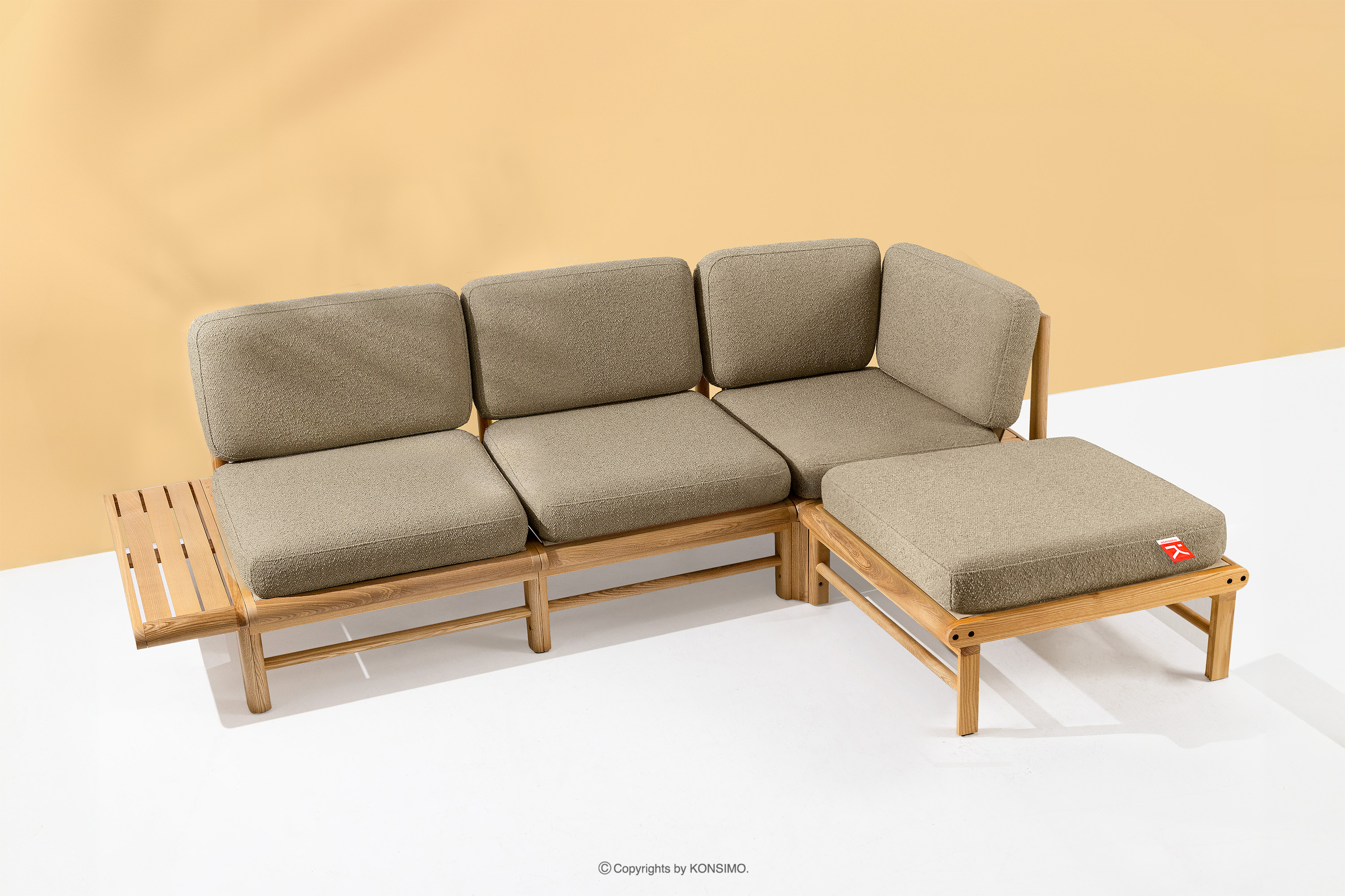 Drevený záhradný roh béžový/prírodný jaseň pravý je jedinečný výrobok, ktorý ozdobí váš priestor. Sedáky a operadlá sú vyplnené kvalitnou PU penou pre jedinečné pohodlie. Poťahová látka obsahujúca 93 % recyklovaného polypropylénu a 7 % polyesteru je nielen šetrná k životnému prostrediu, ale aj jednoduchá na údržbu - stačí ju utrieť vlhkou handričkou.