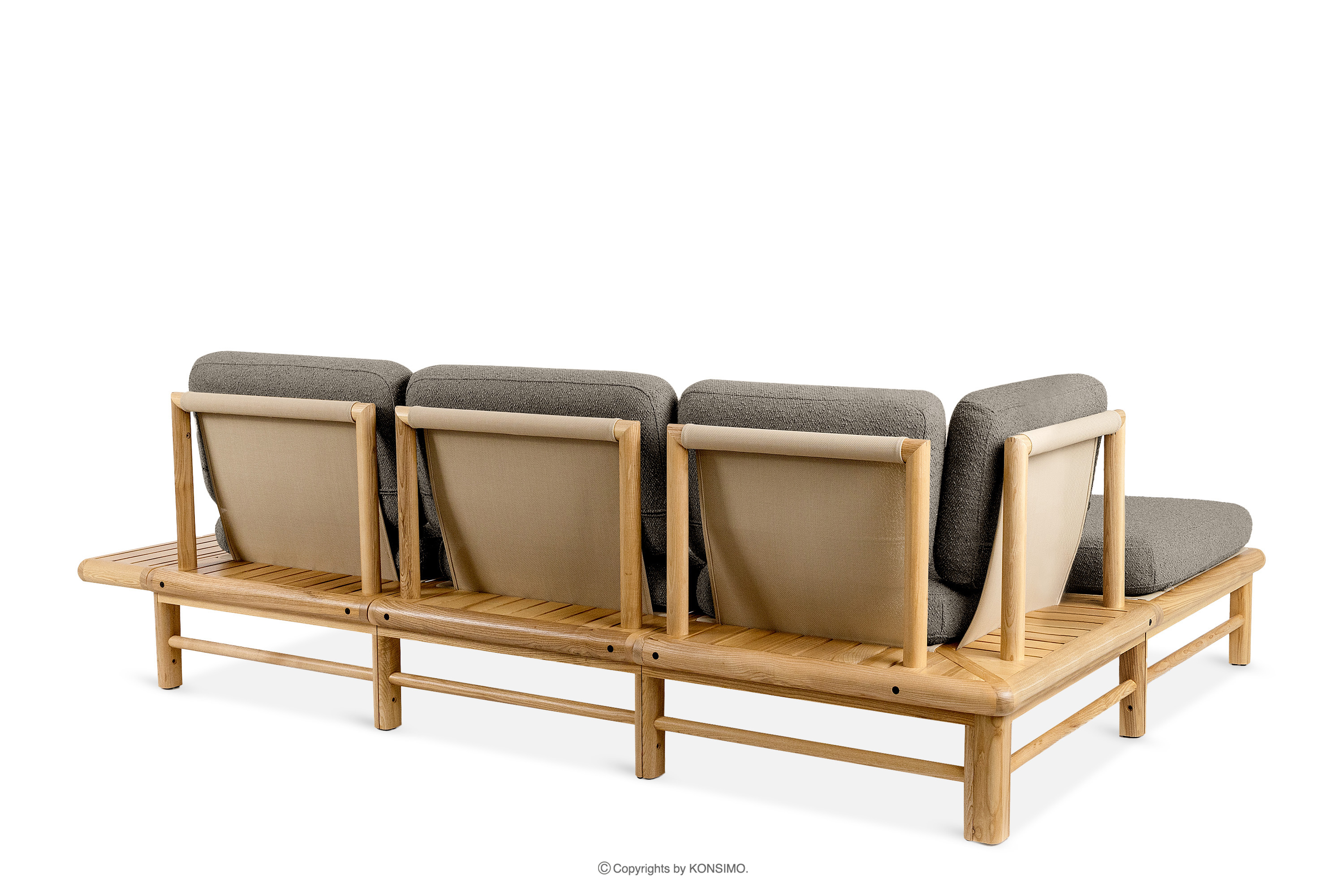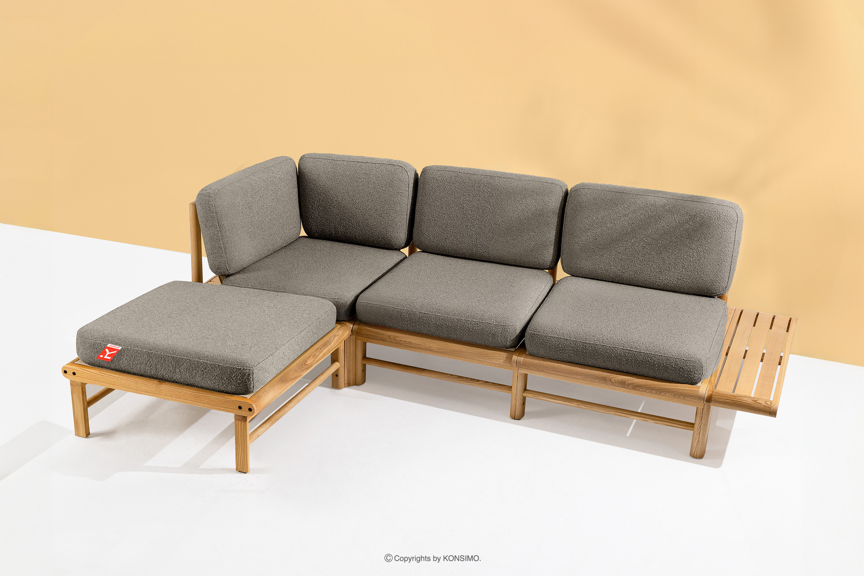 Drevený záhradný roh sivý/prírodný jaseň ľavý je jedinečný výrobok, ktorý ozdobí váš priestor. Sedáky a operadlá sú vyplnené kvalitnou PU penou pre jedinečné pohodlie. Poťahová látka obsahujúca 93 % recyklovaného polypropylénu a 7 % polyesteru je nielen šetrná k životnému prostrediu, ale aj jednoduchá na údržbu - stačí ju utrieť vlhkou handričkou.