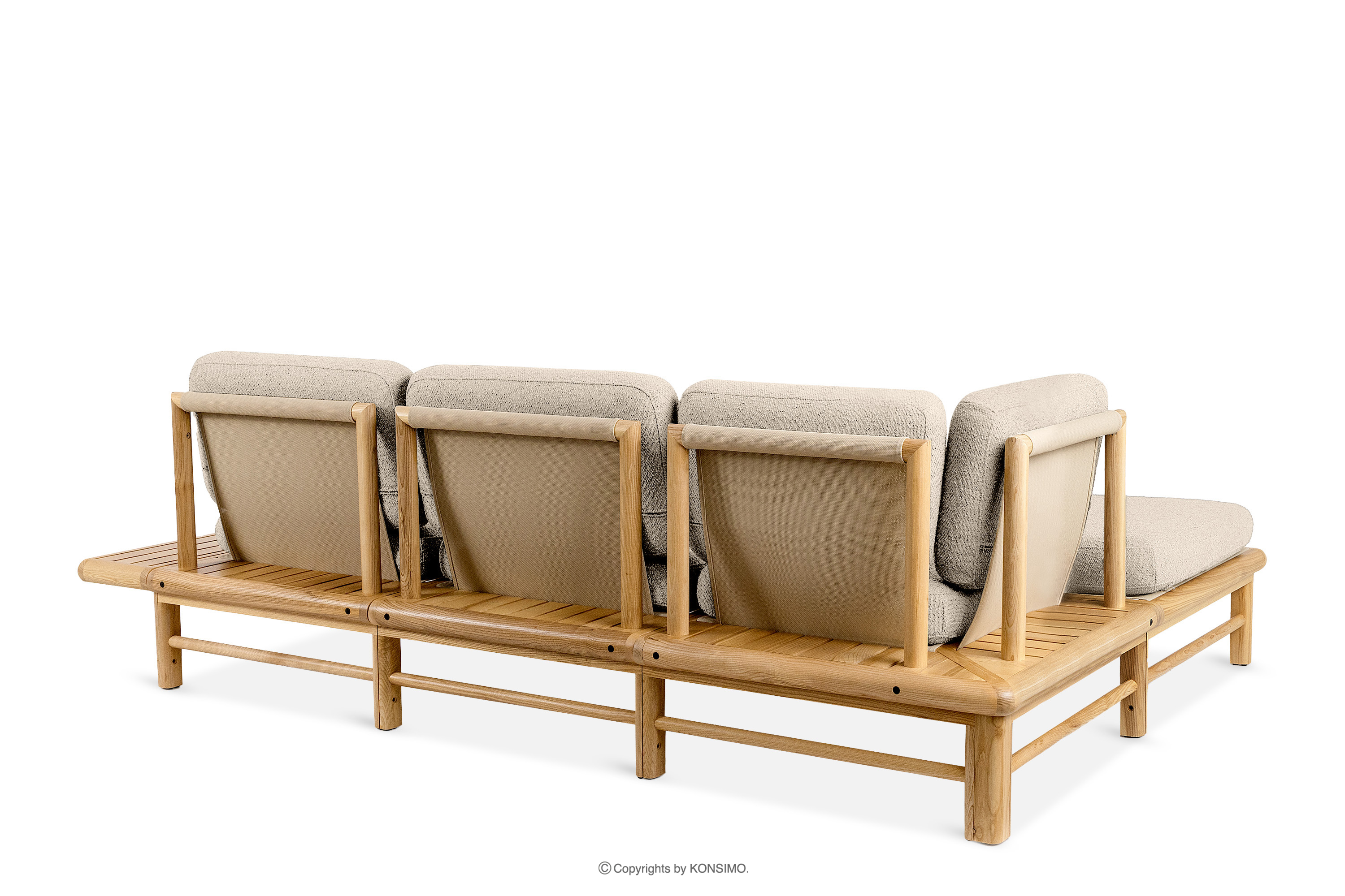 Drevený záhradný roh krémový/prírodný jaseň ľavý je jedinečný výrobok, ktorý ozdobí váš priestor. Sedáky a operadlá sú vyplnené kvalitnou PU penou pre jedinečné pohodlie. Poťahová látka obsahujúca 93 % recyklovaného polypropylénu a 7 % polyesteru je nielen šetrná k životnému prostrediu, ale aj jednoduchá na údržbu - stačí ju utrieť vlhkou handričkou.