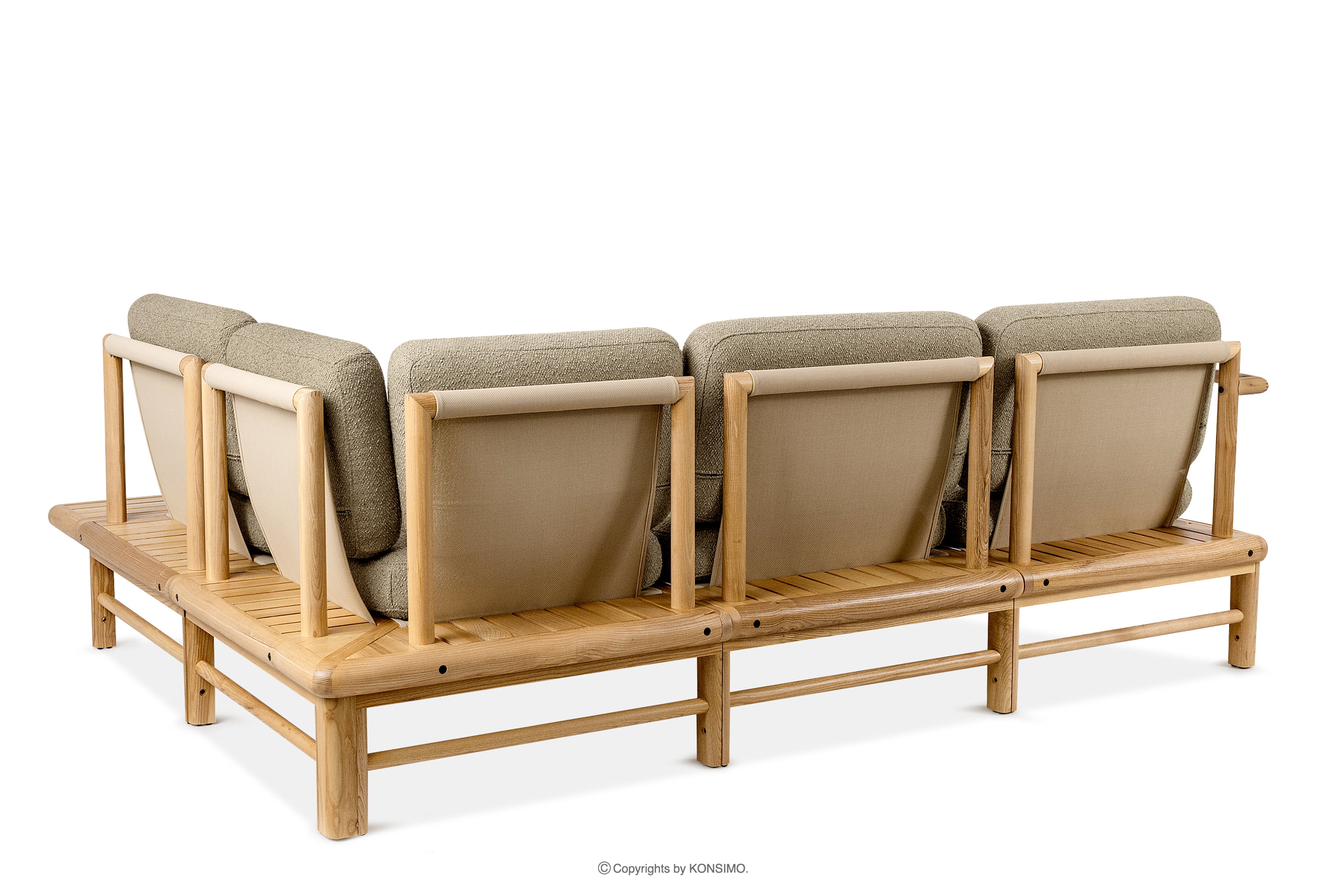 Drevený záhradný roh v boho štýle pravý béžový je jedinečný výrobok, ktorý ozdobí váš priestor. Sedáky a operadlá sú vyplnené kvalitnou PU penou pre jedinečné pohodlie. Poťahová látka obsahujúca 93 % recyklovaného polypropylénu a 7 % polyesteru je nielen šetrná k životnému prostrediu, ale aj jednoduchá na údržbu - stačí ju utrieť vlhkou handričkou.