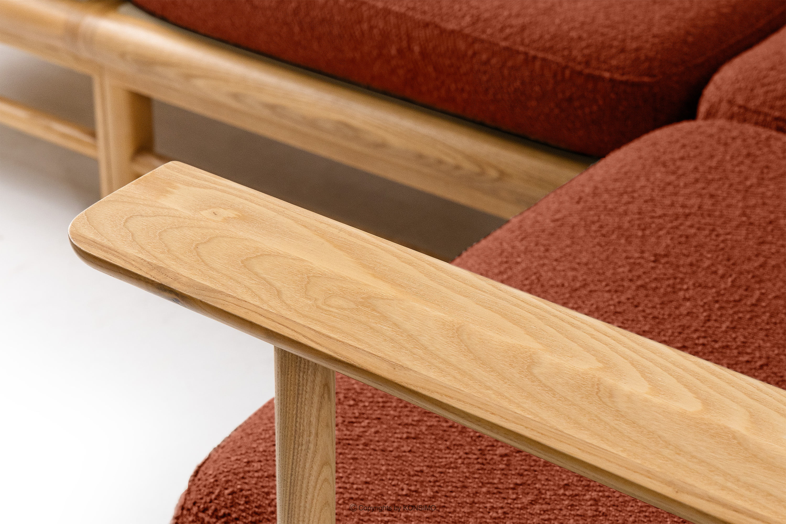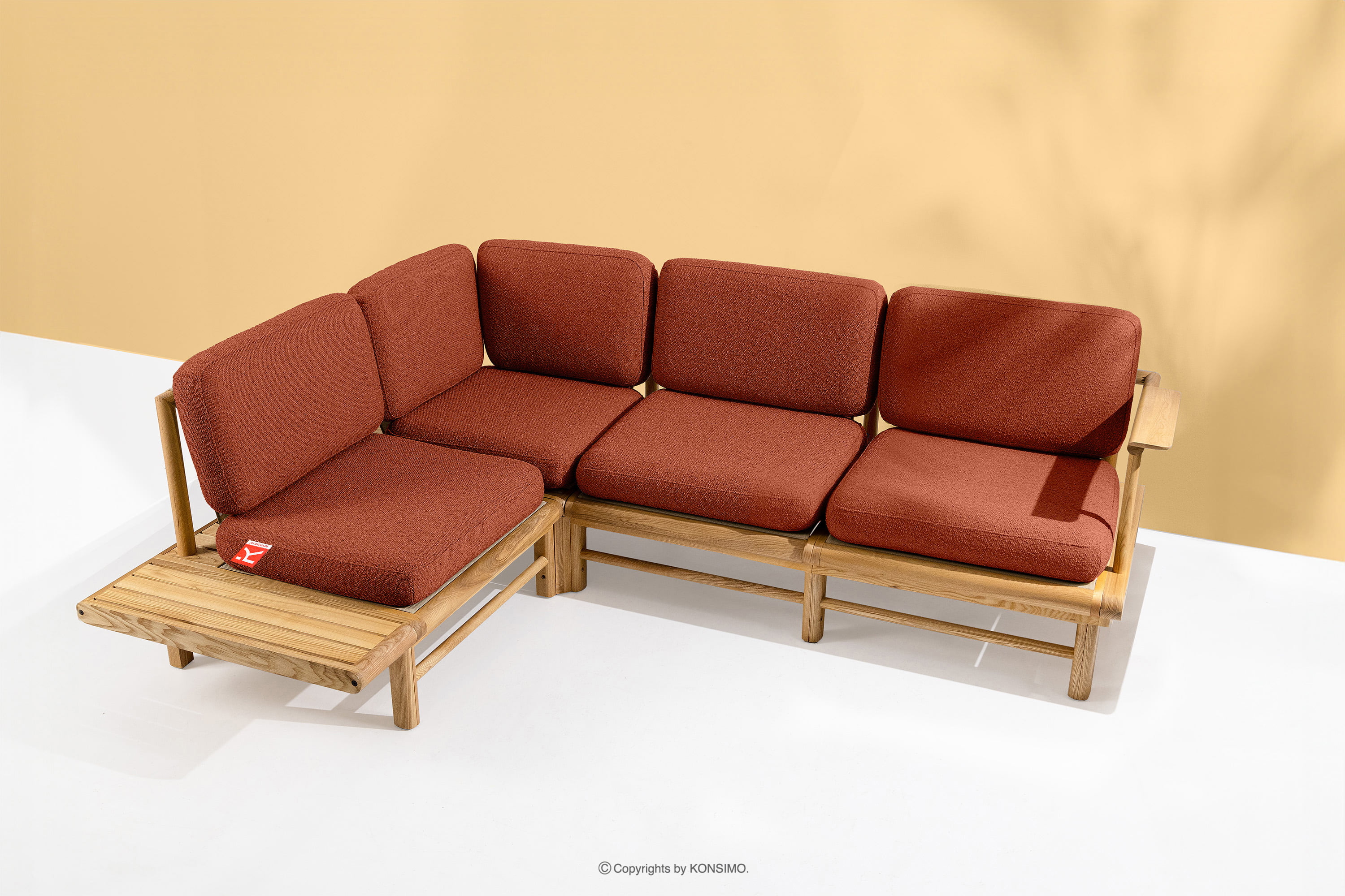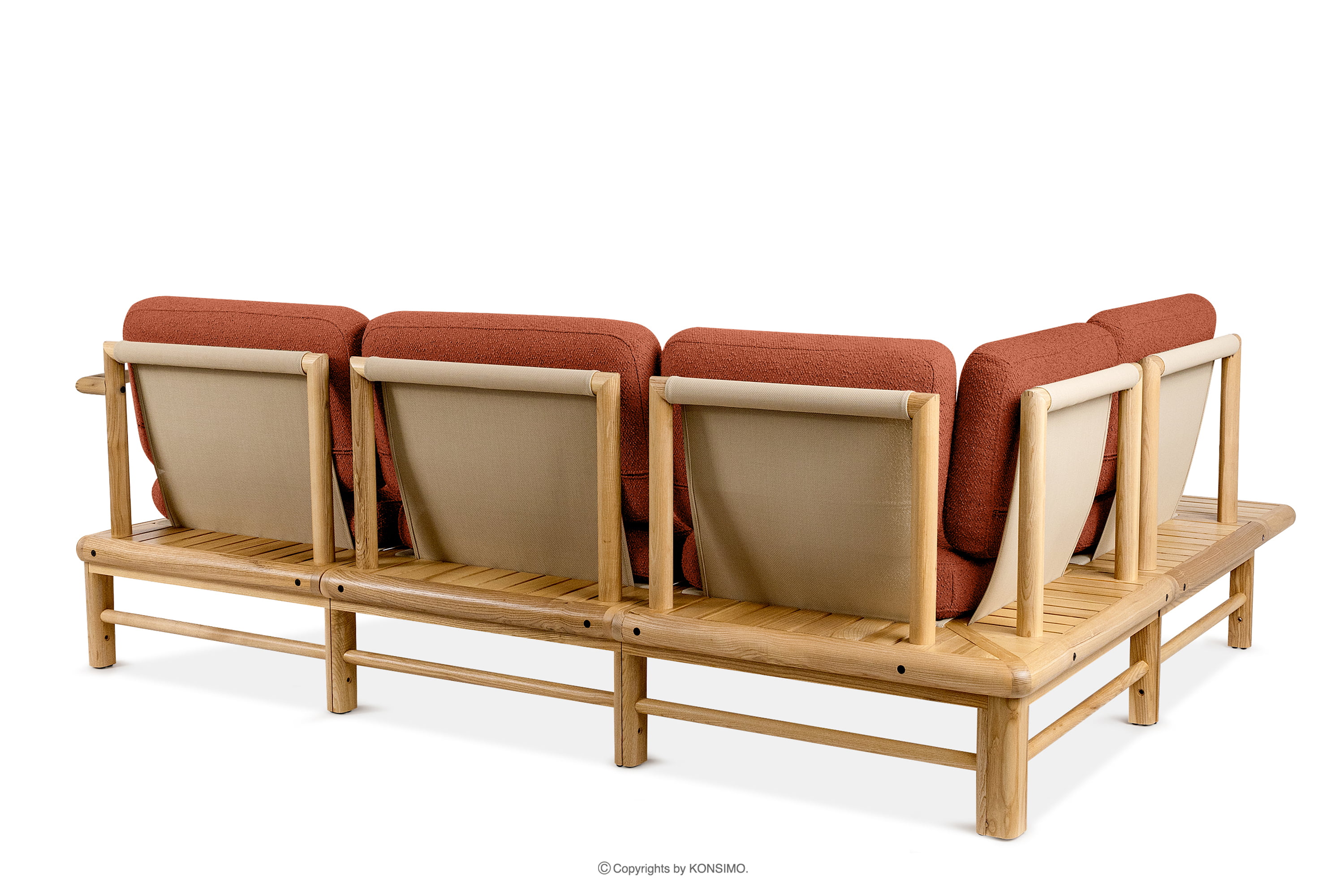 Drevený záhradný roh v boho štýle ľavý oranžový je jedinečný výrobok, ktorý ozdobí váš priestor. Sedáky a operadlá sú vyplnené kvalitnou PU penou pre jedinečné pohodlie. Poťahová látka obsahujúca 93 % recyklovaného polypropylénu a 7 % polyesteru je nielen šetrná k životnému prostrediu, ale aj jednoduchá na údržbu - stačí ju utrieť vlhkou handričkou.