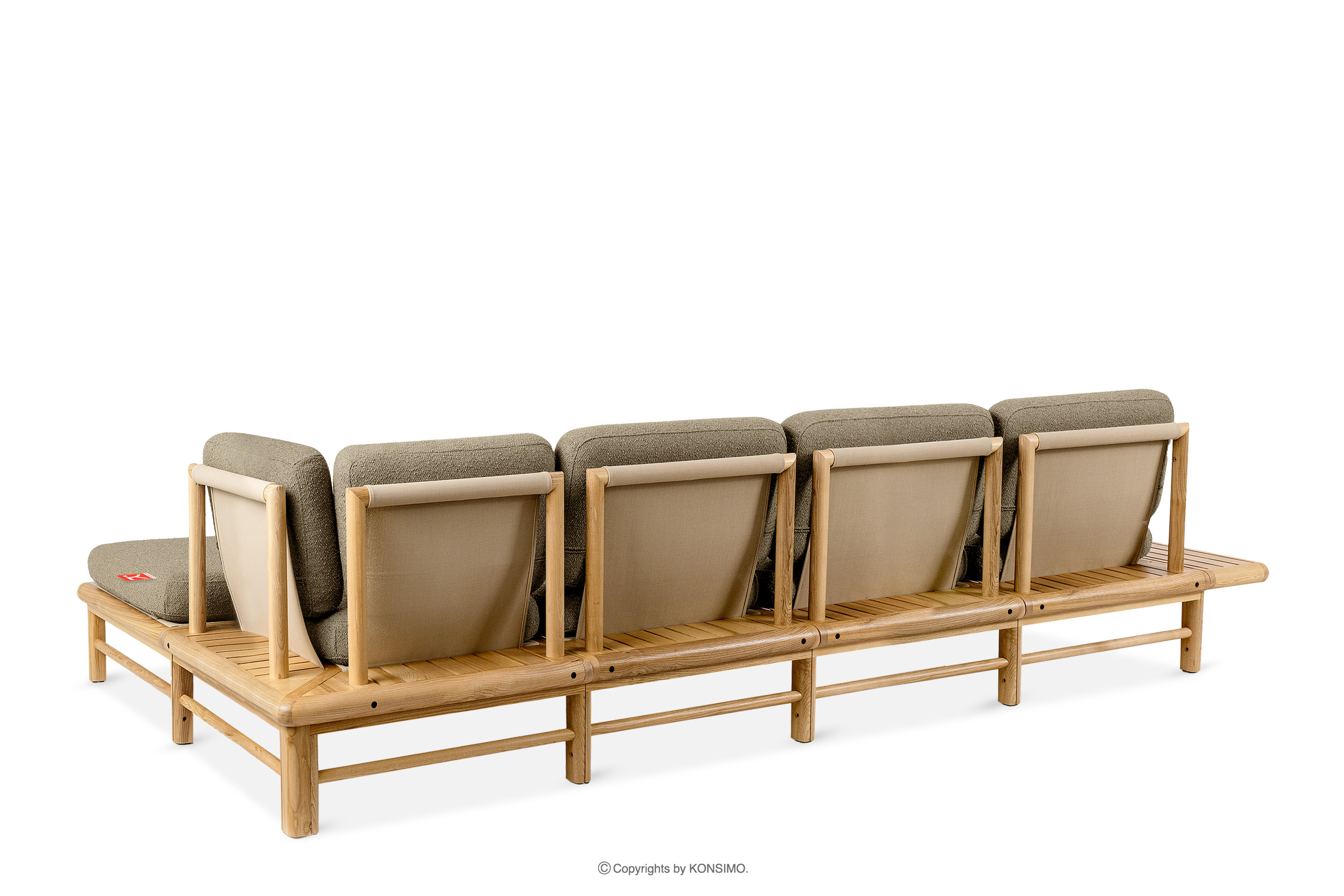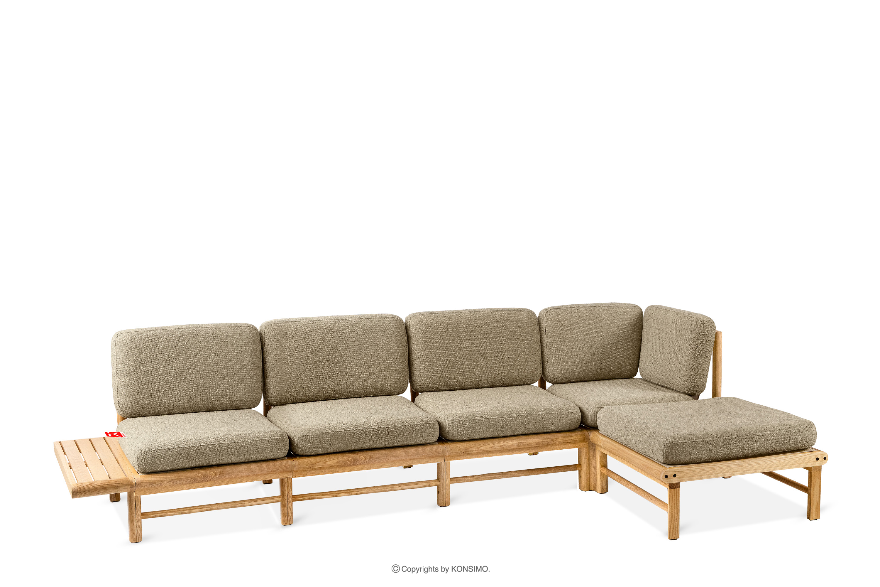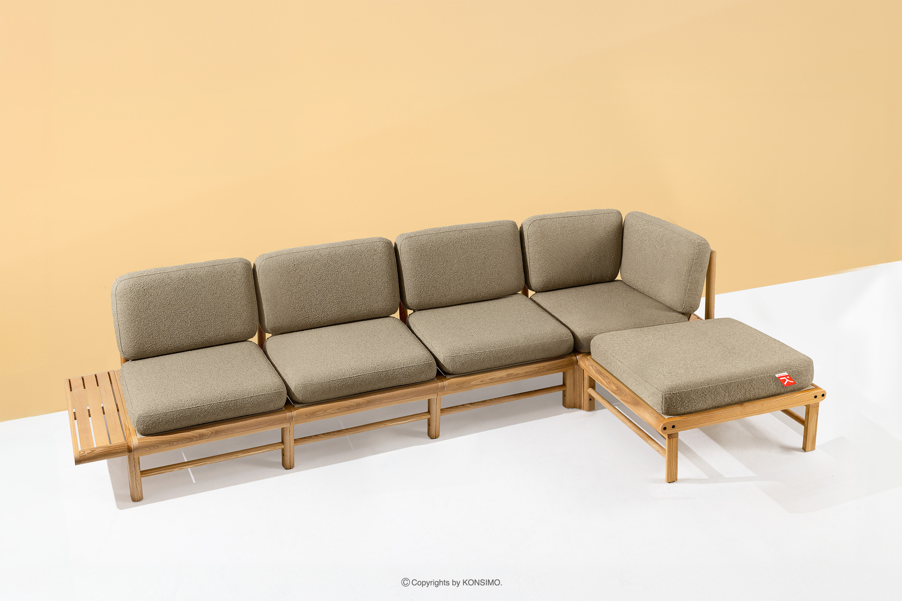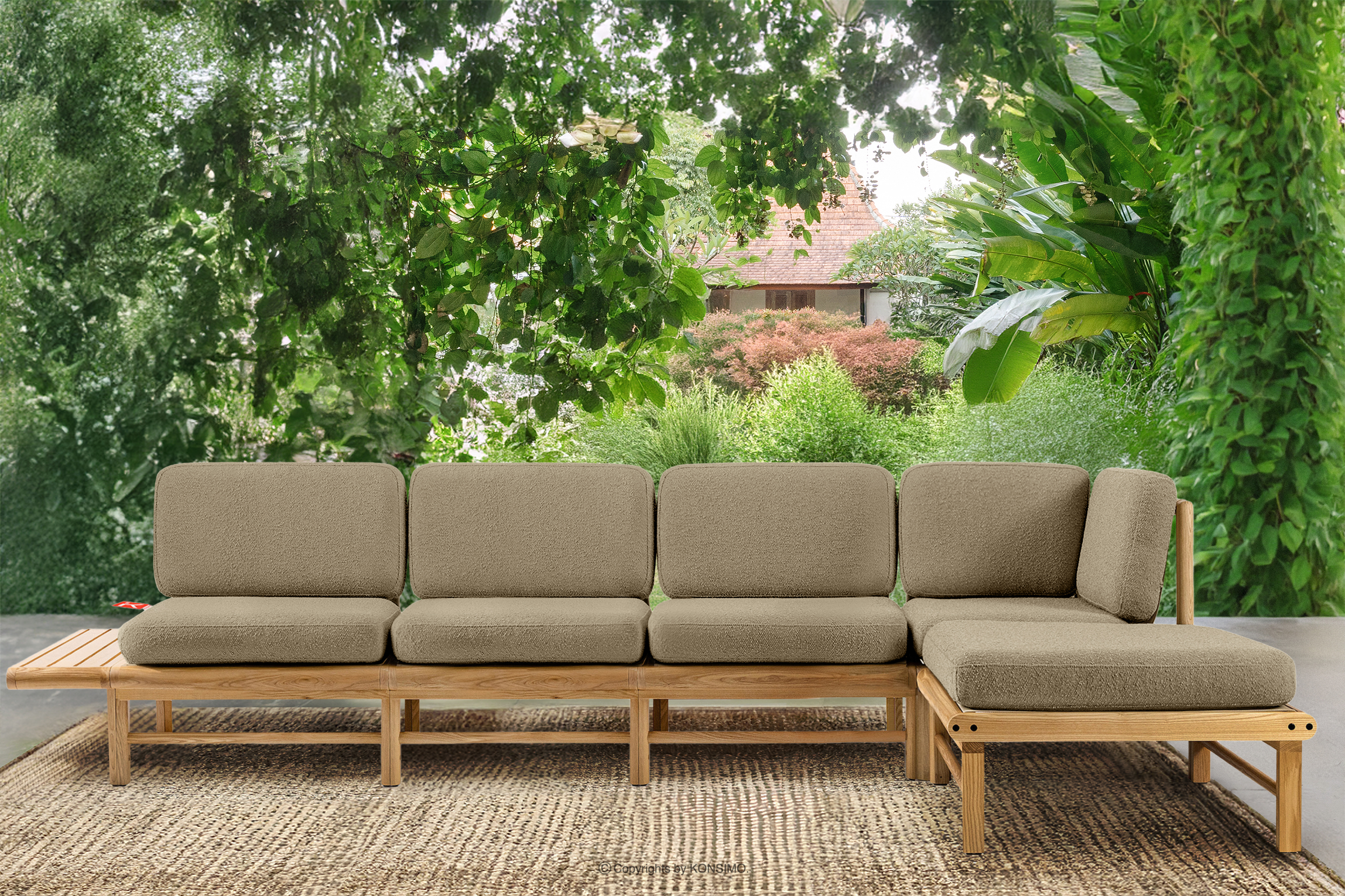 Záhradný roh z masívneho jaseňového dreva béžovej farby vpravo je jedinečný výrobok, ktorý ozdobí váš priestor. Sedáky a operadlá sú vyplnené kvalitnou PU penou pre jedinečné pohodlie. Poťahová látka obsahujúca 93 % recyklovaného polypropylénu a 7 % polyesteru je nielen šetrná k životnému prostrediu, ale aj jednoduchá na údržbu - stačí ju utrieť vlhkou handričkou.