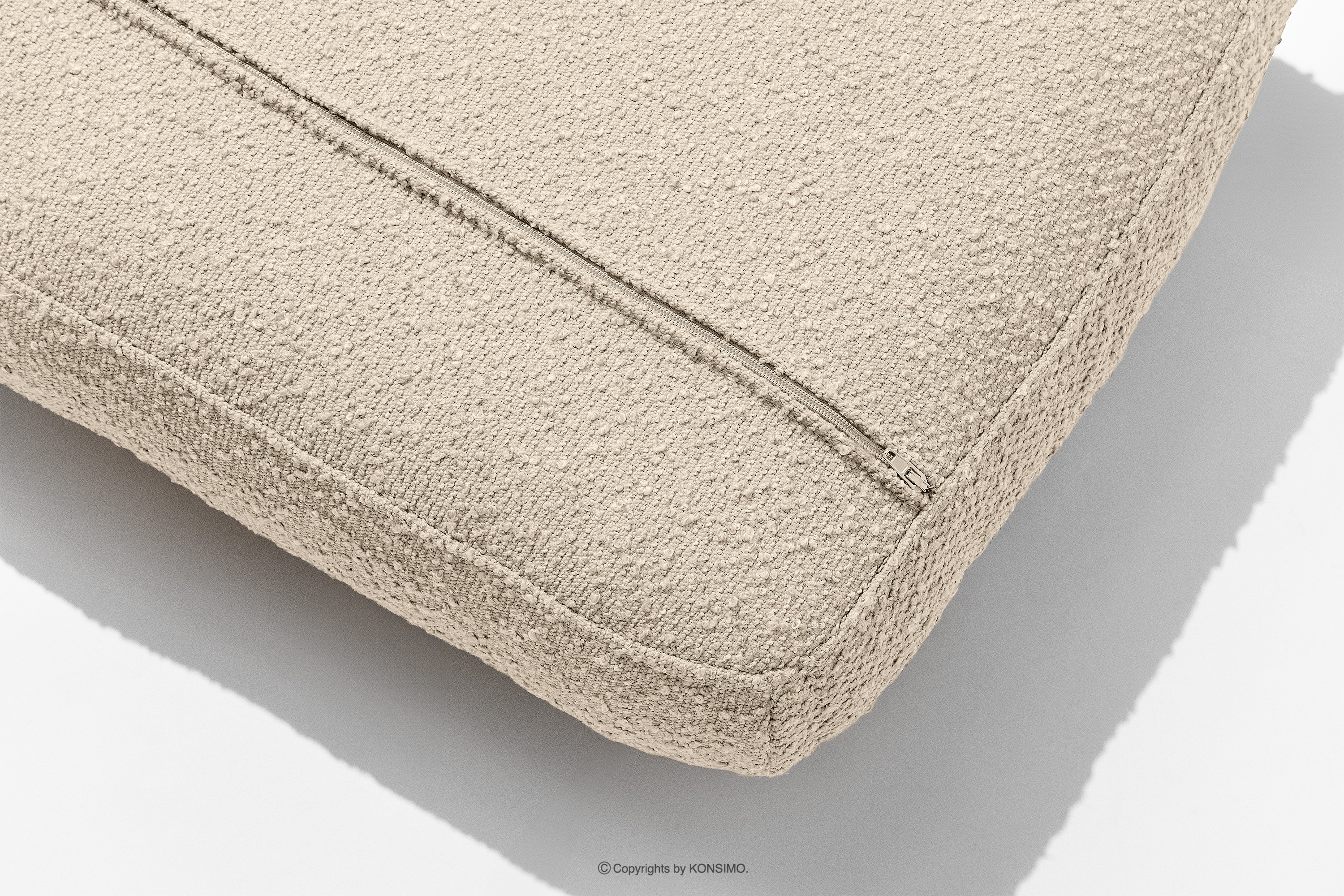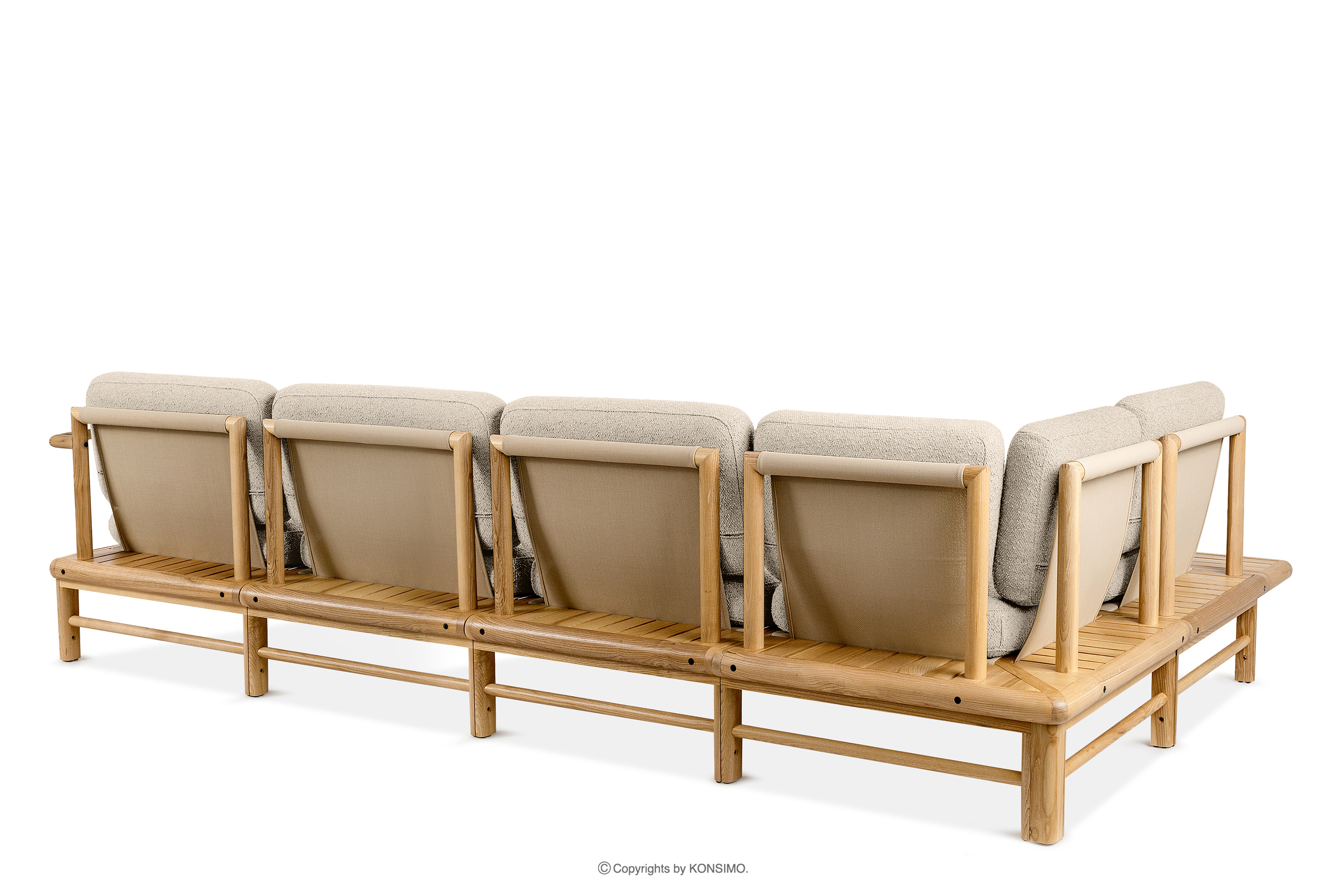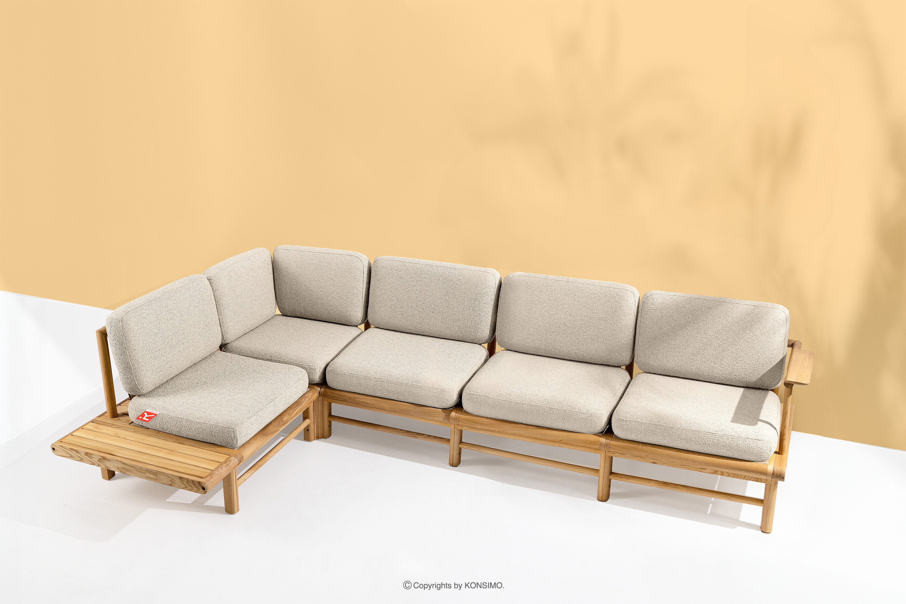 Krémový záhradný roh z masívneho dreva v štýle boho vľavo je jedinečný výrobok, ktorý ozdobí váš priestor. Sedáky a operadlá sú vyplnené kvalitnou PU penou pre jedinečné pohodlie. Poťahová látka obsahujúca 93 % recyklovaného polypropylénu a 7 % polyesteru je nielen šetrná k životnému prostrediu, ale aj jednoduchá na údržbu - stačí ju utrieť vlhkou handričkou.