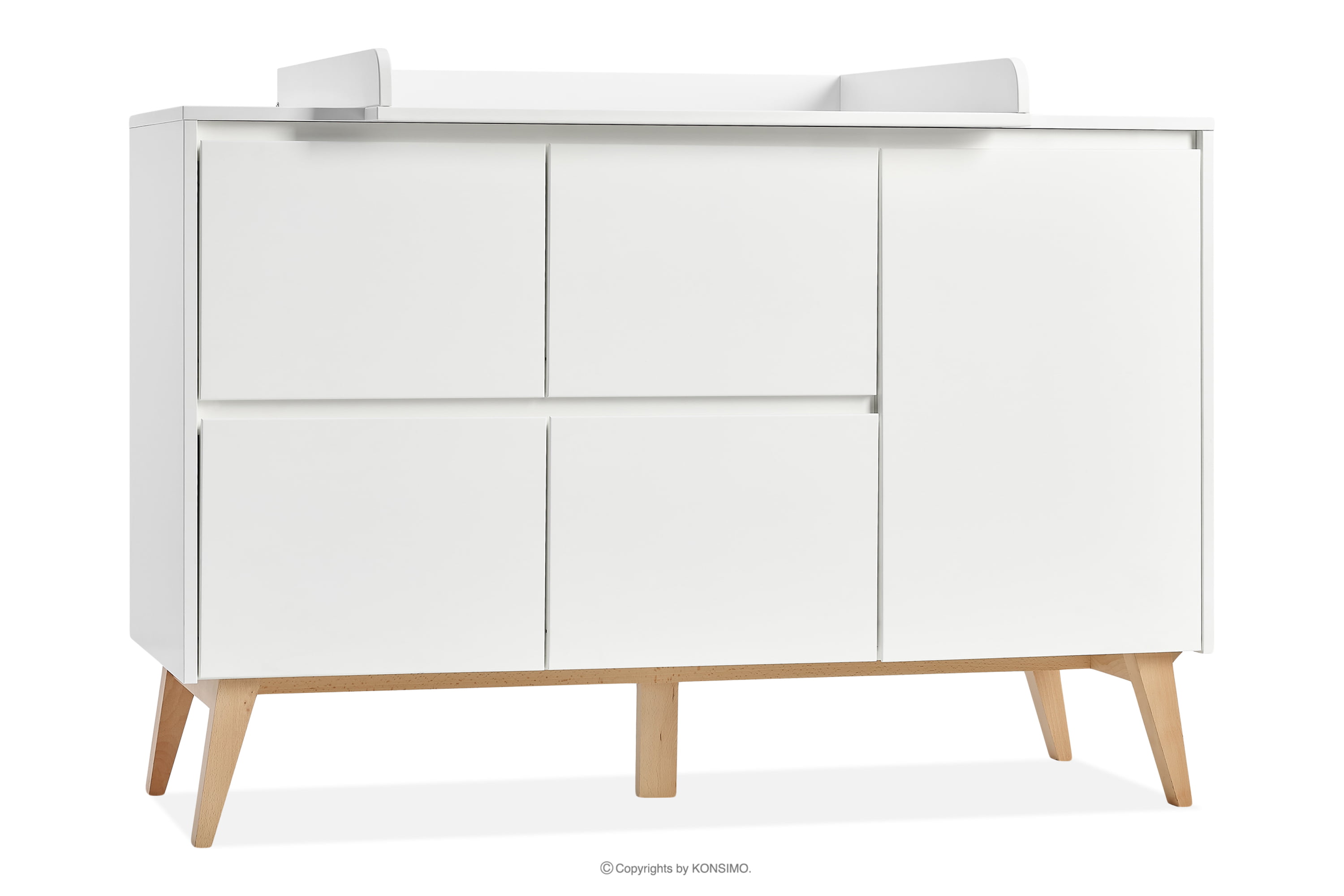 Komoda stojí na vysokých nohách z masívneho bukového dreva, ktoré jej dodávajú ľahký a jemný vzhľad. Tieto nohy sú vyrobené z najkvalitnejších materiálov a zabezpečujú stabilitu a pevnosť celej konštrukcie. Povrch komody bol natretý schválenými farbami, čo zaručuje bezpečné používanie aj pre najmenších členov domácnosti.K komode je možné dokúpiť prebaľovací pult 12865.06.100.