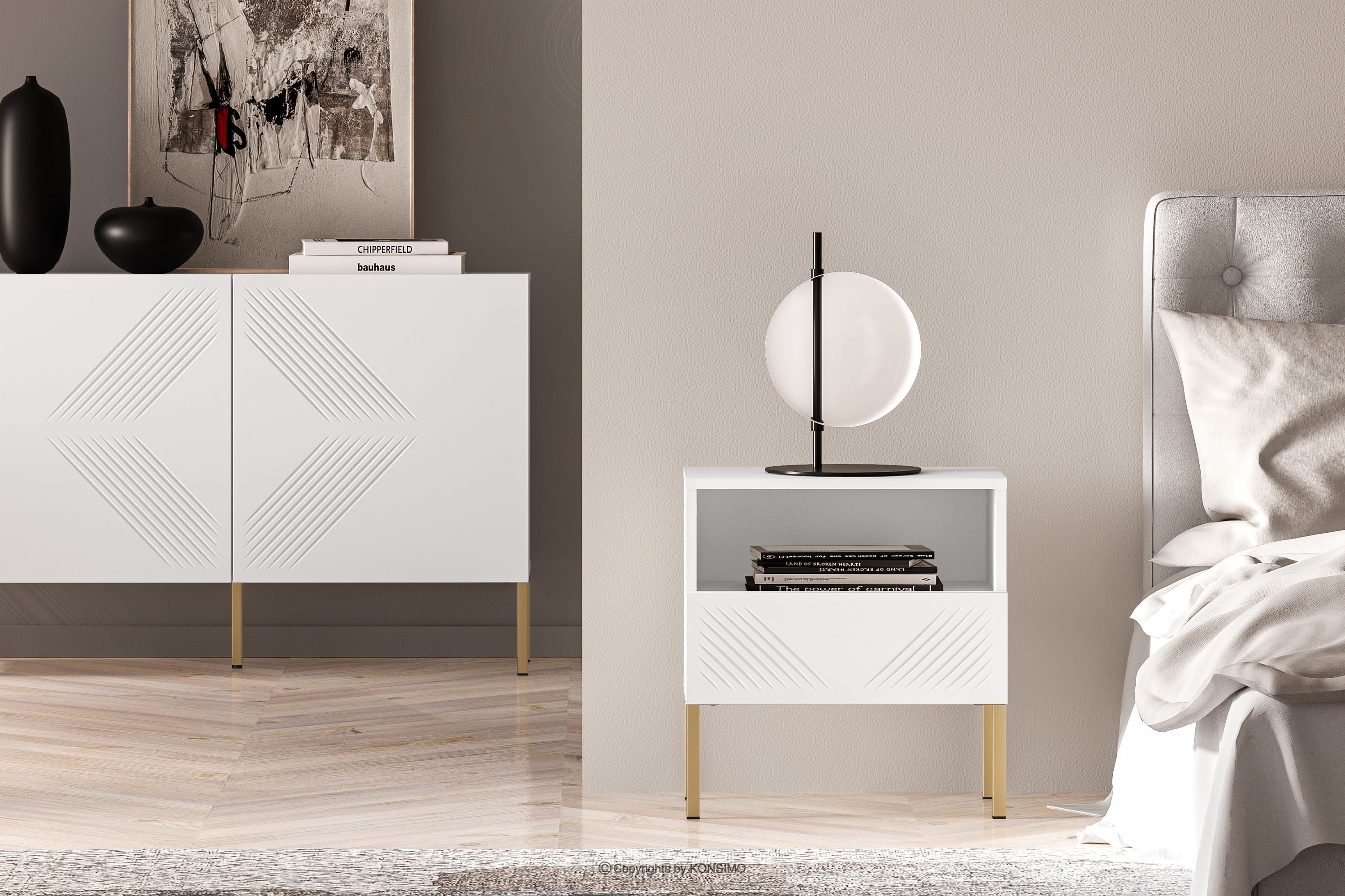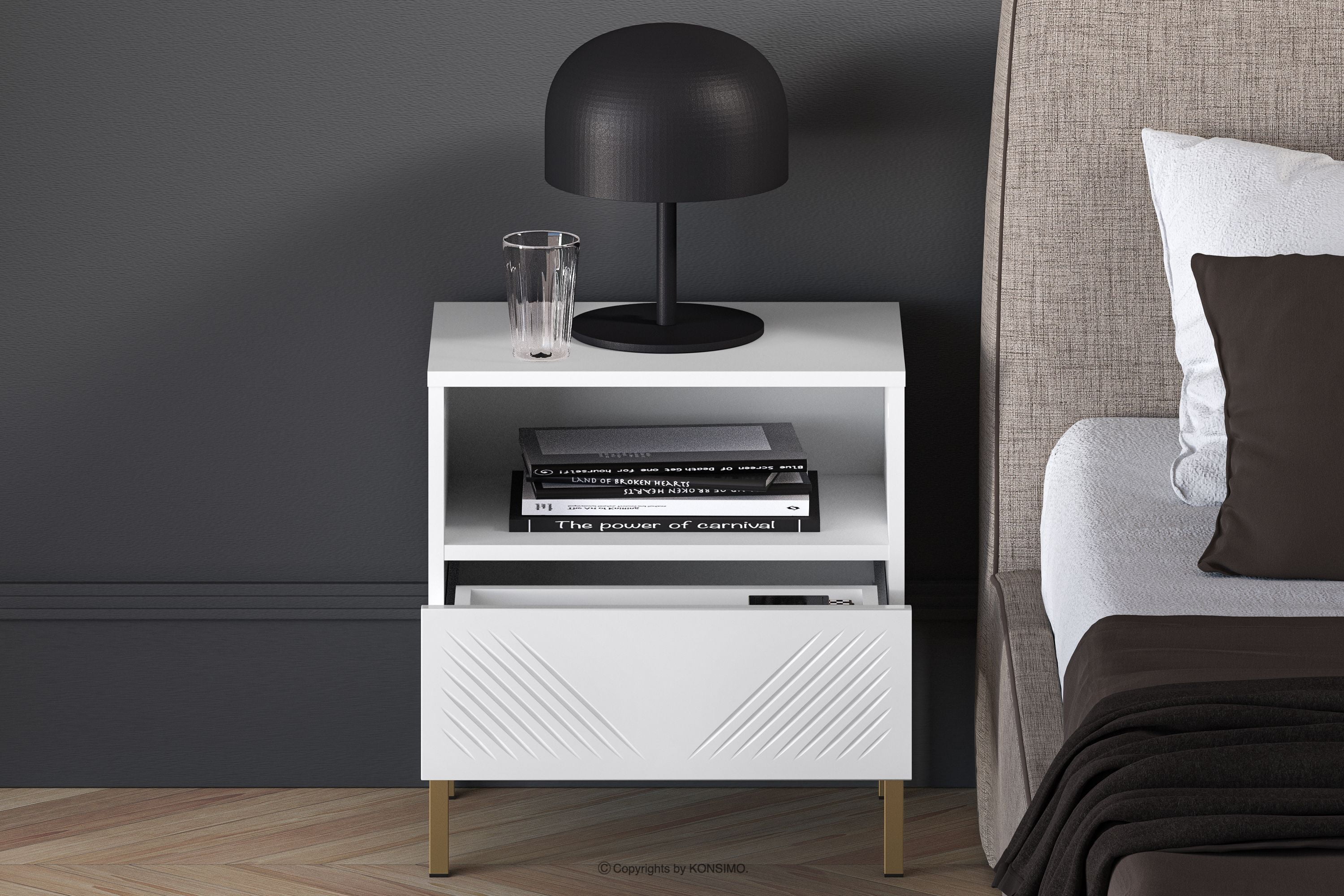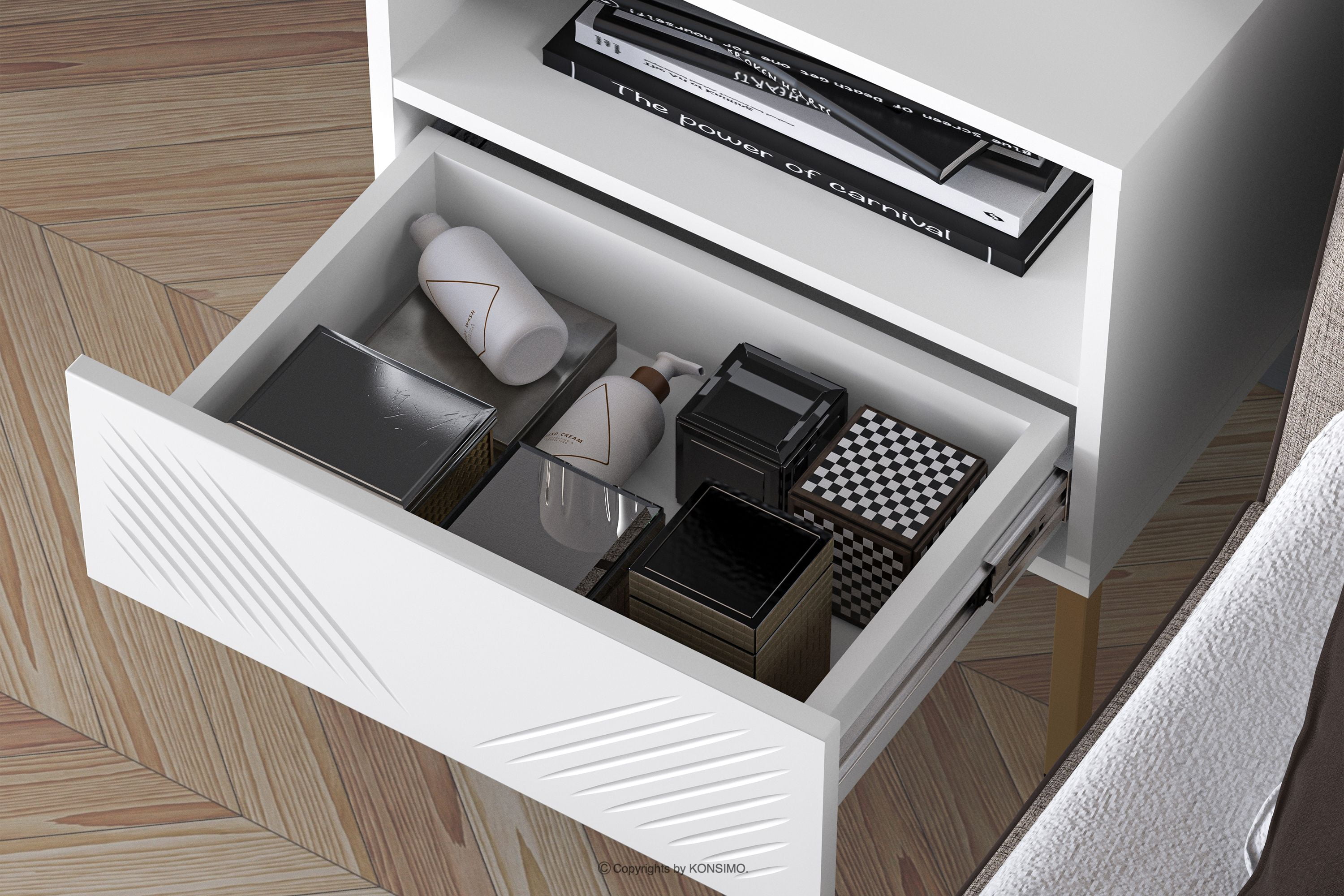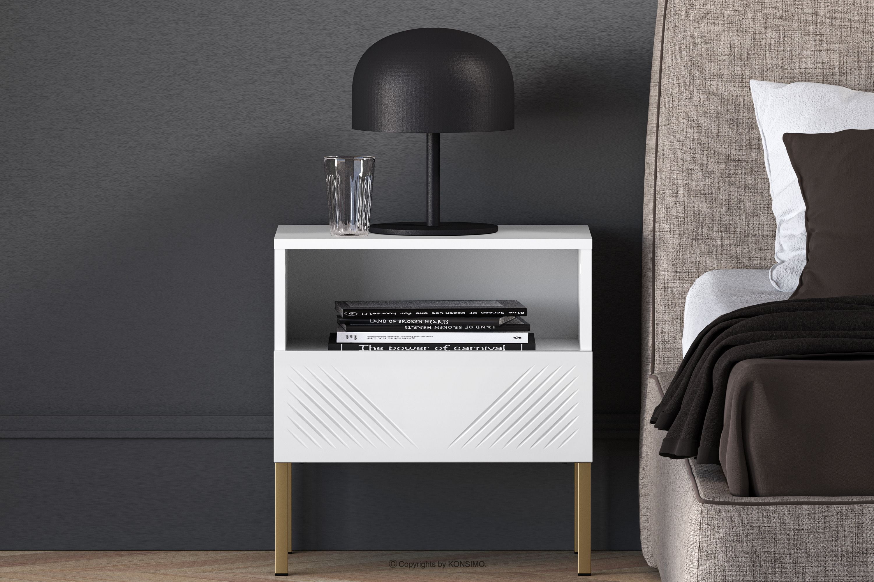 NEBRO Objav celú kolekciu Nočný stolík elegantný na zlatých elegantných nohách- farba biela/zlatá